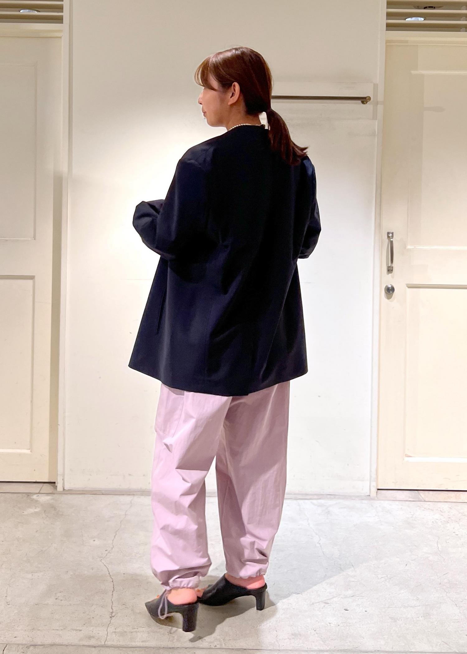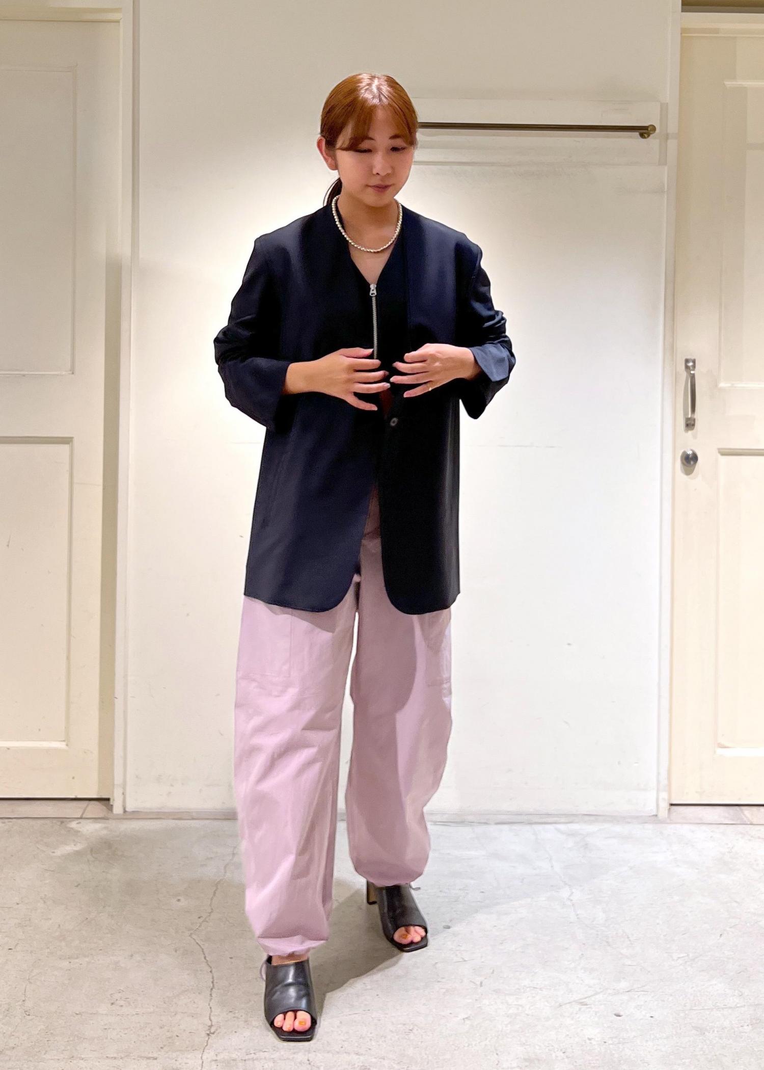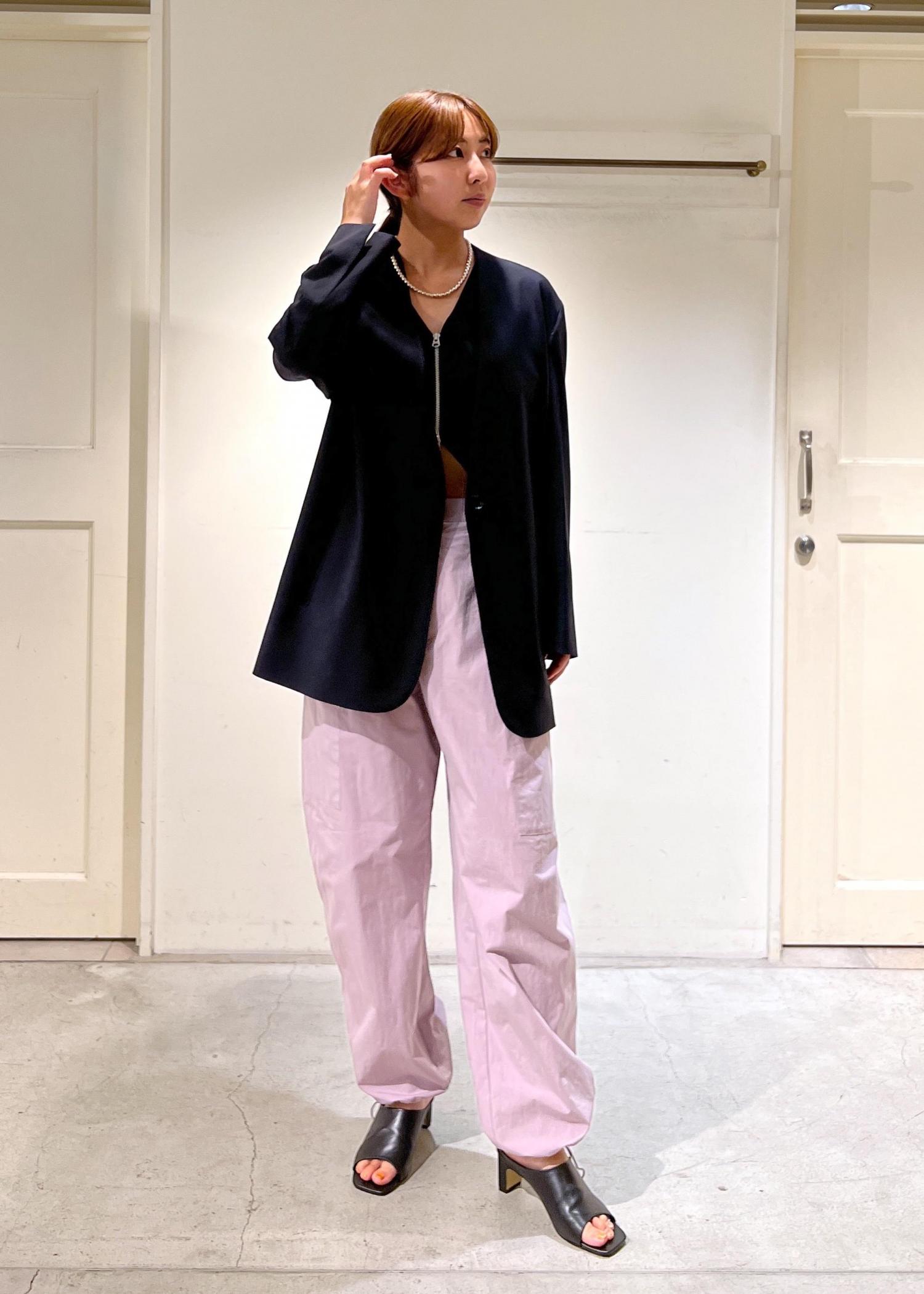 それぞれ別のアイテムと合わせても、セットアップで着用してもかわいいです。モードな雰囲気ですが、あえてカジュアルなアイテムと合わせてみました。