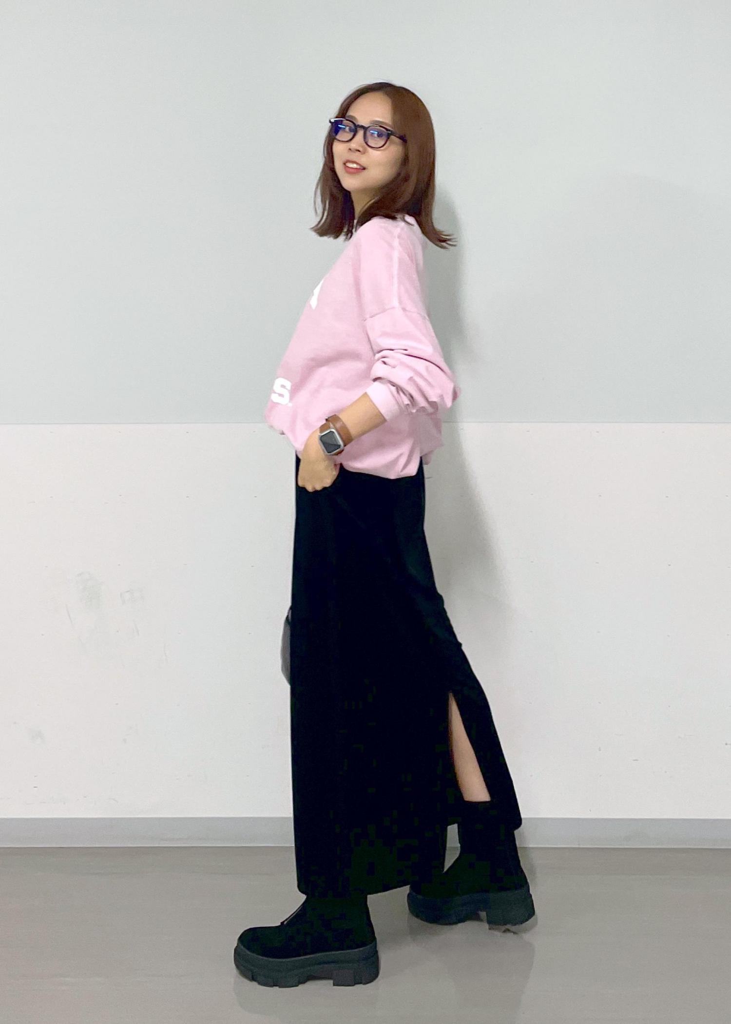 人気のYALEロングTシャツに、タイトスカートとブーツを合わせて、秋の大人カジュアルスタイル!