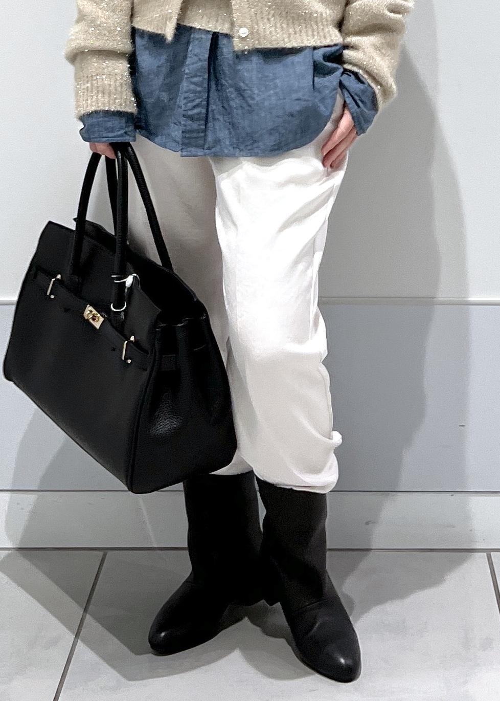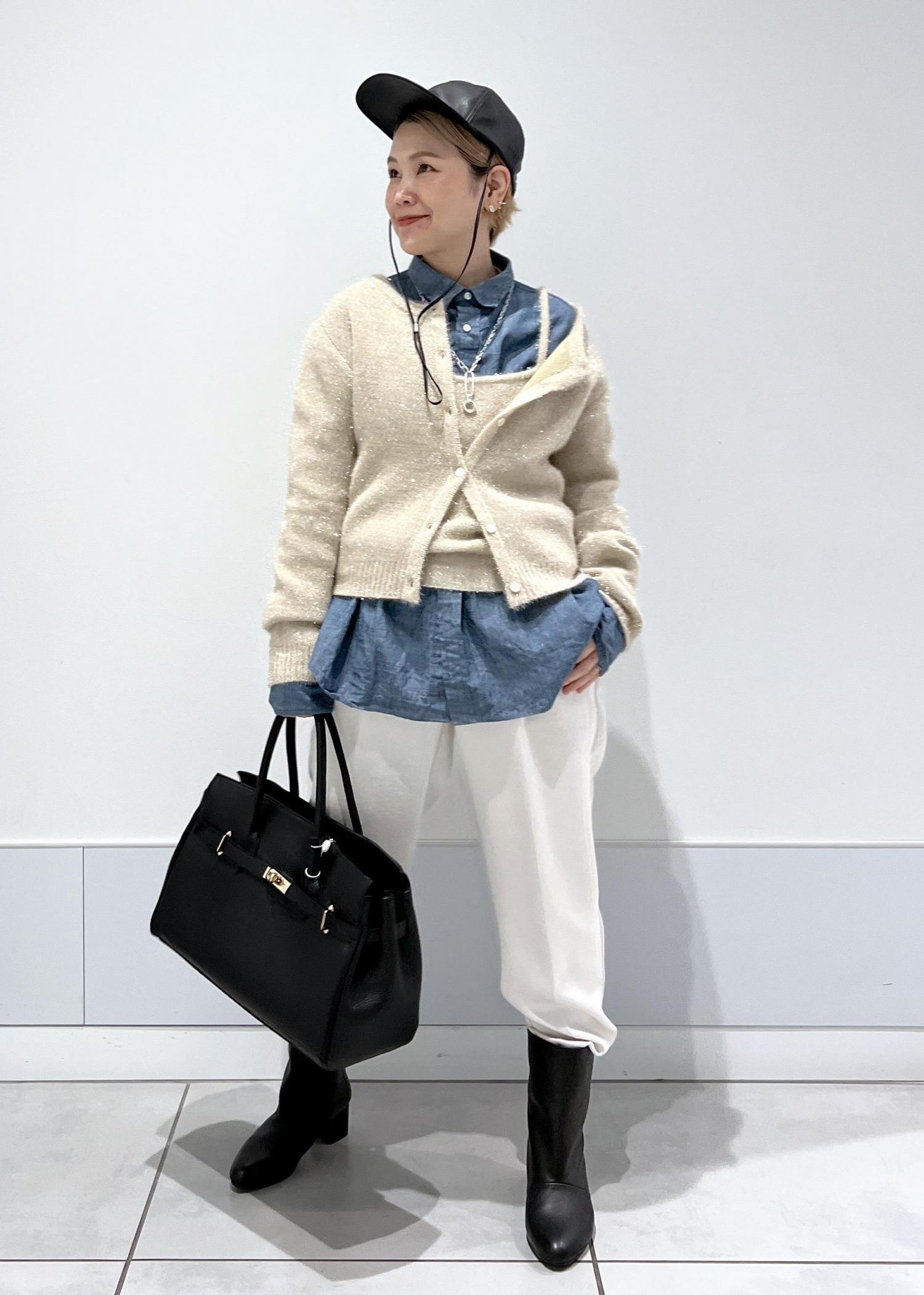 マニッシュなコーデもラメニットの華やかさを加える事で