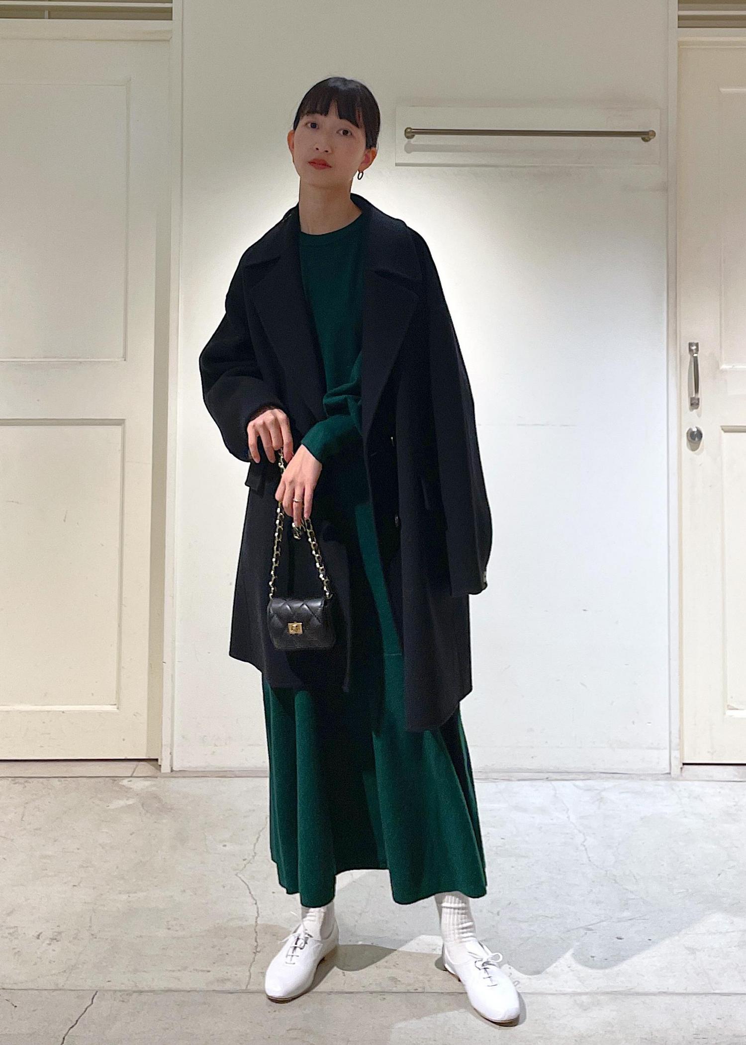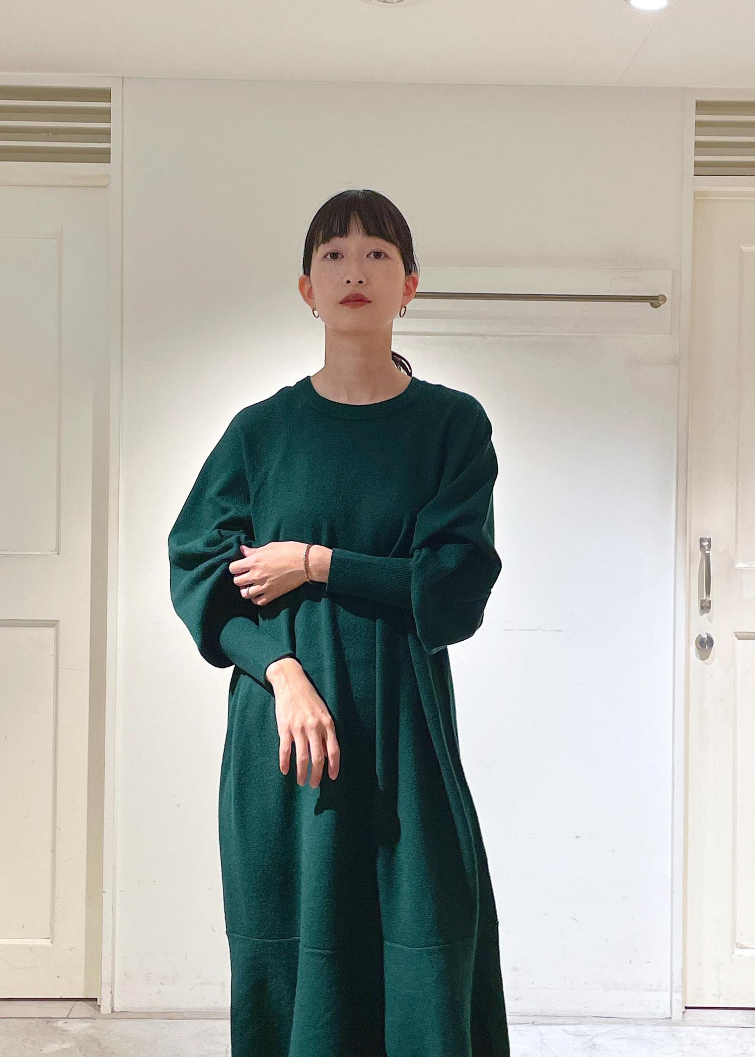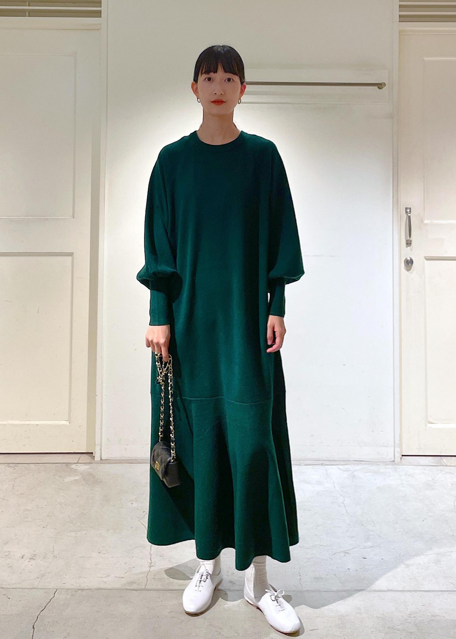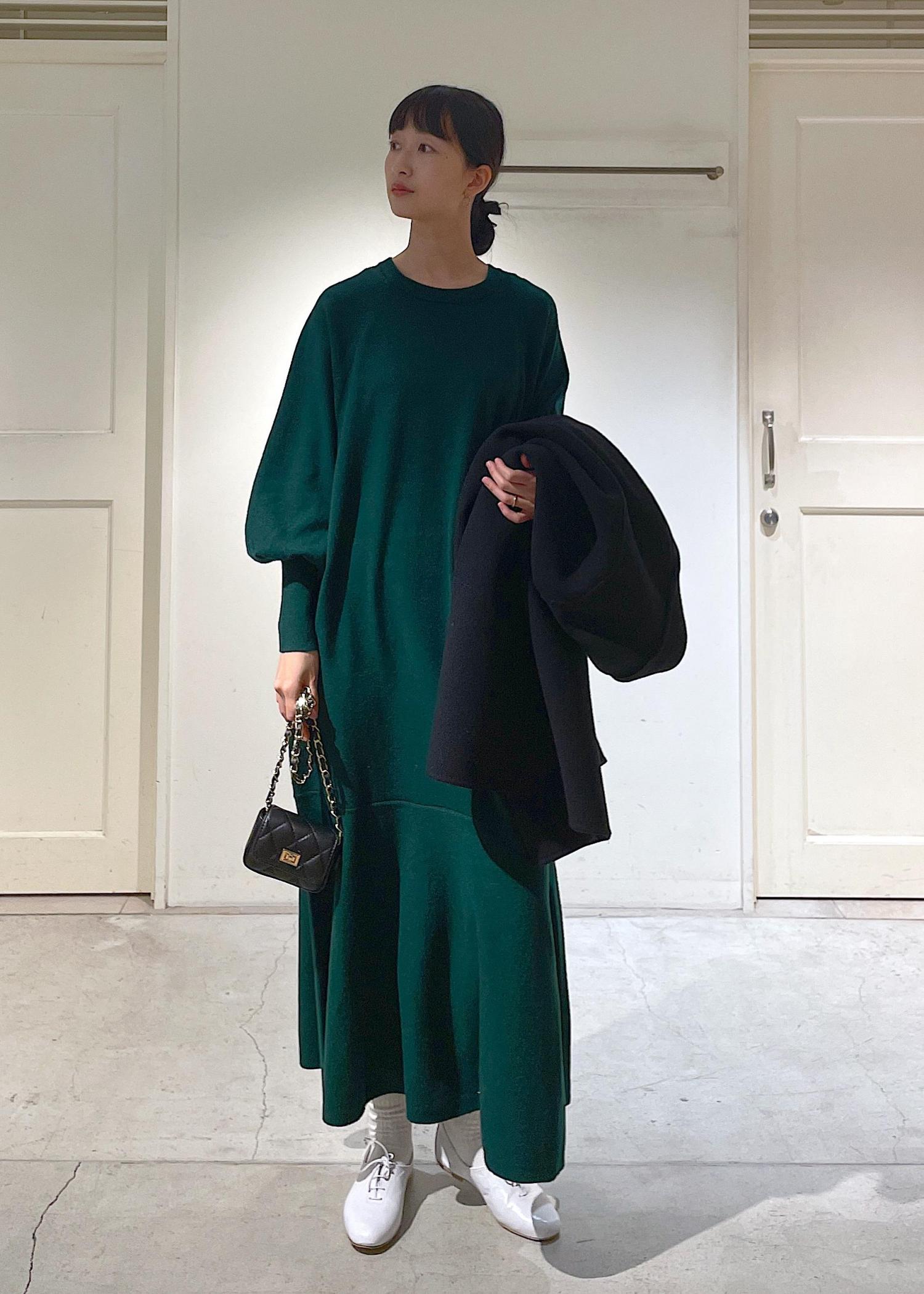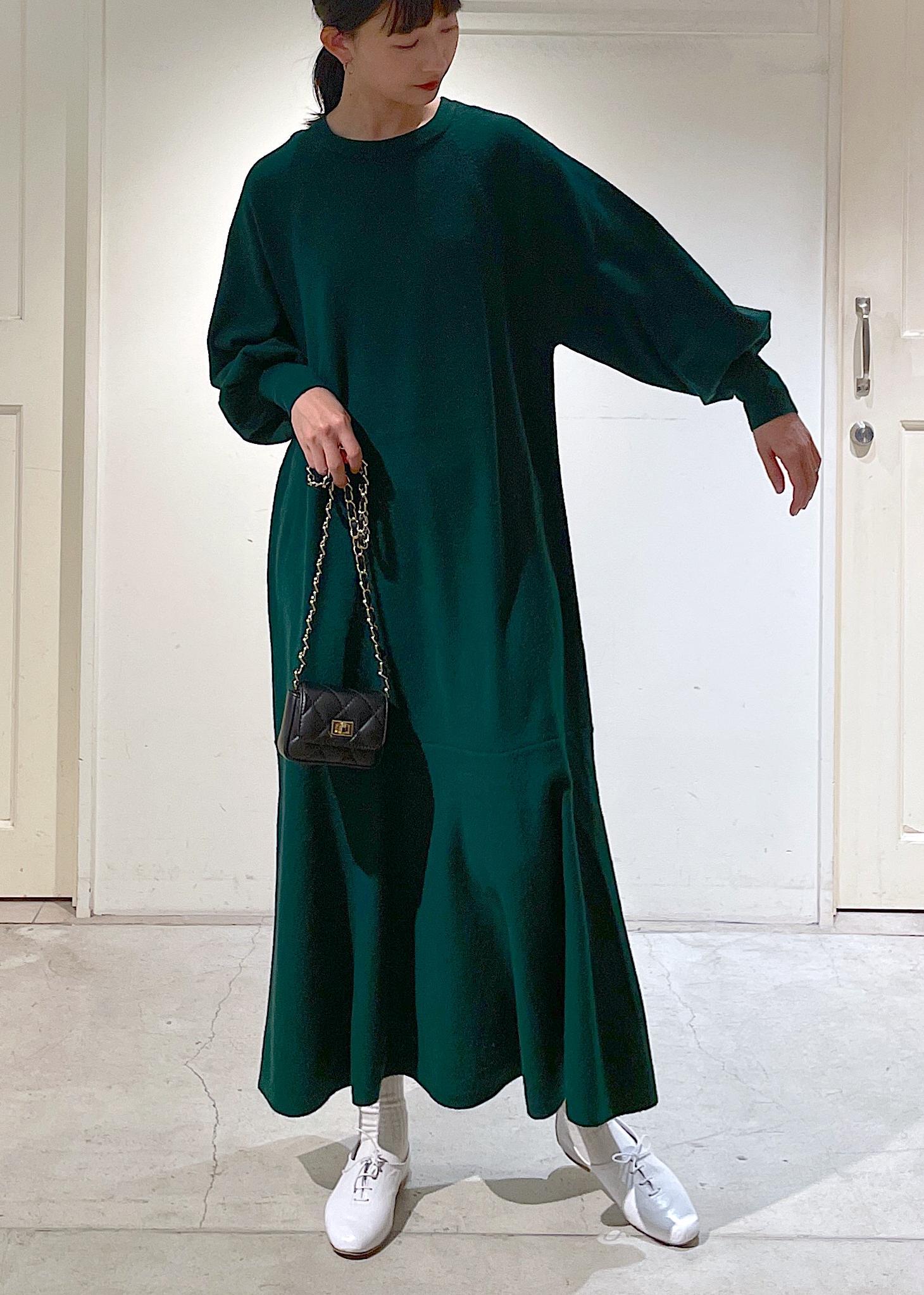 深いグリーンのワンピースは裾がマーメイドのような形で可愛いです♡一枚で着映えします。