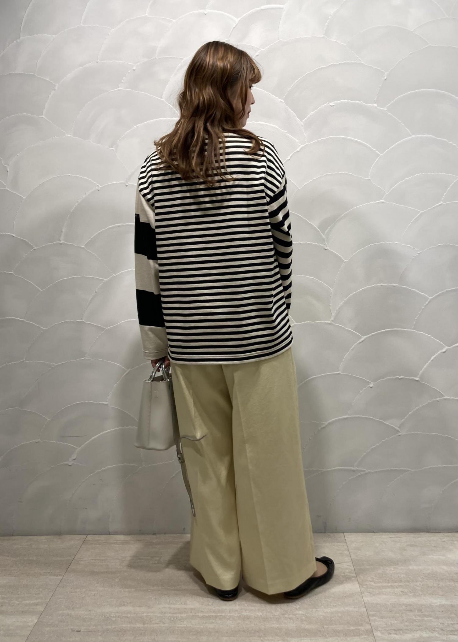ボーダーのカットソーはスタイリングがワンパターンになりがちですが、ボトムスに色を持ってくると新鮮な雰囲気になるのでおすすめです!