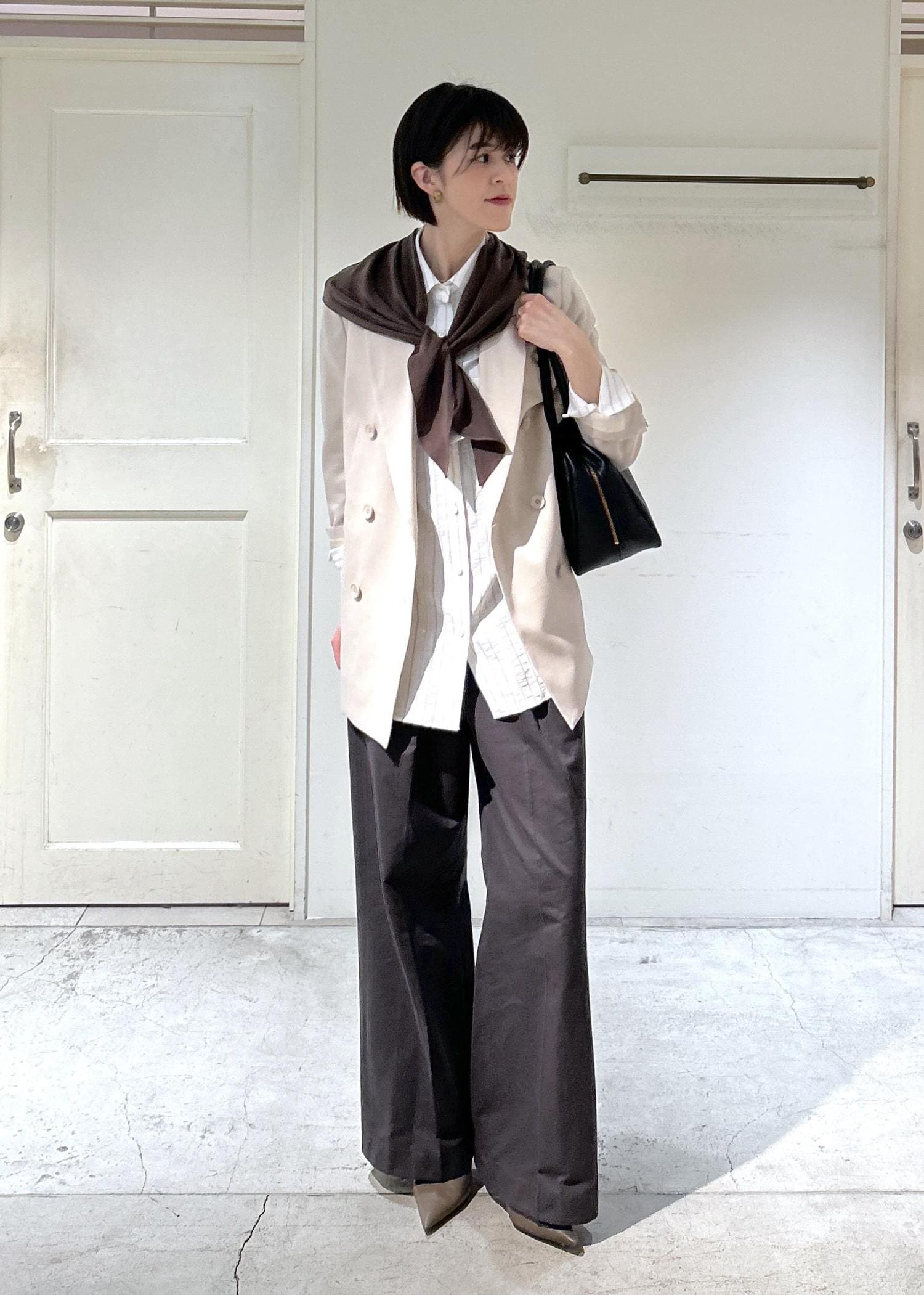 今回は綺麗目のバッグや襟、シューズを使ってカジュアルさを抑えてみました。