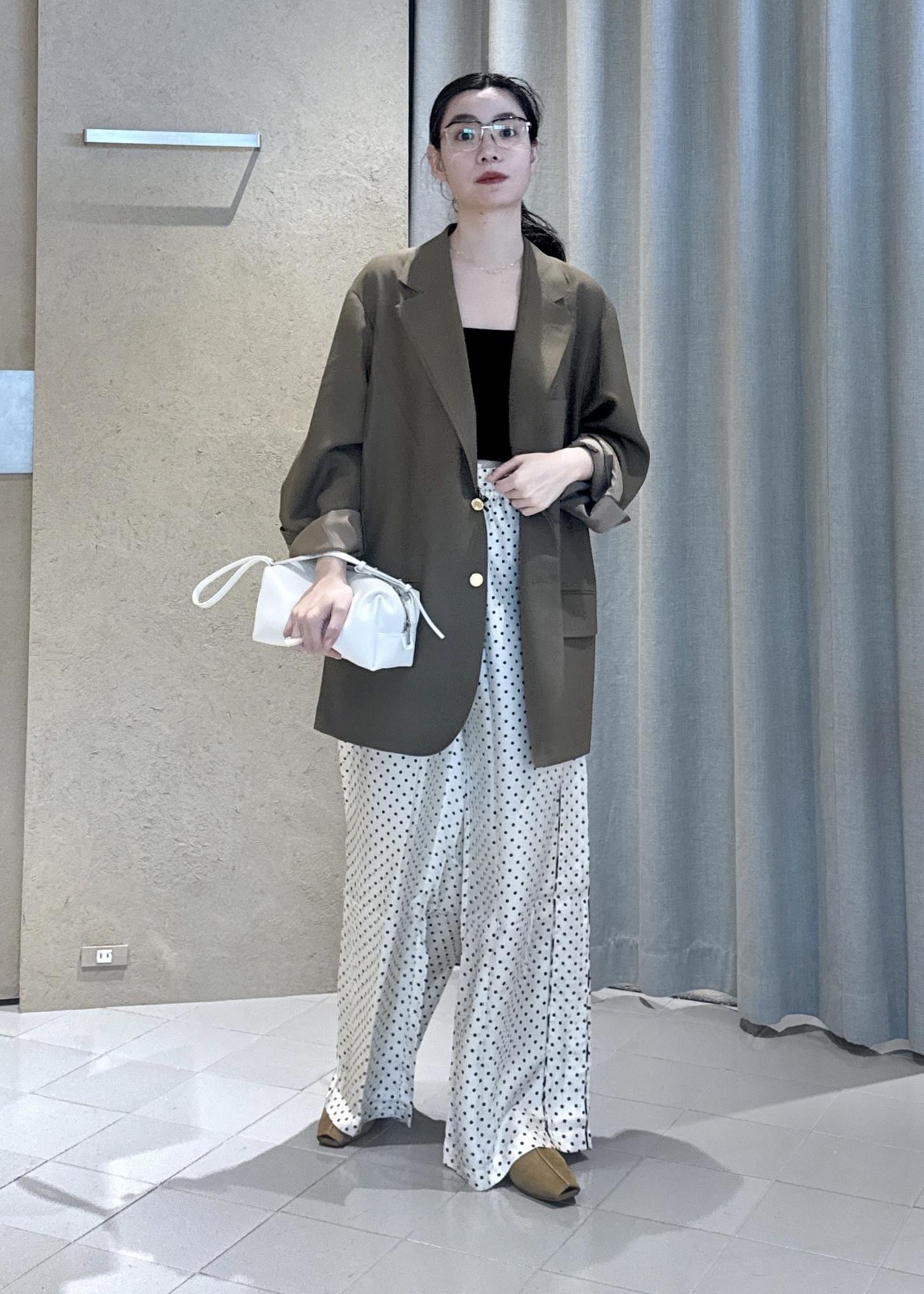 トレンドに左右されないワイドパンツ×コンパクトトップスの組み合わせですが、素材にメリハリを持たせたのがポイントです。