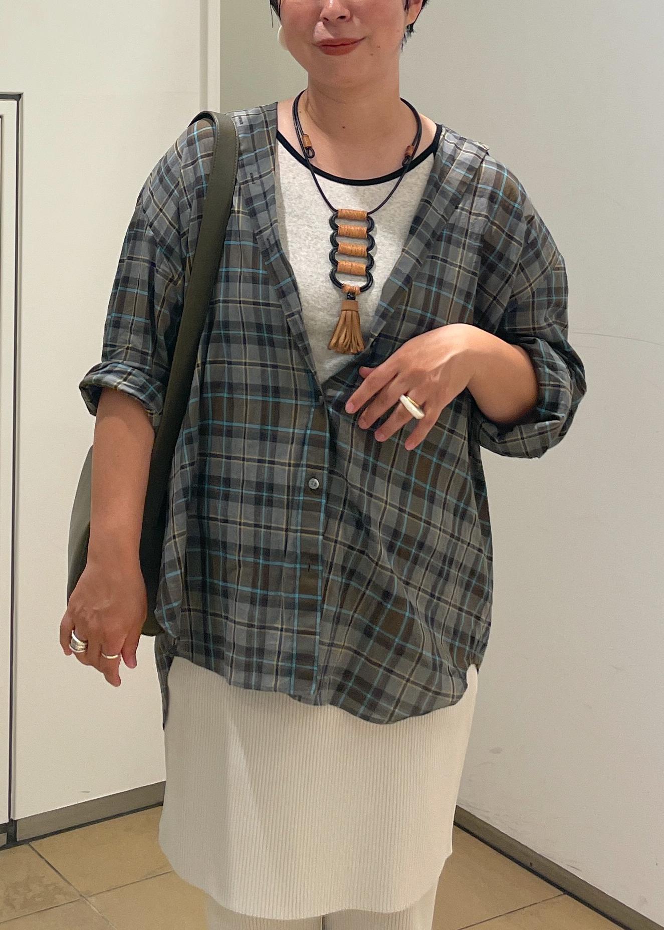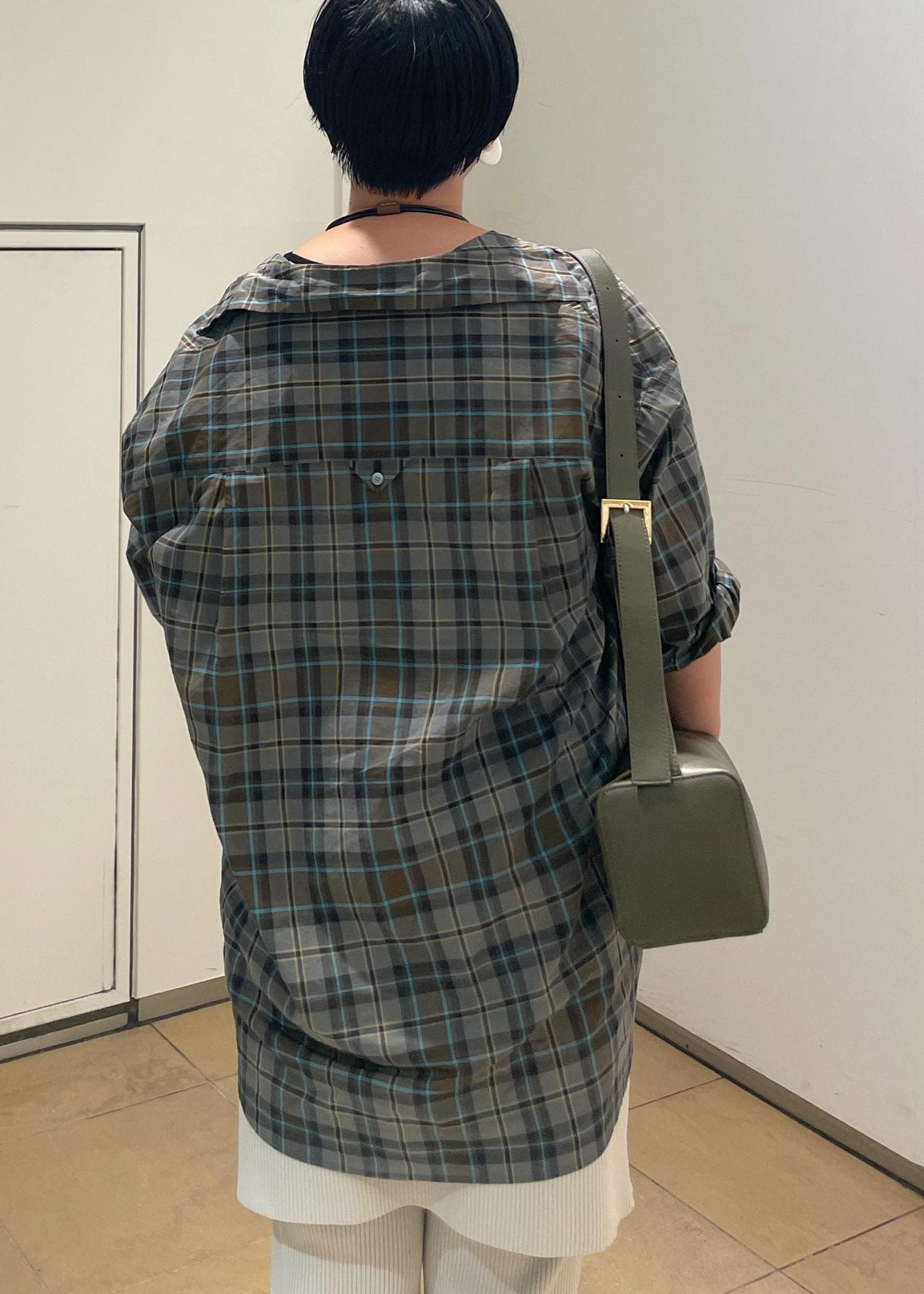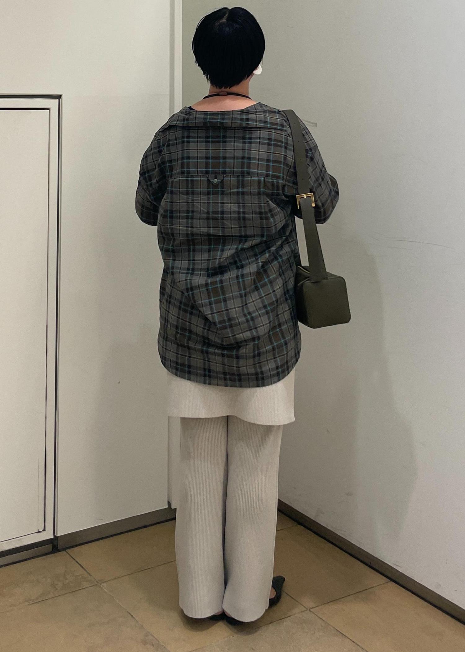 シャツのグリーンチェックと、カバンのカーキで、秋らしさをプラスしました。