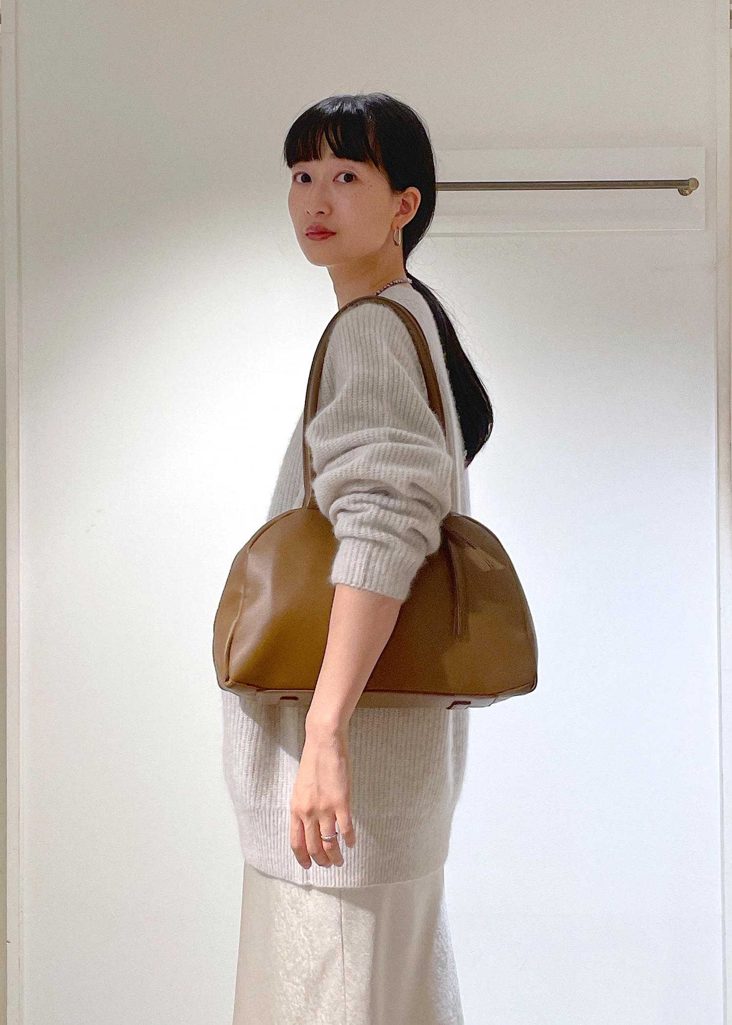 柔らかい色合わせにブラウンのレザーバッグがポイントです。