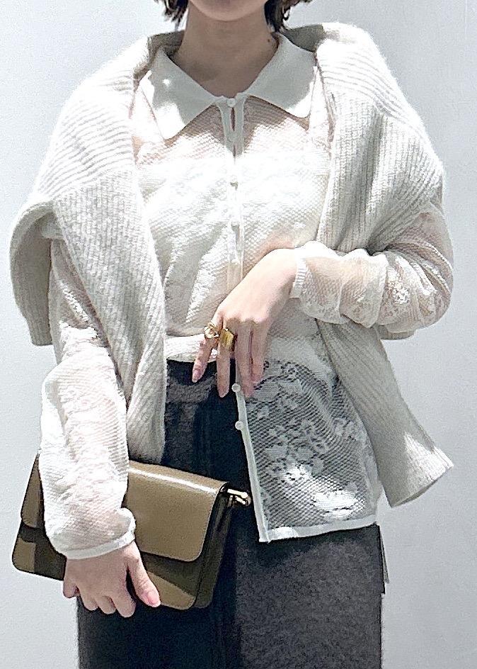 シアー感強めなので、ウールのカーディガンを肩にくるっと巻くとあたたかい&かわいいです◎