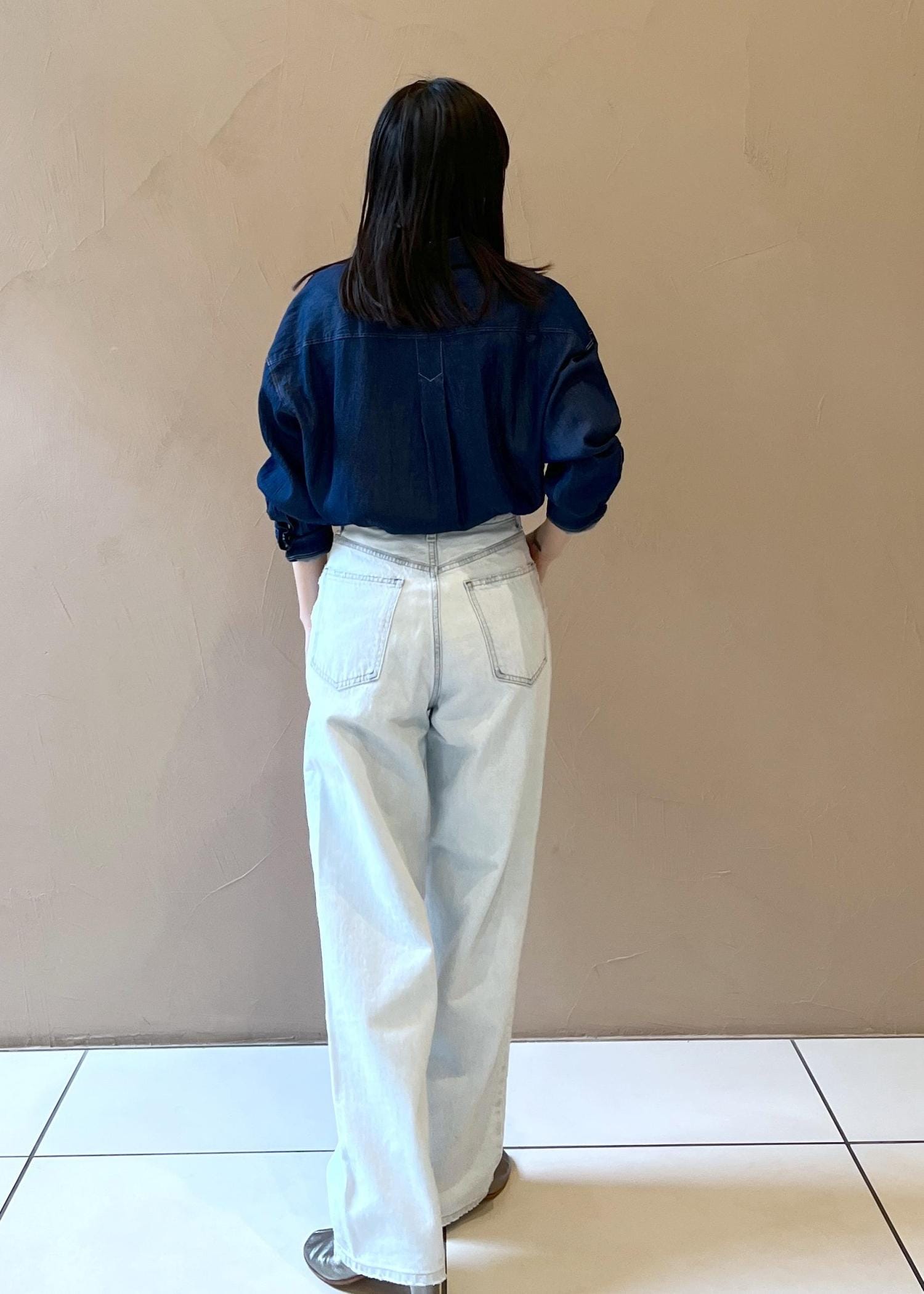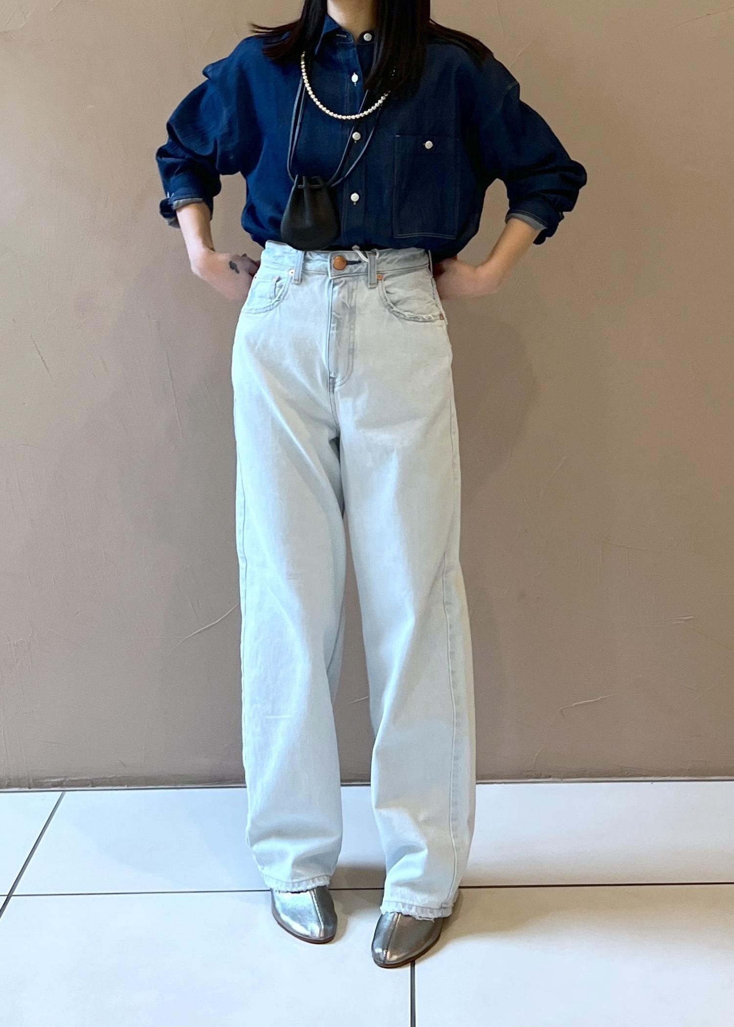 デニムシャツ×デニムのカジュアルなスタイル。濃淡をはっきりさせてメリハリをつけました。