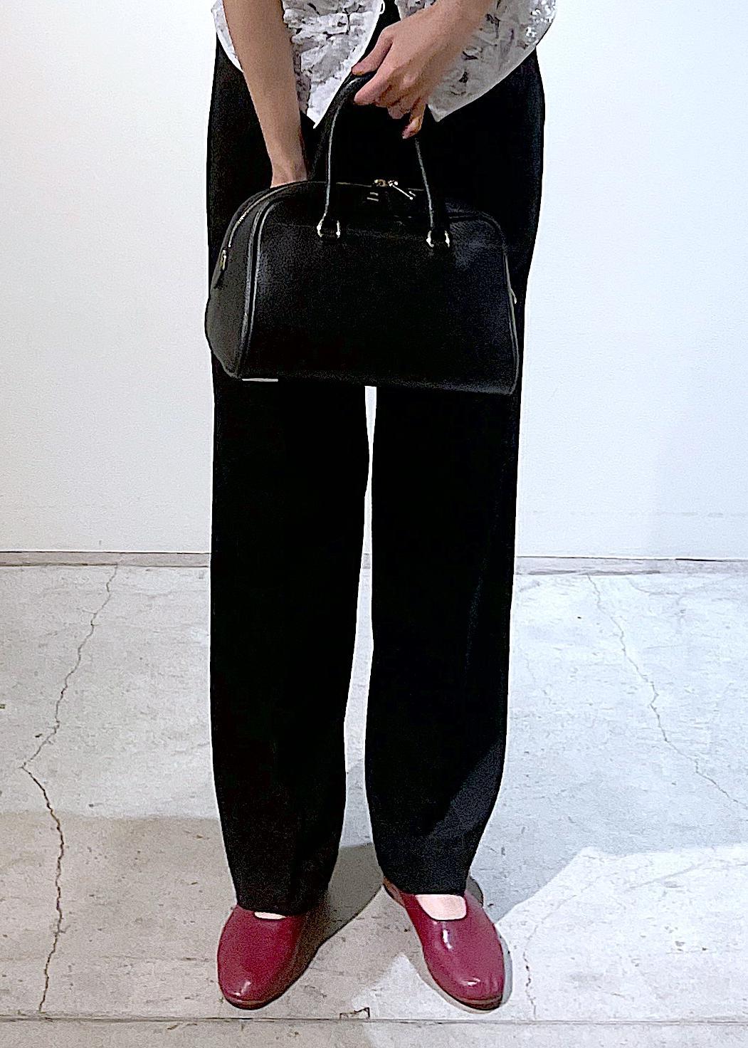 シンプルなイージースラックスを合わせて、足元には差し色のワインカラーを。
