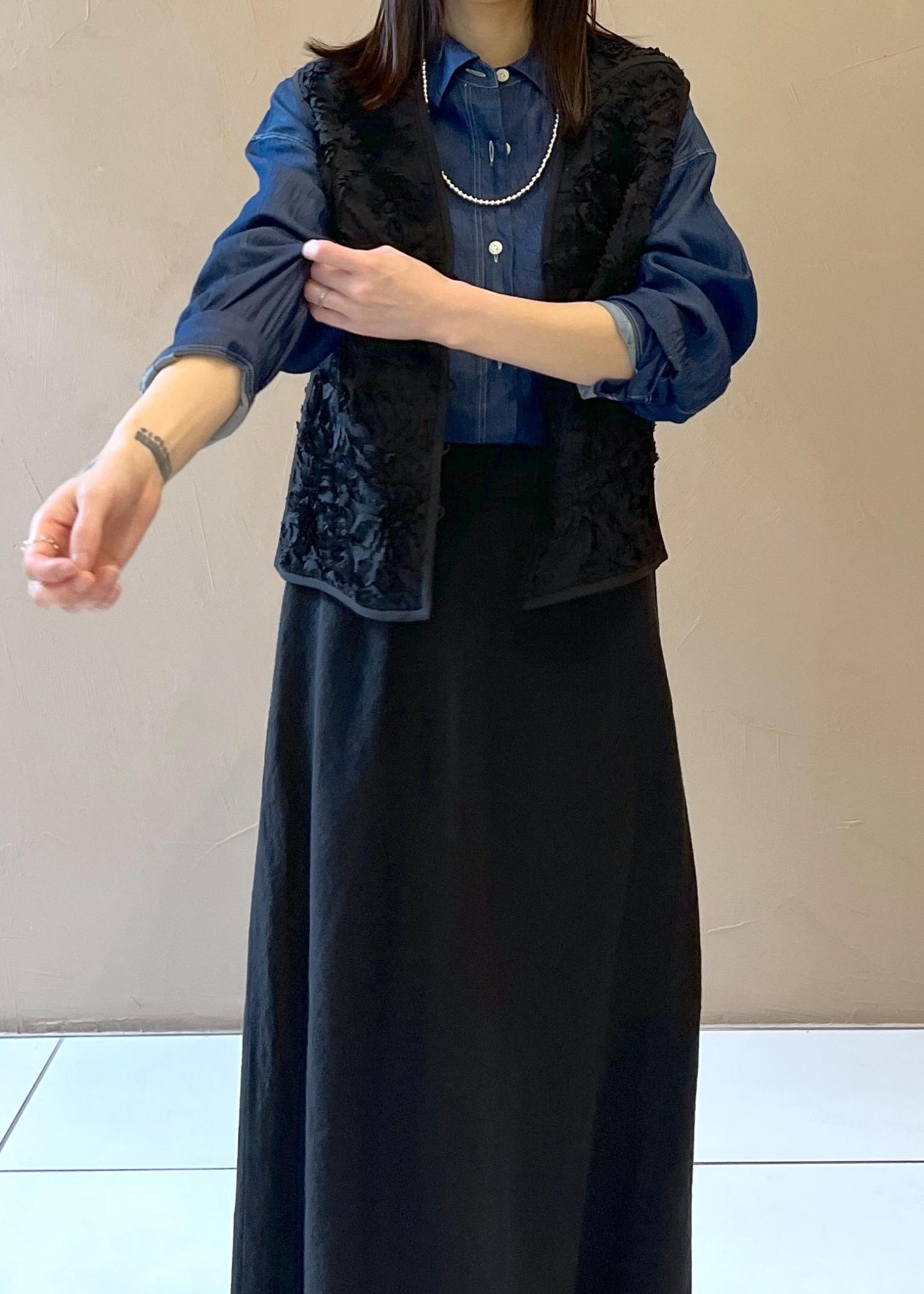 シンプルなシャツ×スカートスタイルにベストをプラス。