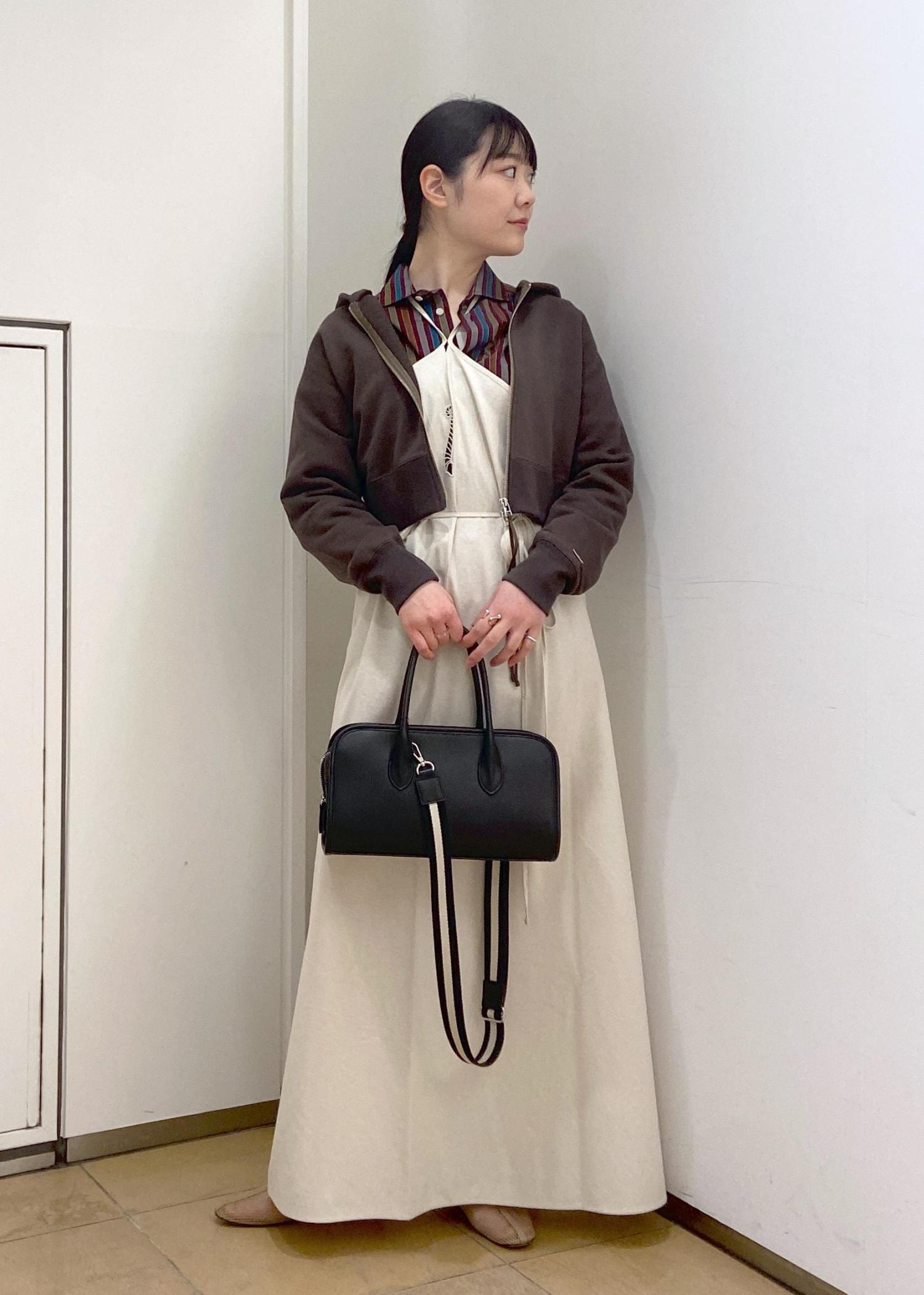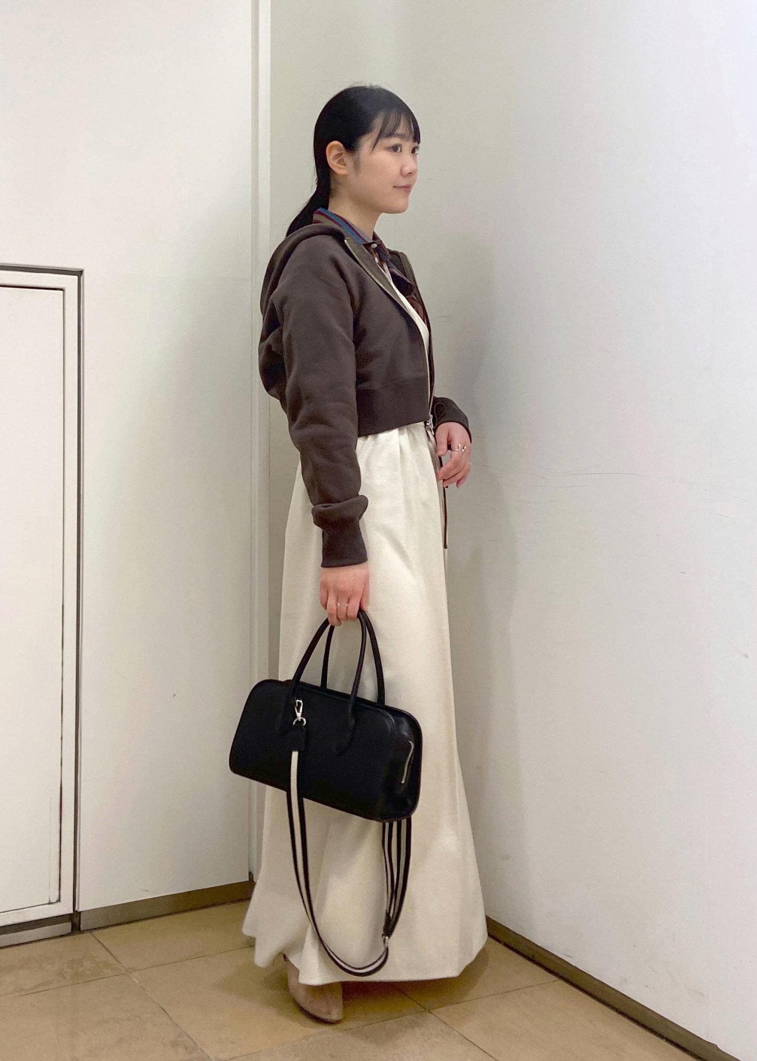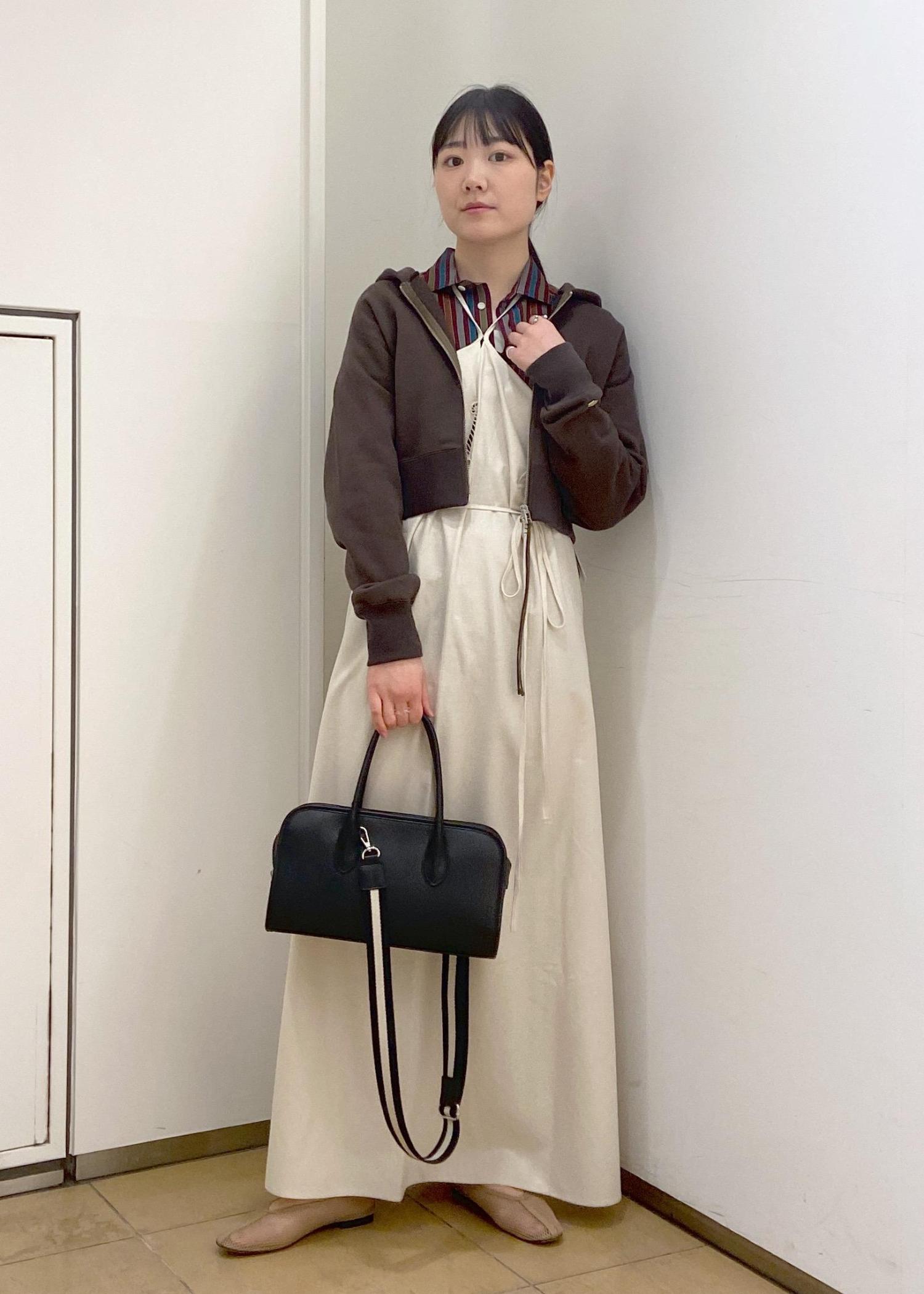 クロップド丈なので、ロングスカートやシャツと合わせることで、カジュアルすぎない大人のきれいめスタイリングが叶います。