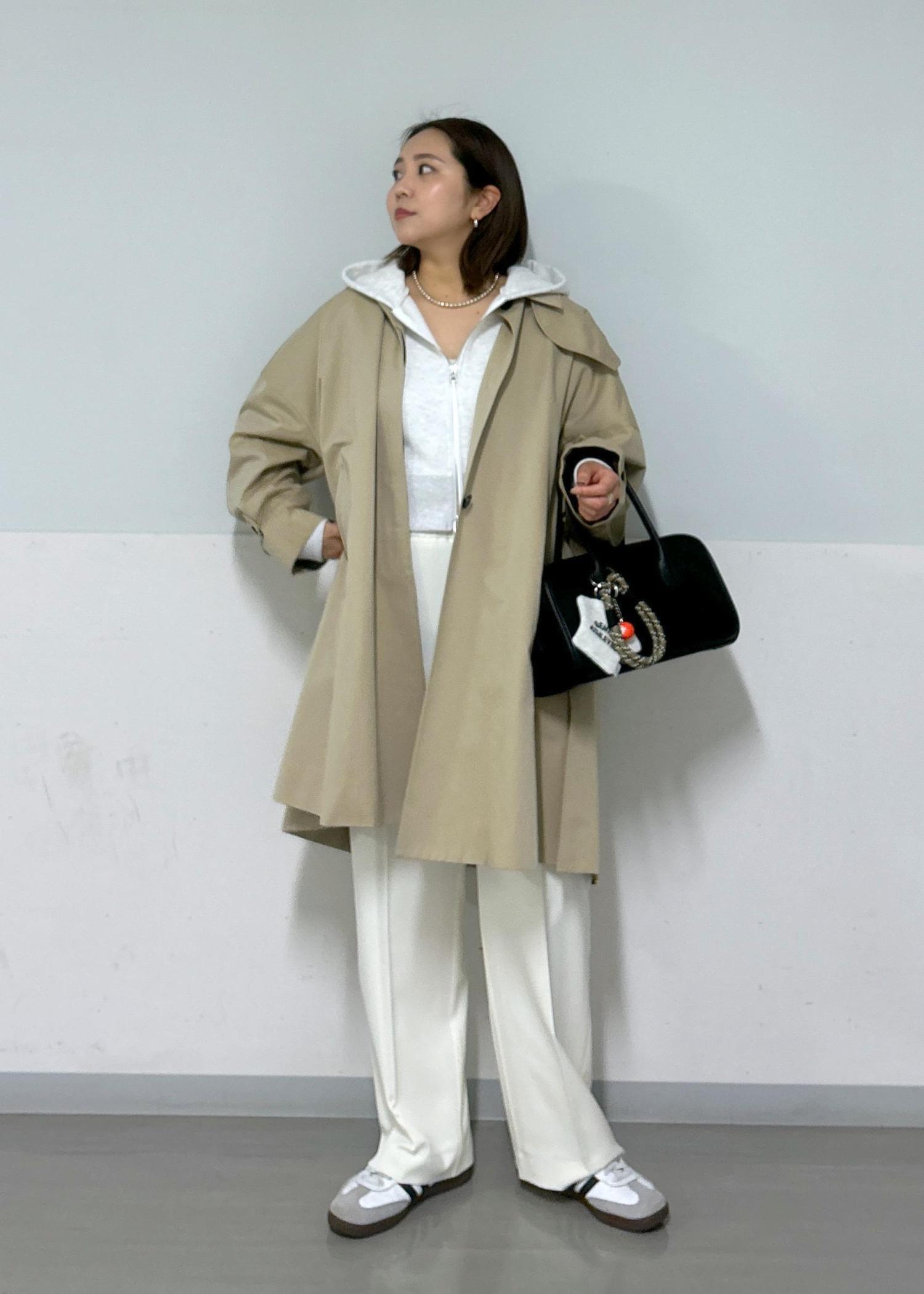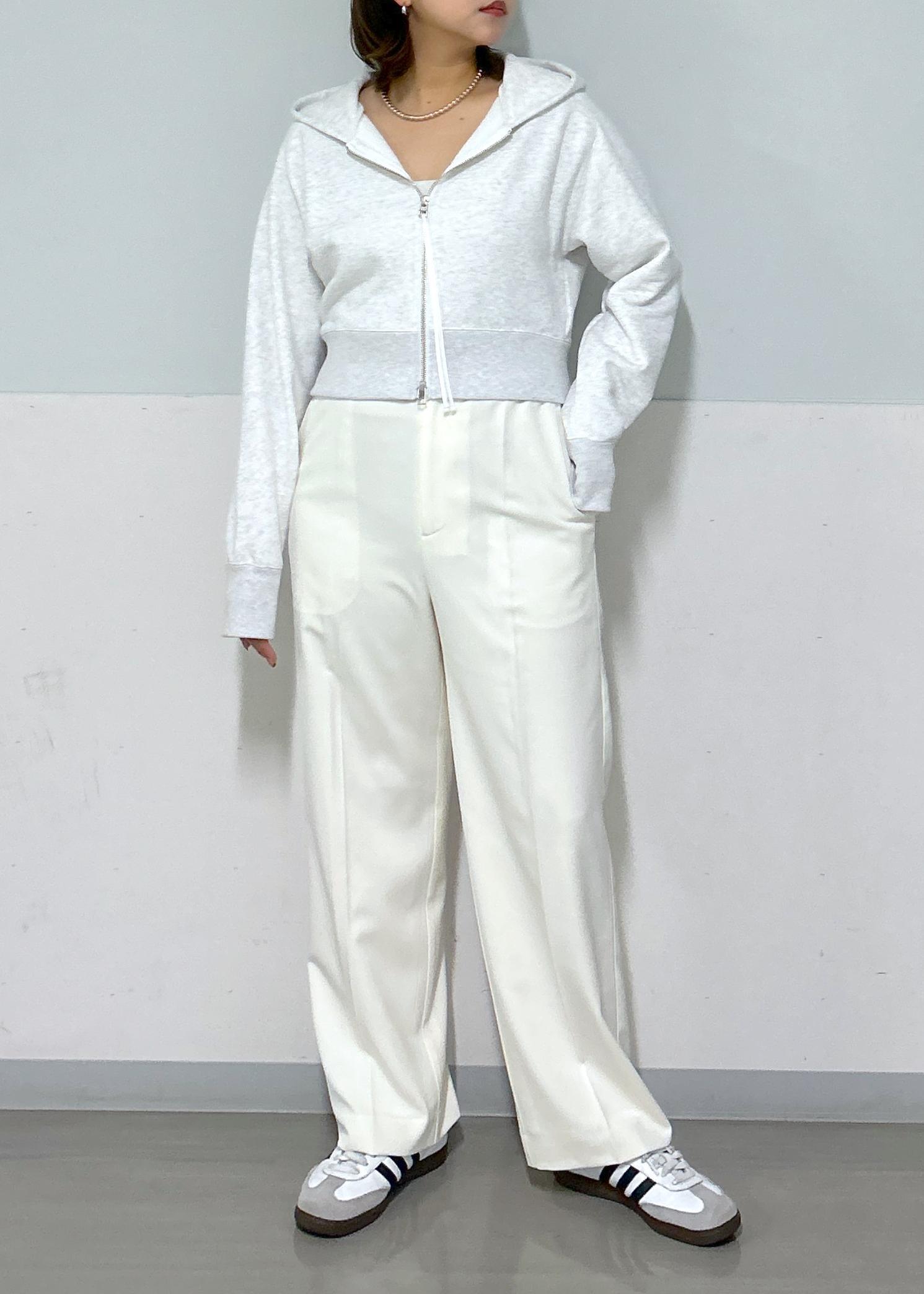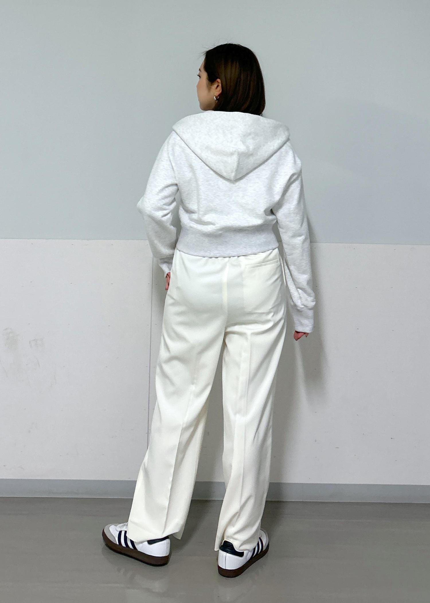 丈は長めでゆるっとしたシルエットで着用いただけます。普段通りのサイズ感でかかと上位の丈感です。