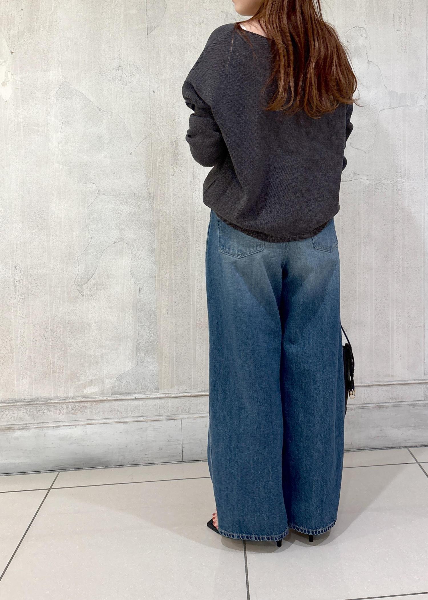 タックの入ったデニムは、おしり周りに余裕がありつつ、ウエストがすっきり見えるデザインとなります。
