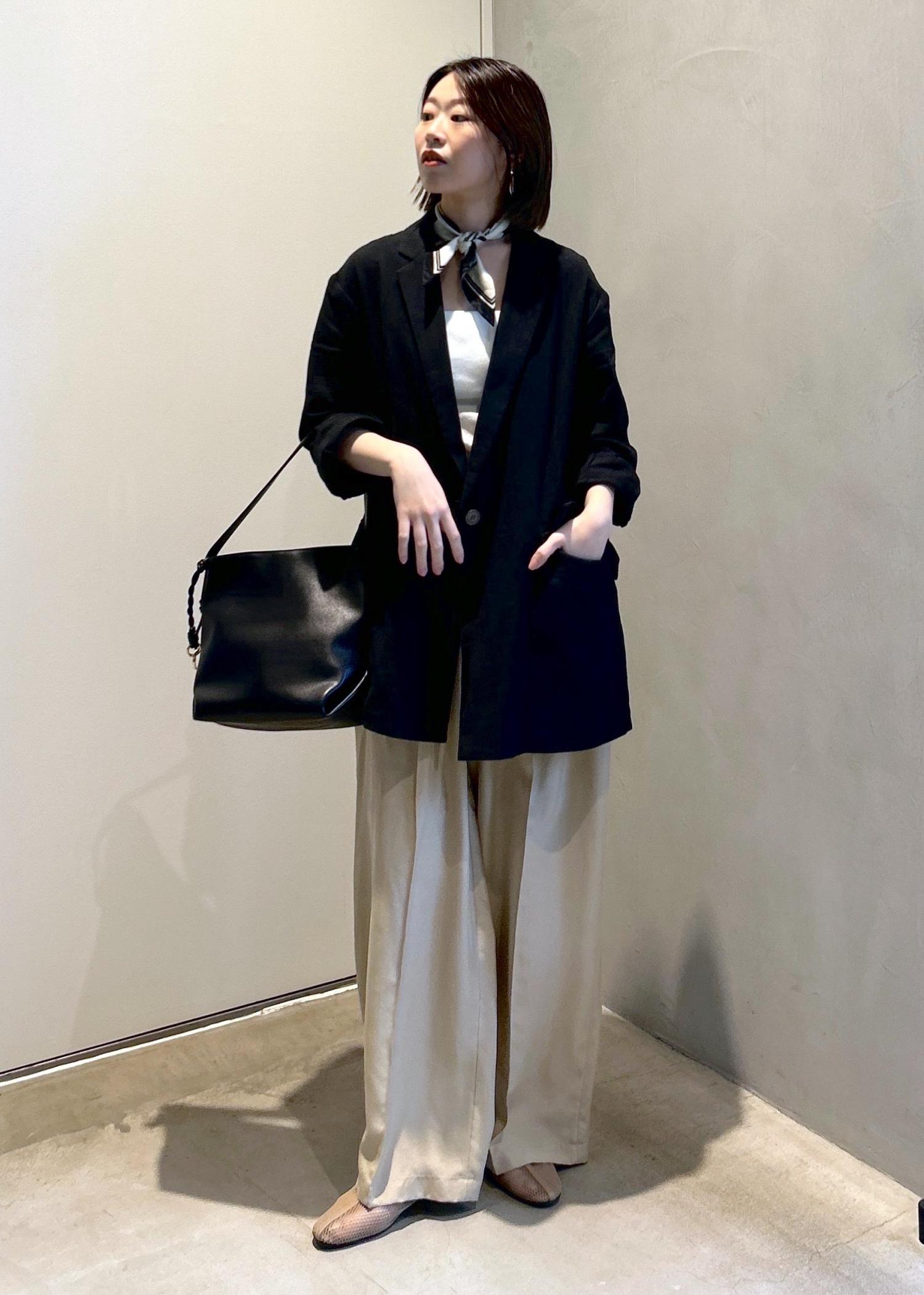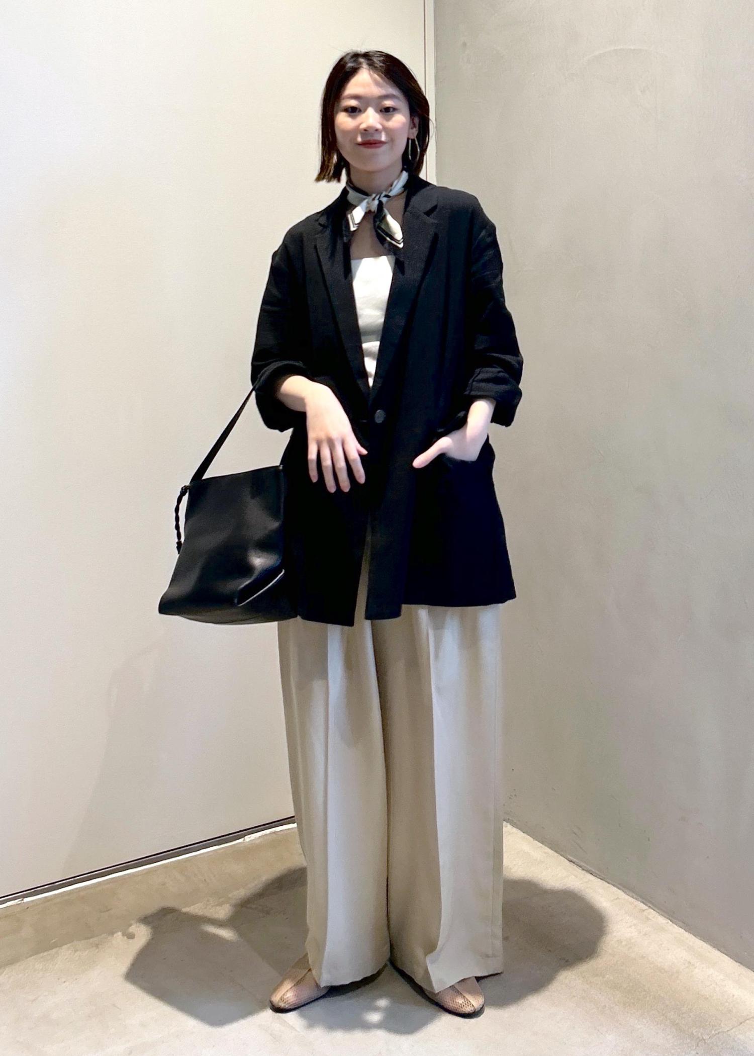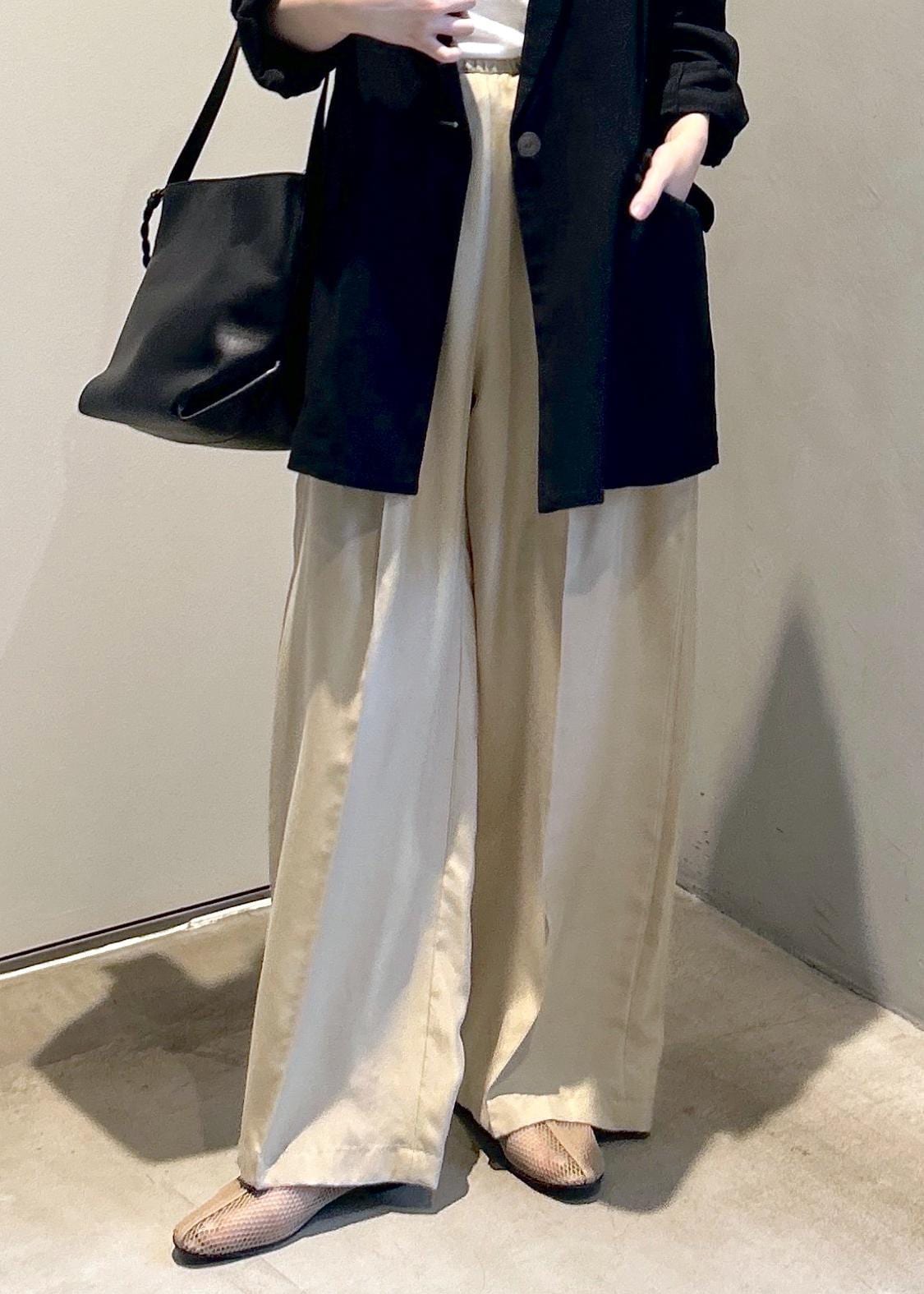 シルクの落ち感のあるパンツを合わせて大人カジュアルなスタイリングにまとめました。
