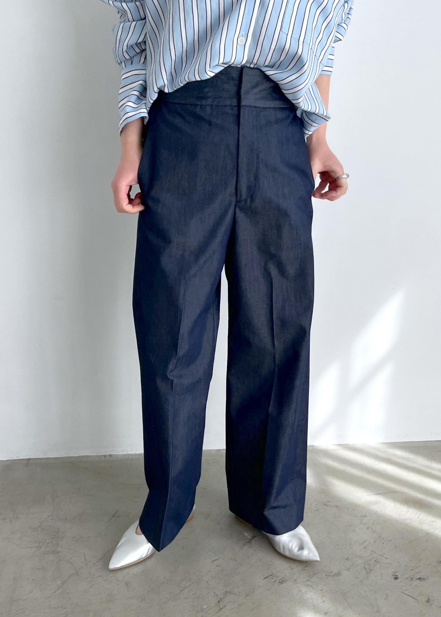 ドライタッチでハリ感のある素材。しっかりとセンタープレスがあり、すっきり見えするデザインです。速乾性のある洗濯も安心な素材です。