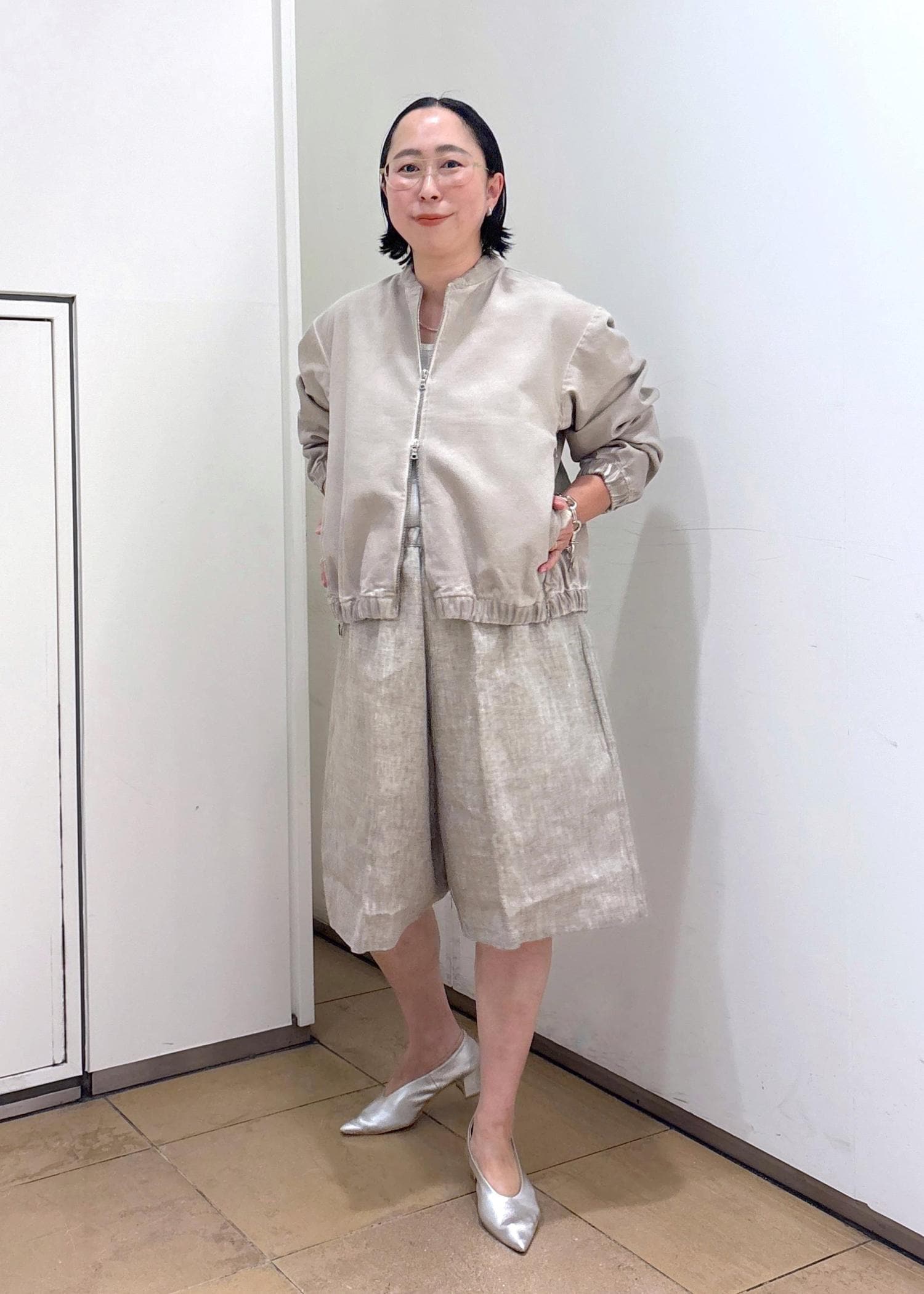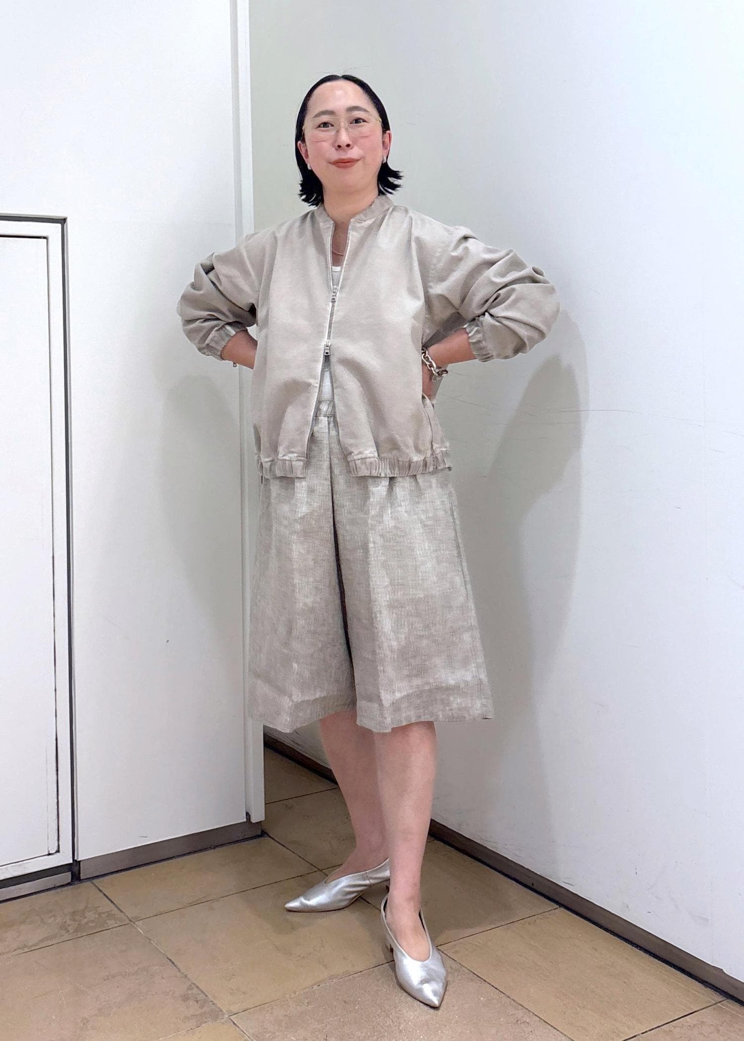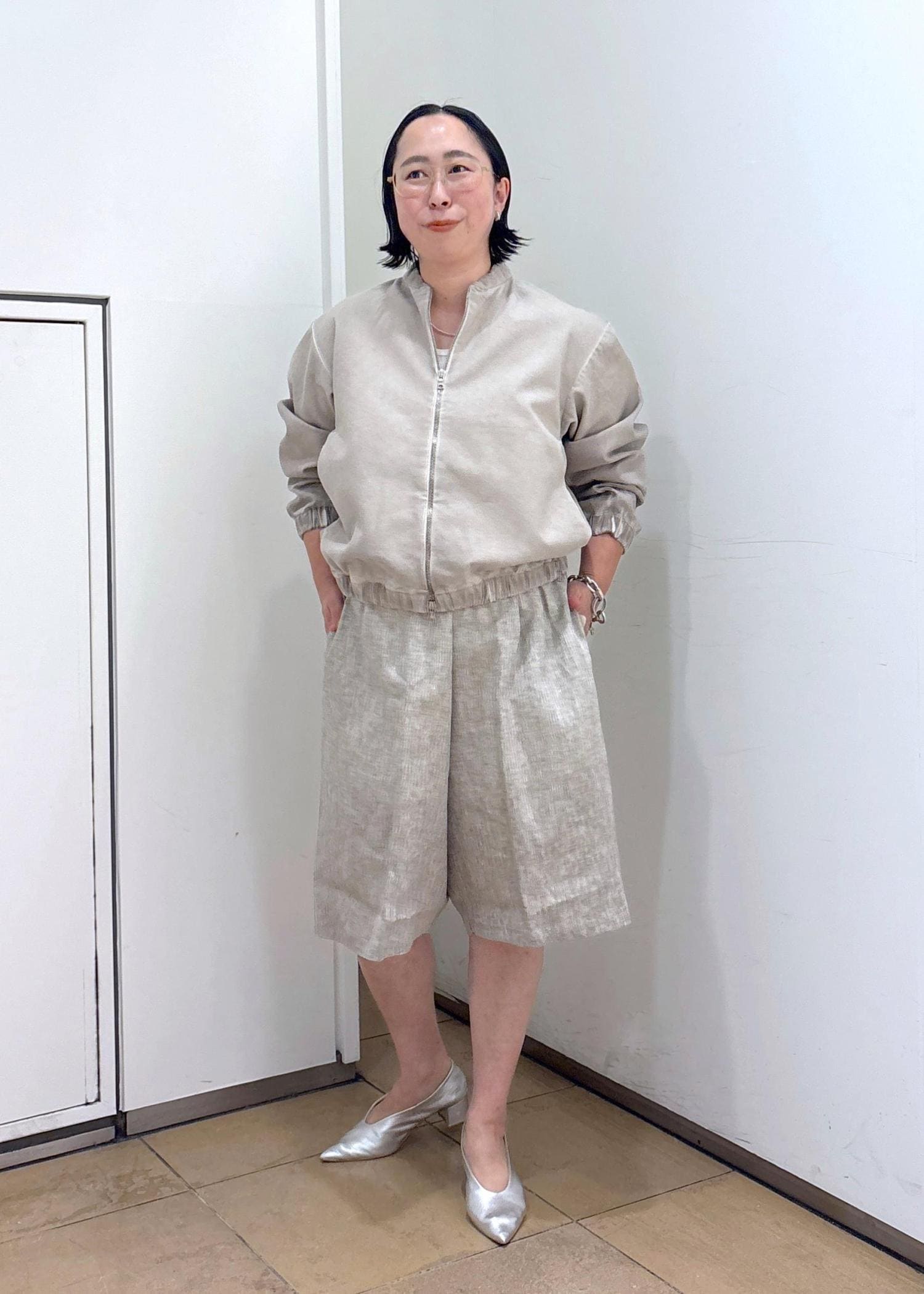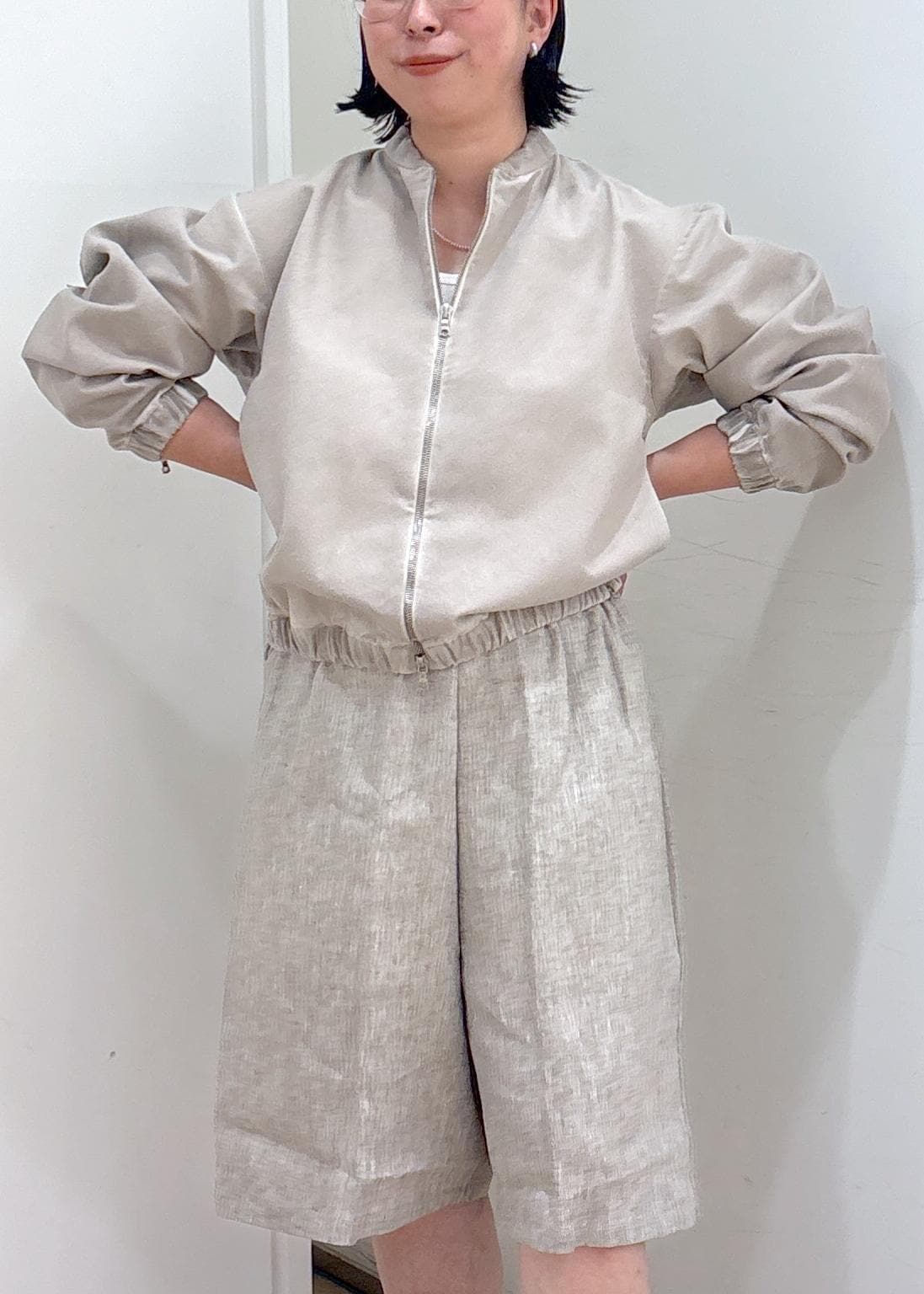 早速、フロント、背中、袖口、サイドの6箇所のファスナーで色んな着方の楽しめるブルゾンをリネンパンツに合わせてセットアップ風に着てみました。