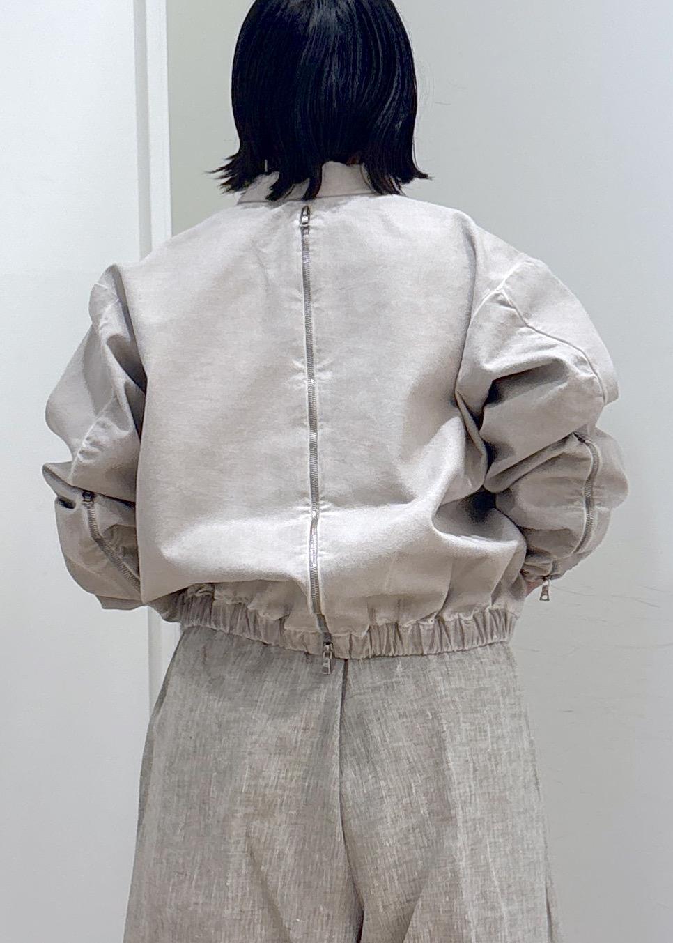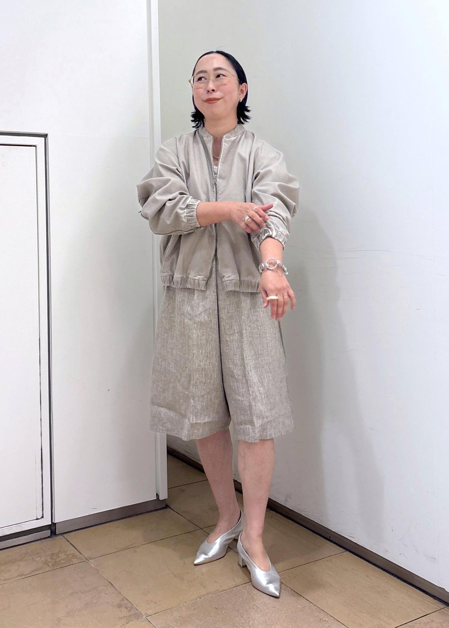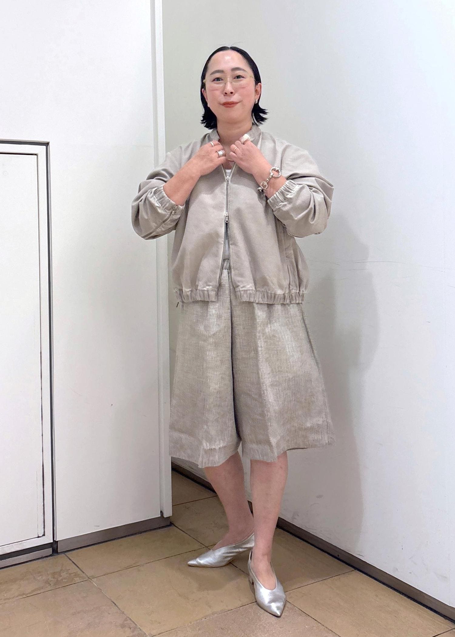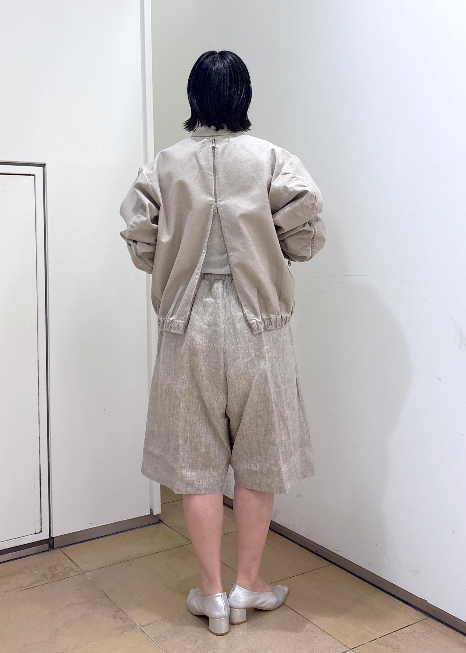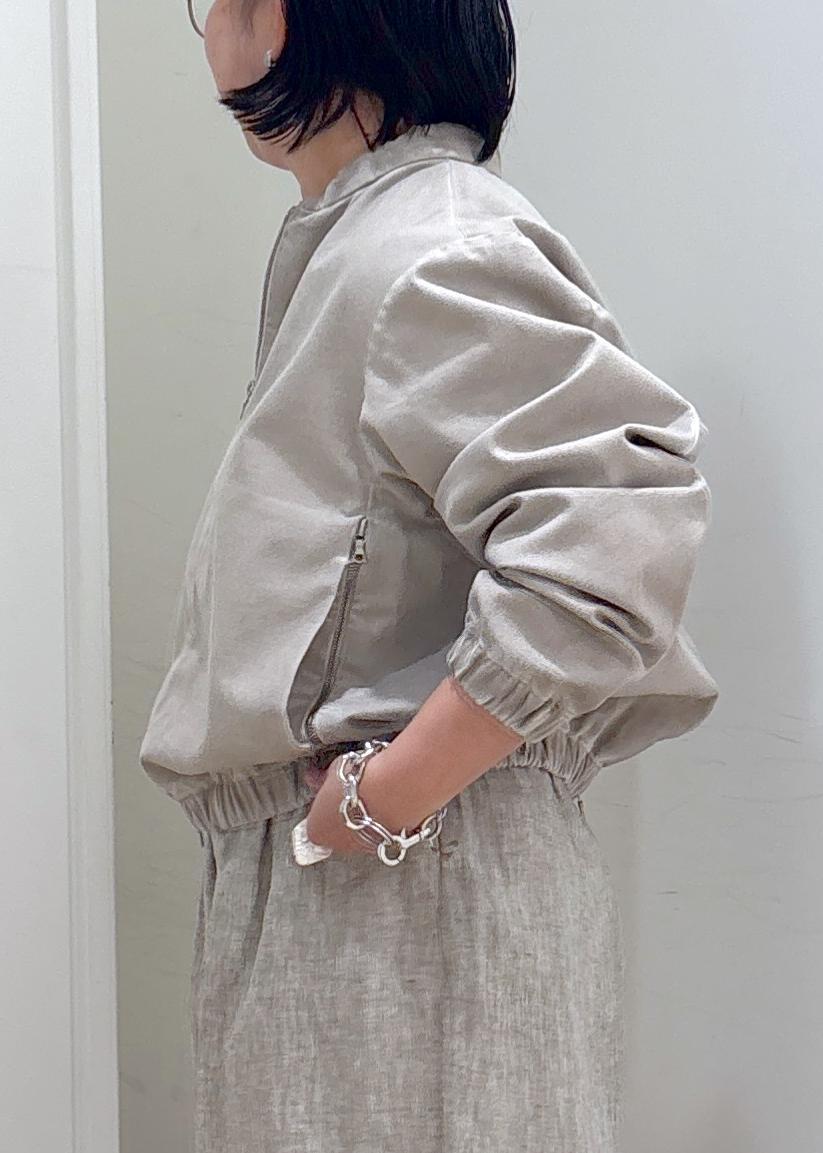 早速、フロント、背中、袖口、サイドの6箇所のファスナーで色んな着方の楽しめるブルゾンをリネンパンツに合わせてセットアップ風に着てみました。