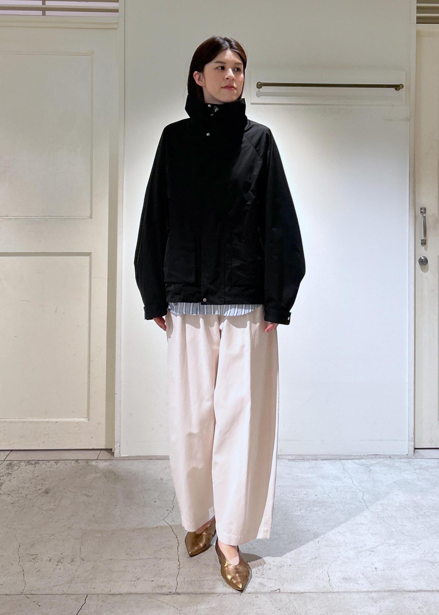 袖は手の甲が隠れるくらい、丈は腰骨が隠れるくらいの長さです。身幅はかなりゆったりしていて、裾が絞れるのでスッキリ着られます。キレイめなシルエットなのでスカートにもぴったりです。