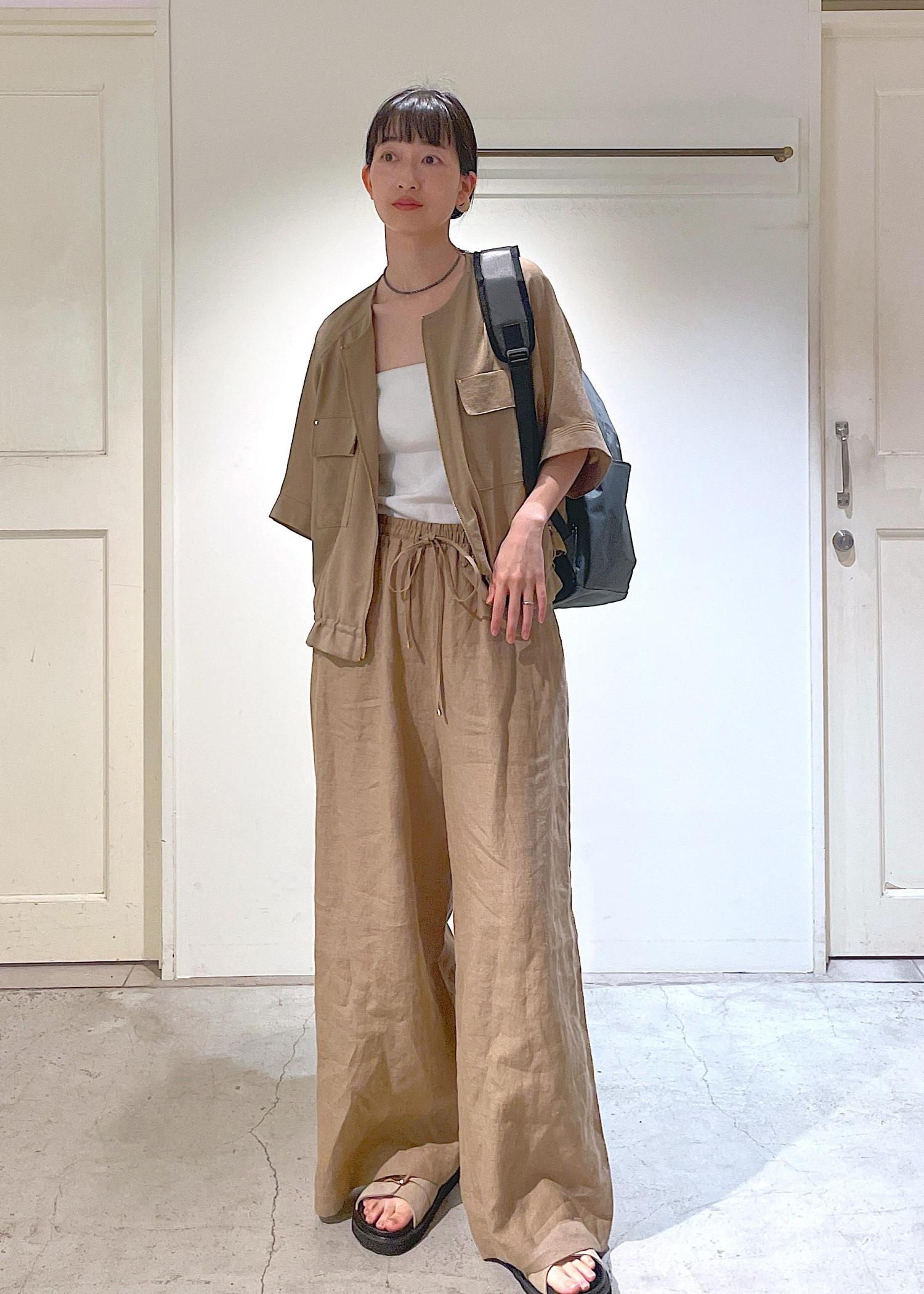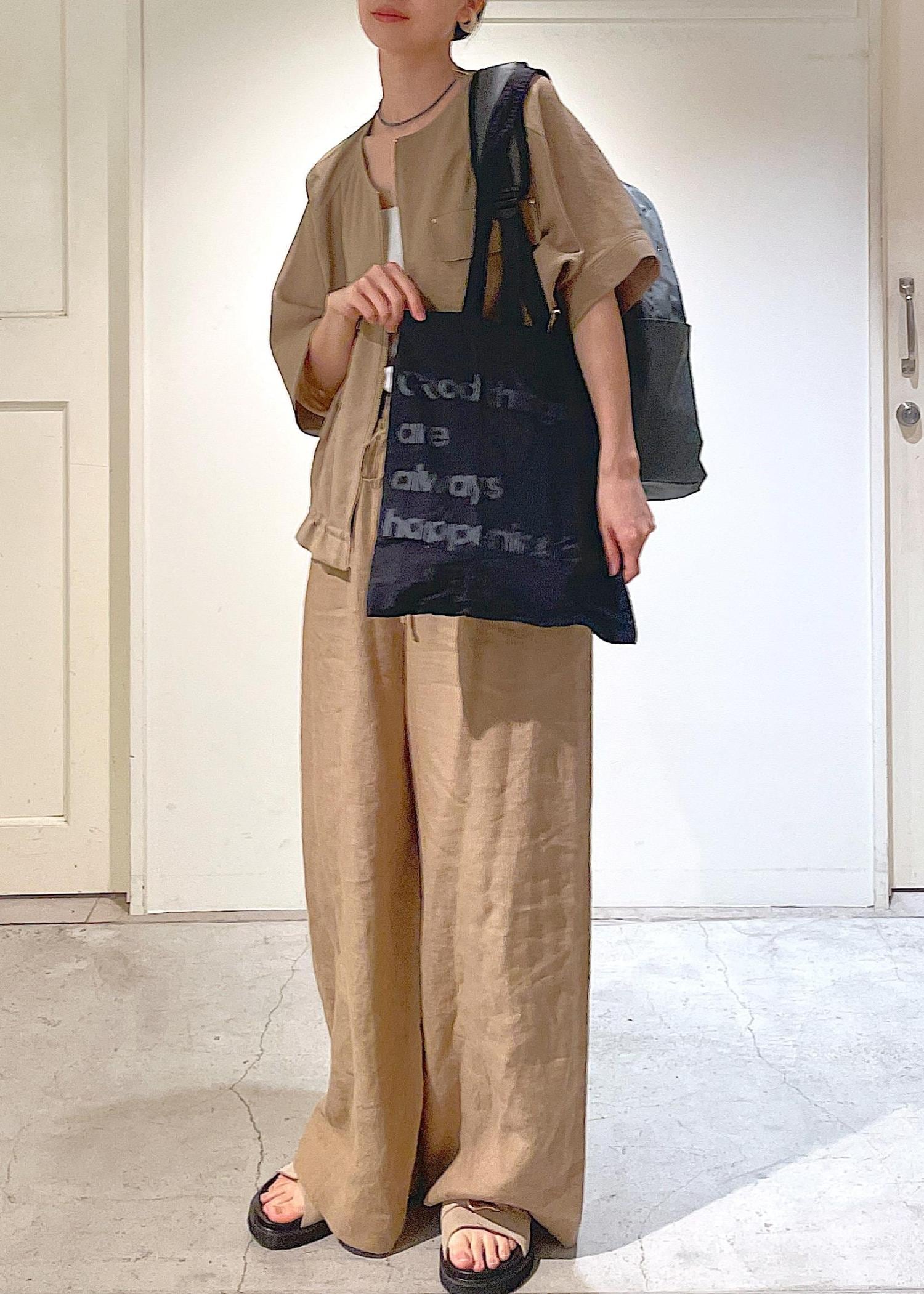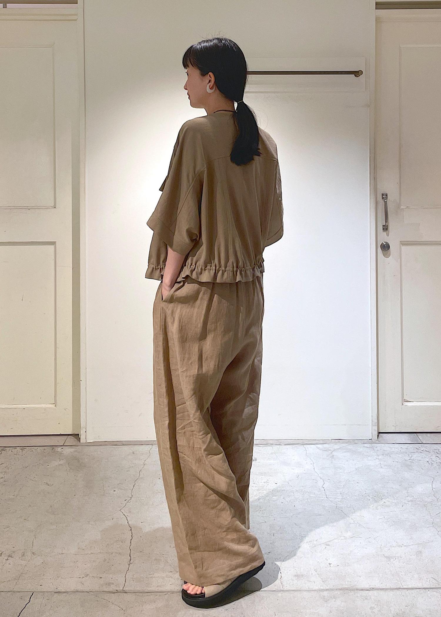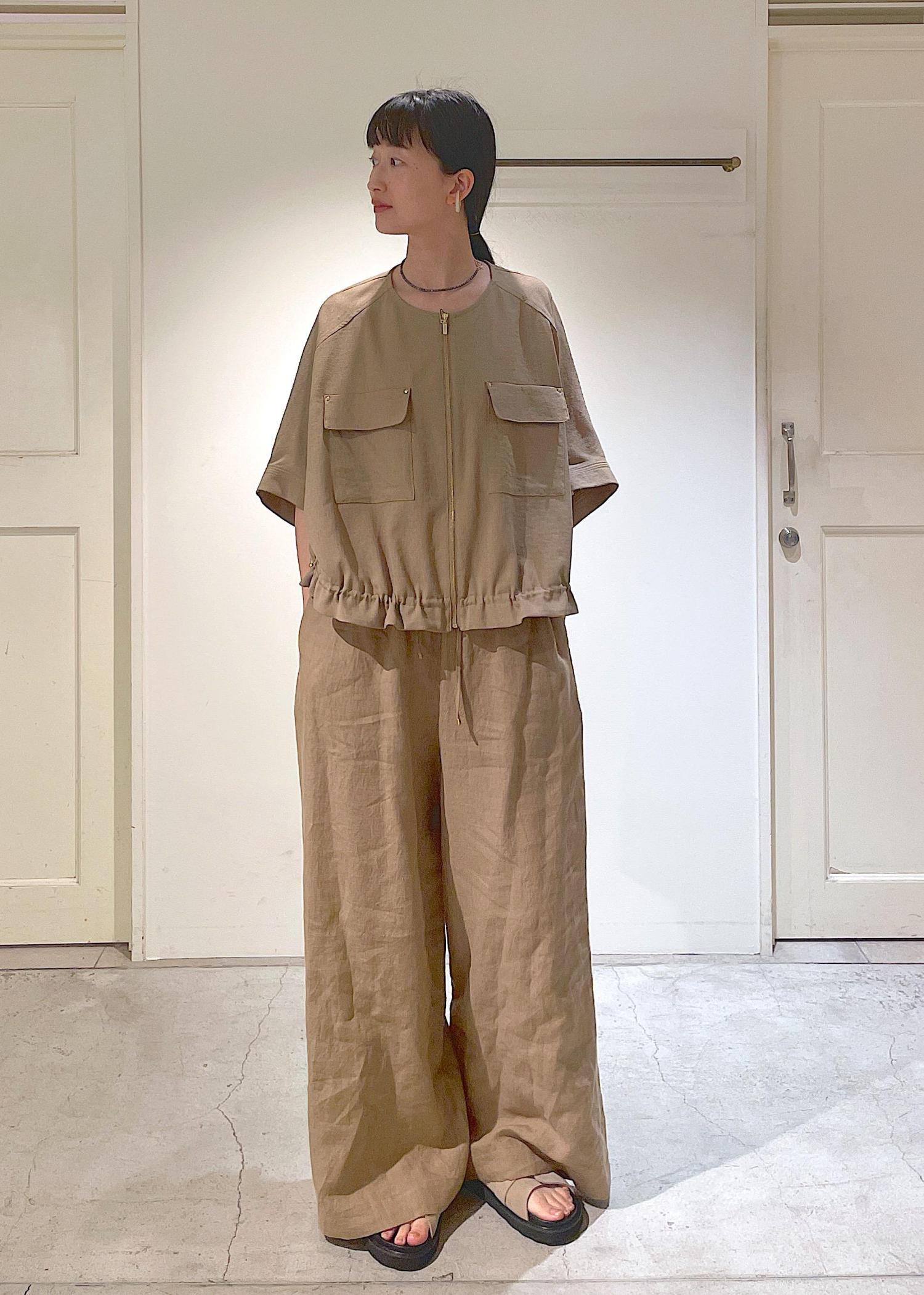ハーフスリーブブルゾンにリネンパンツを合わせたスタイリングと、インナーとリブレギンスをブラックで合わせたスタイリング2コーデ載せています。