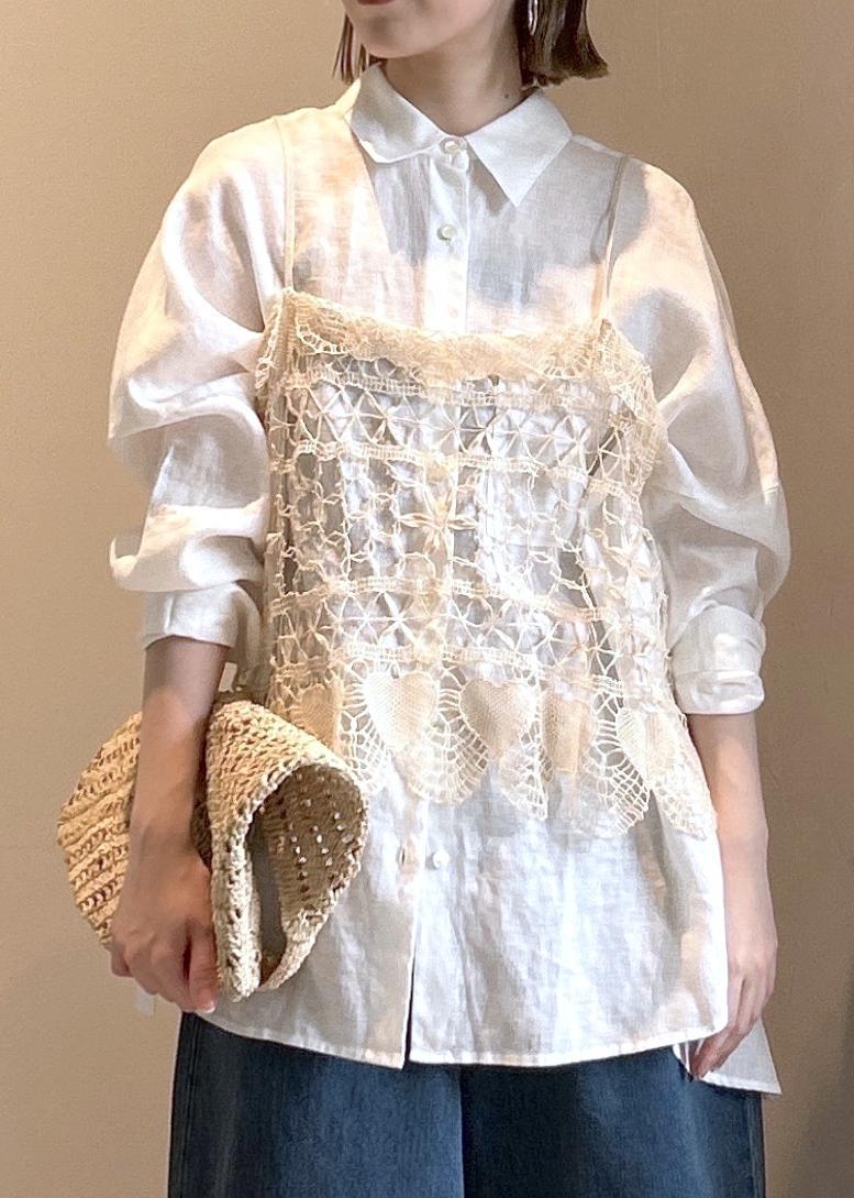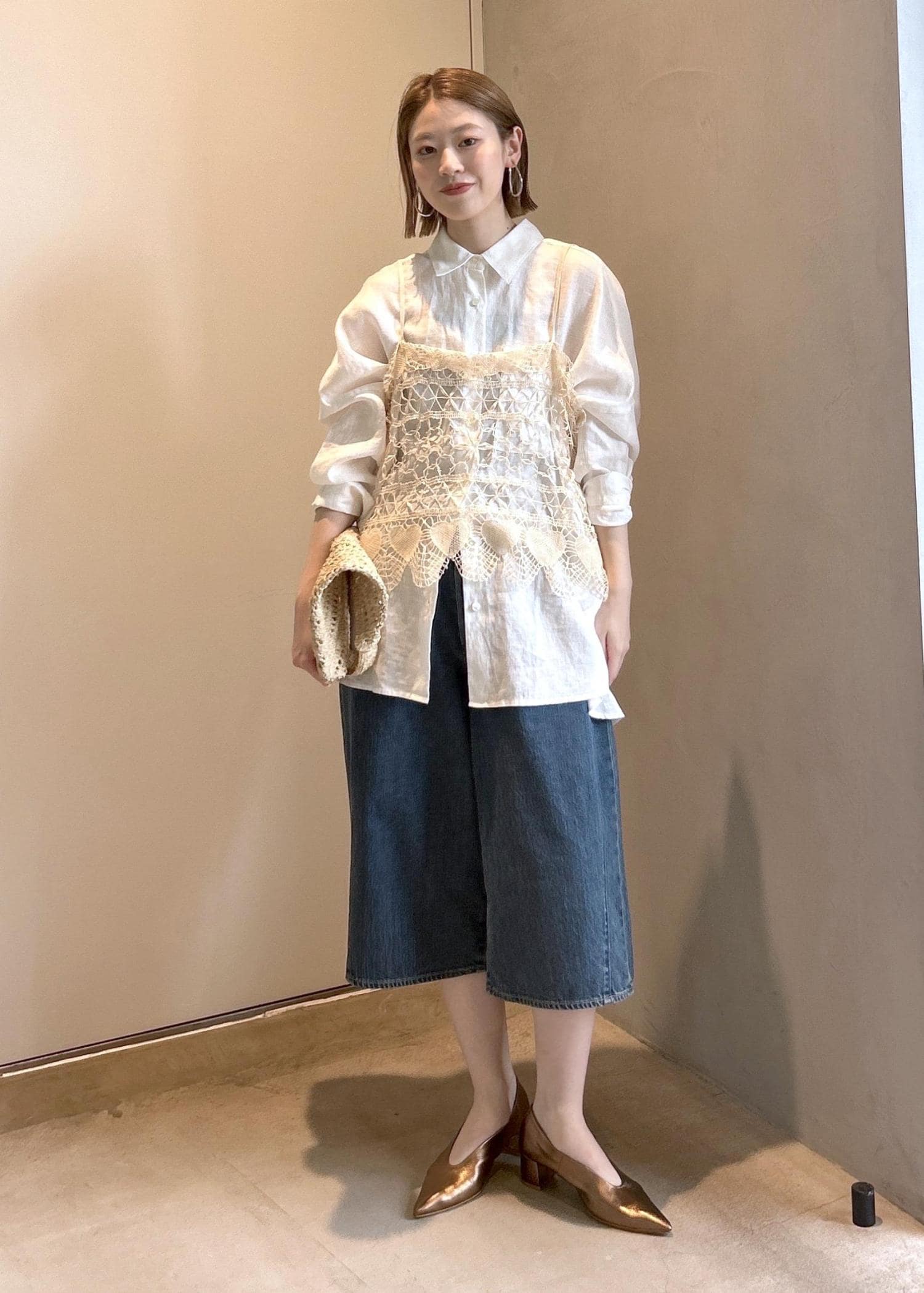 シャツ×ハーフパンツデニムだとややカジュアルすぎたので、レースビスチェを合わせて甘さをプラスしました。