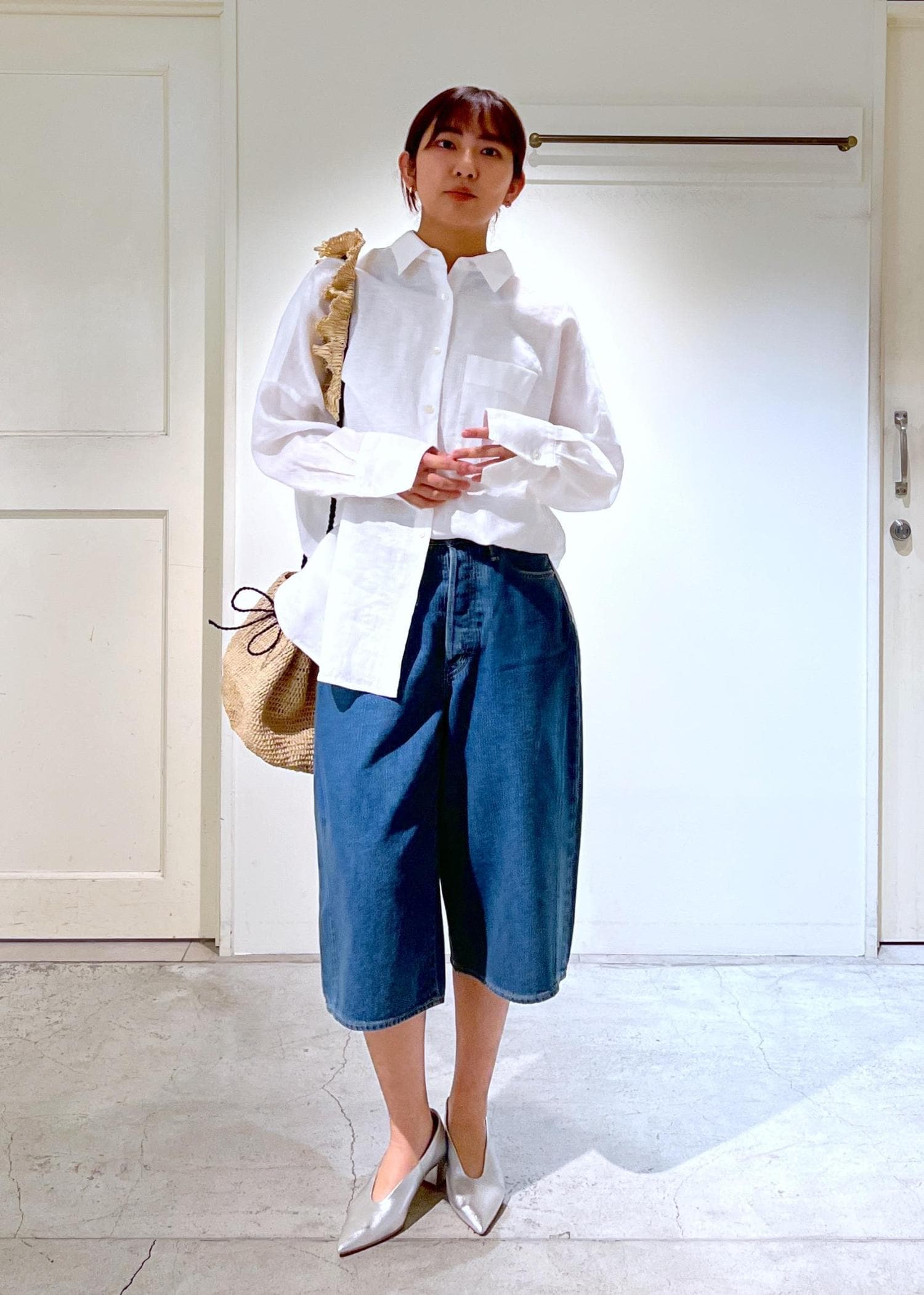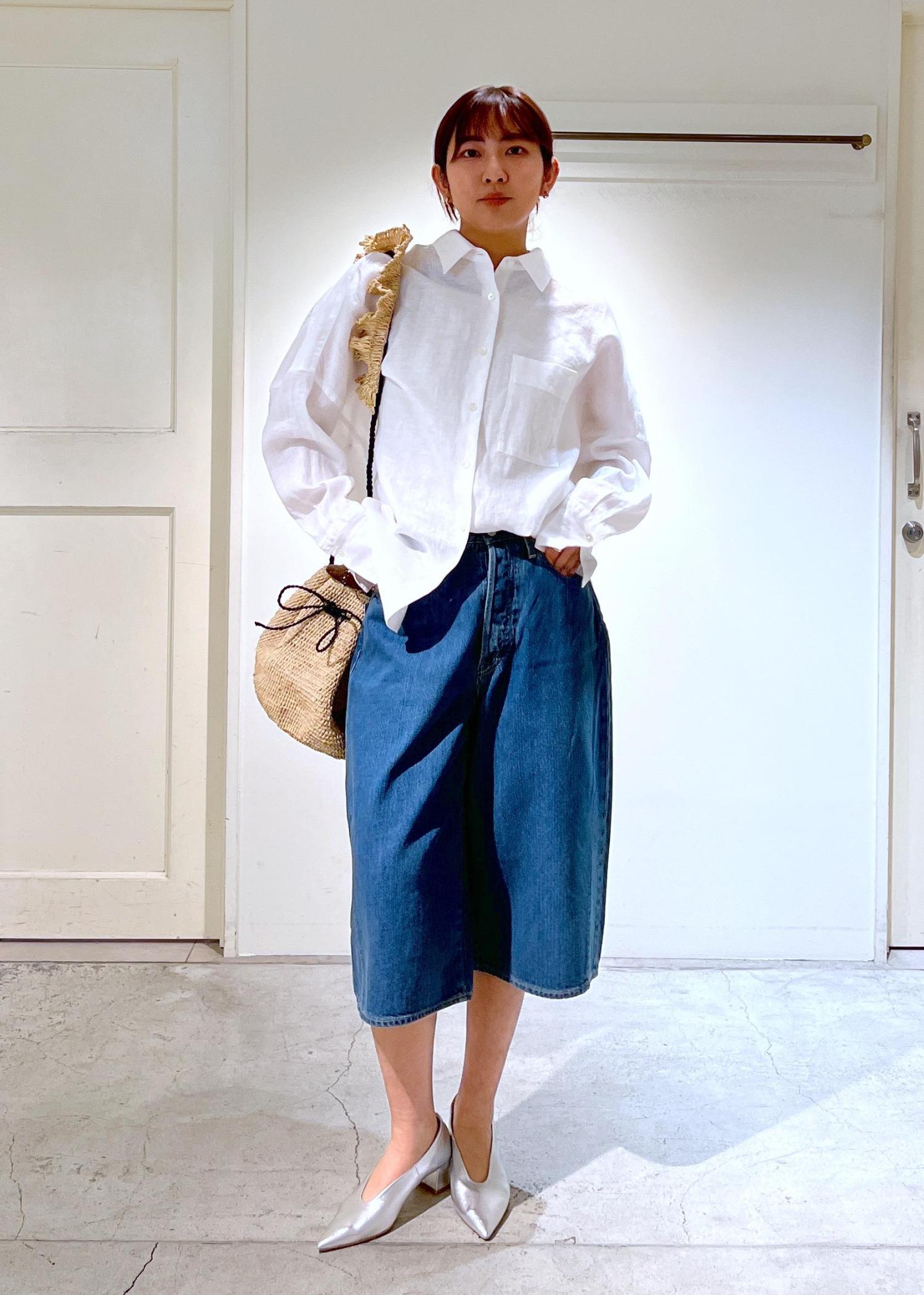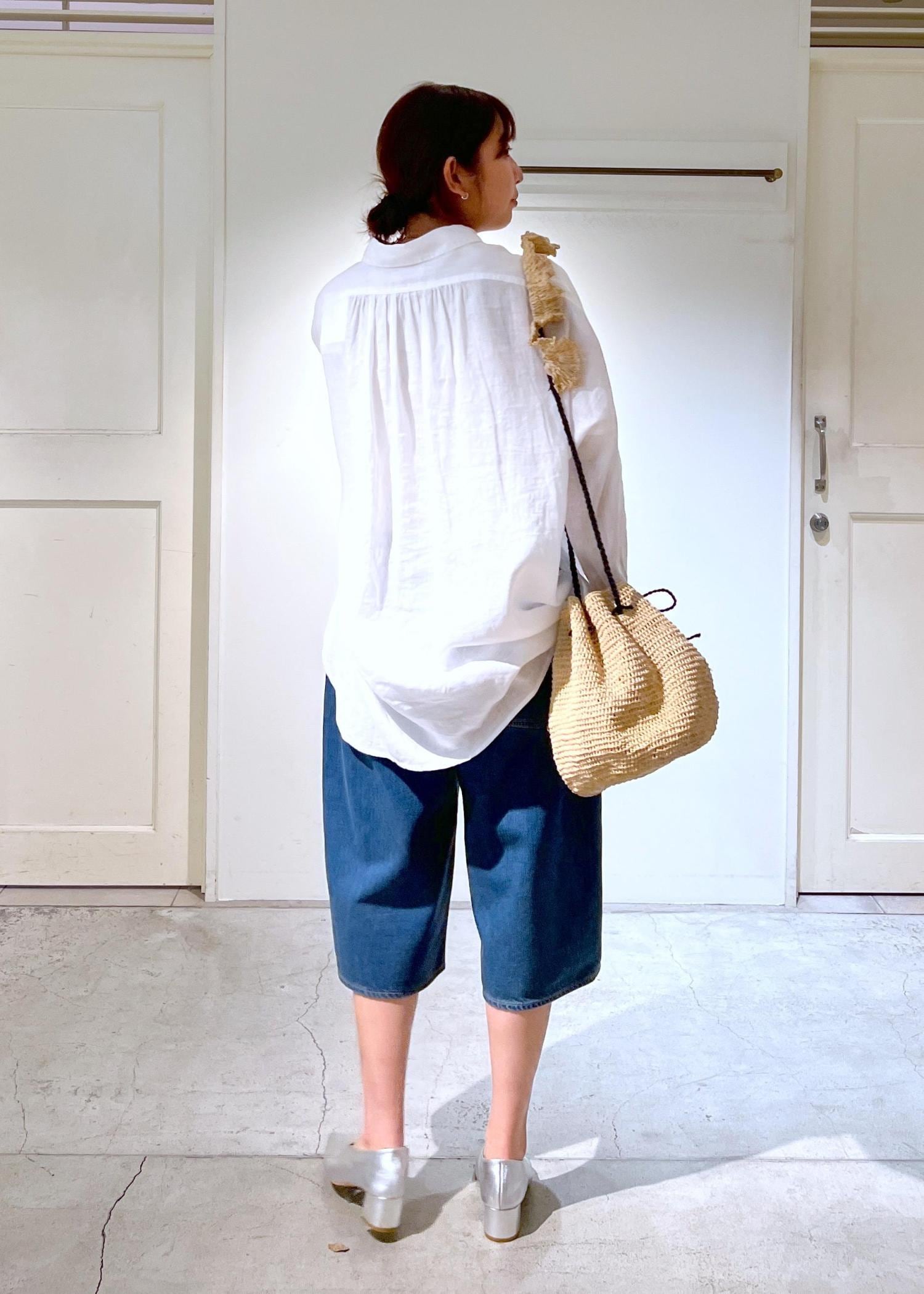 ゆるっとオーバーシャツと合わせたので足元はシンプルに。バッグは一つ一つハンドメイドでつくられたMAISON N.H PARISのショルダーバッグでポイントを。