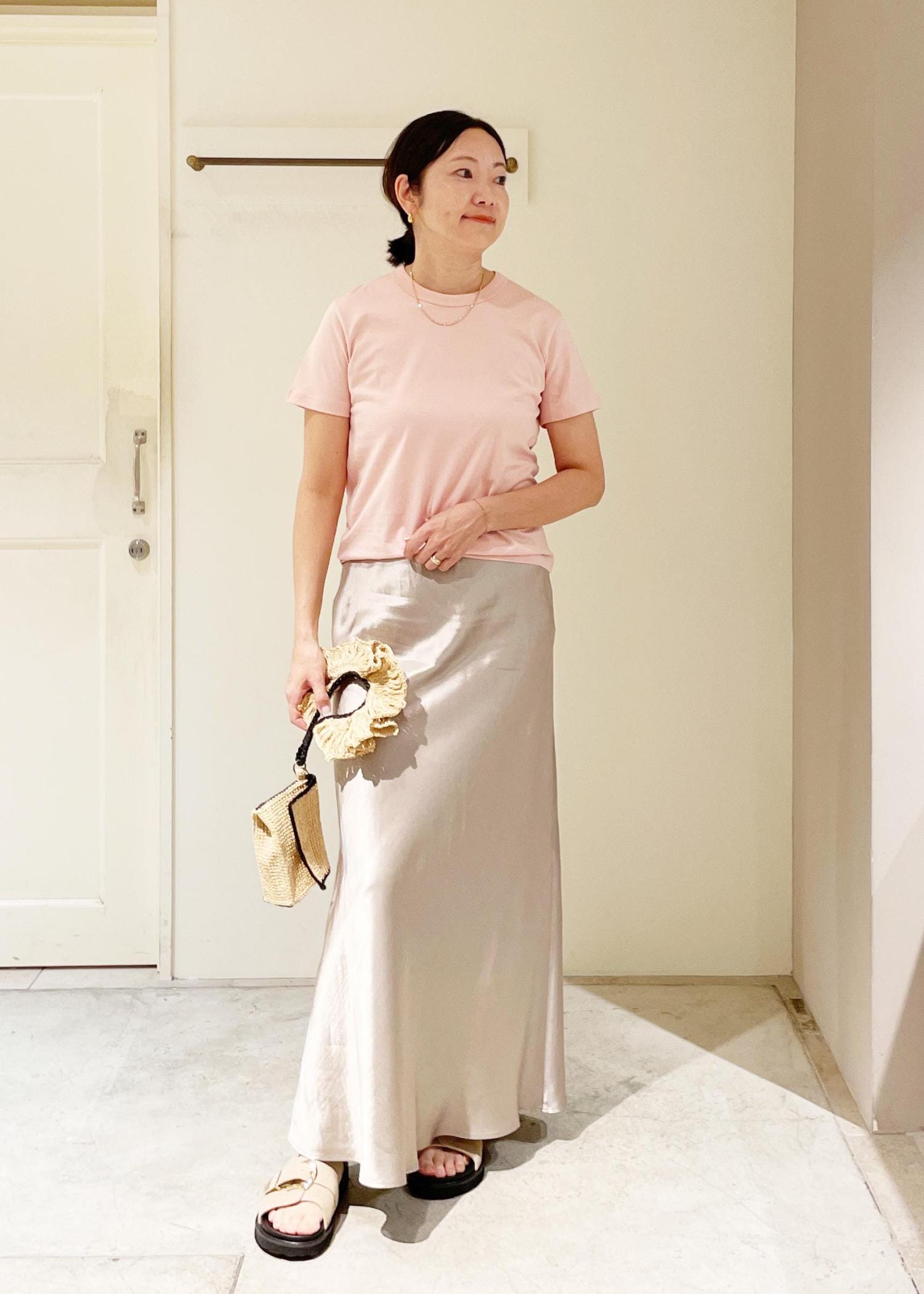 小物はラフィア素材のバッグと厚底サンダルで夏らしさと抜け感をプラス。