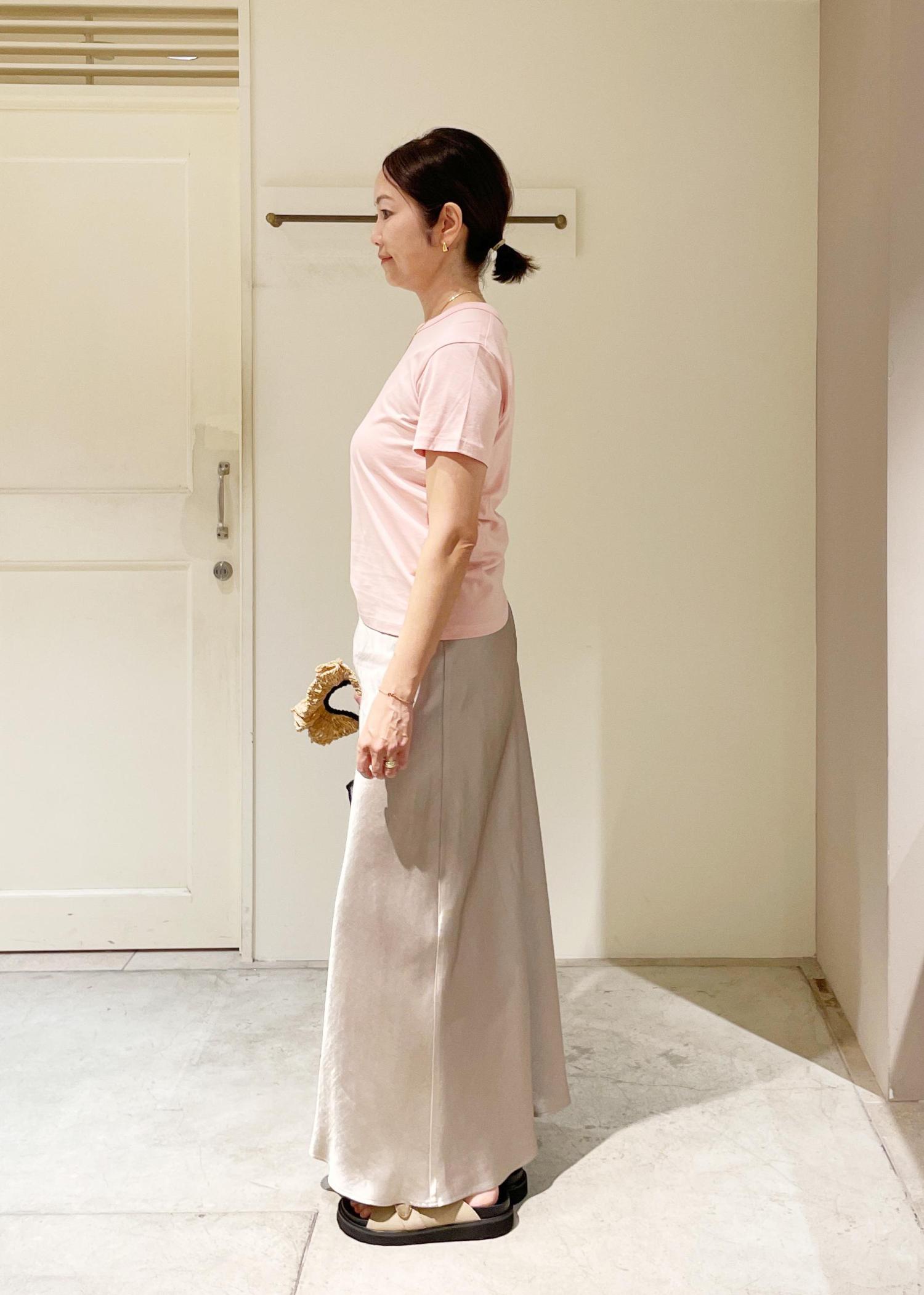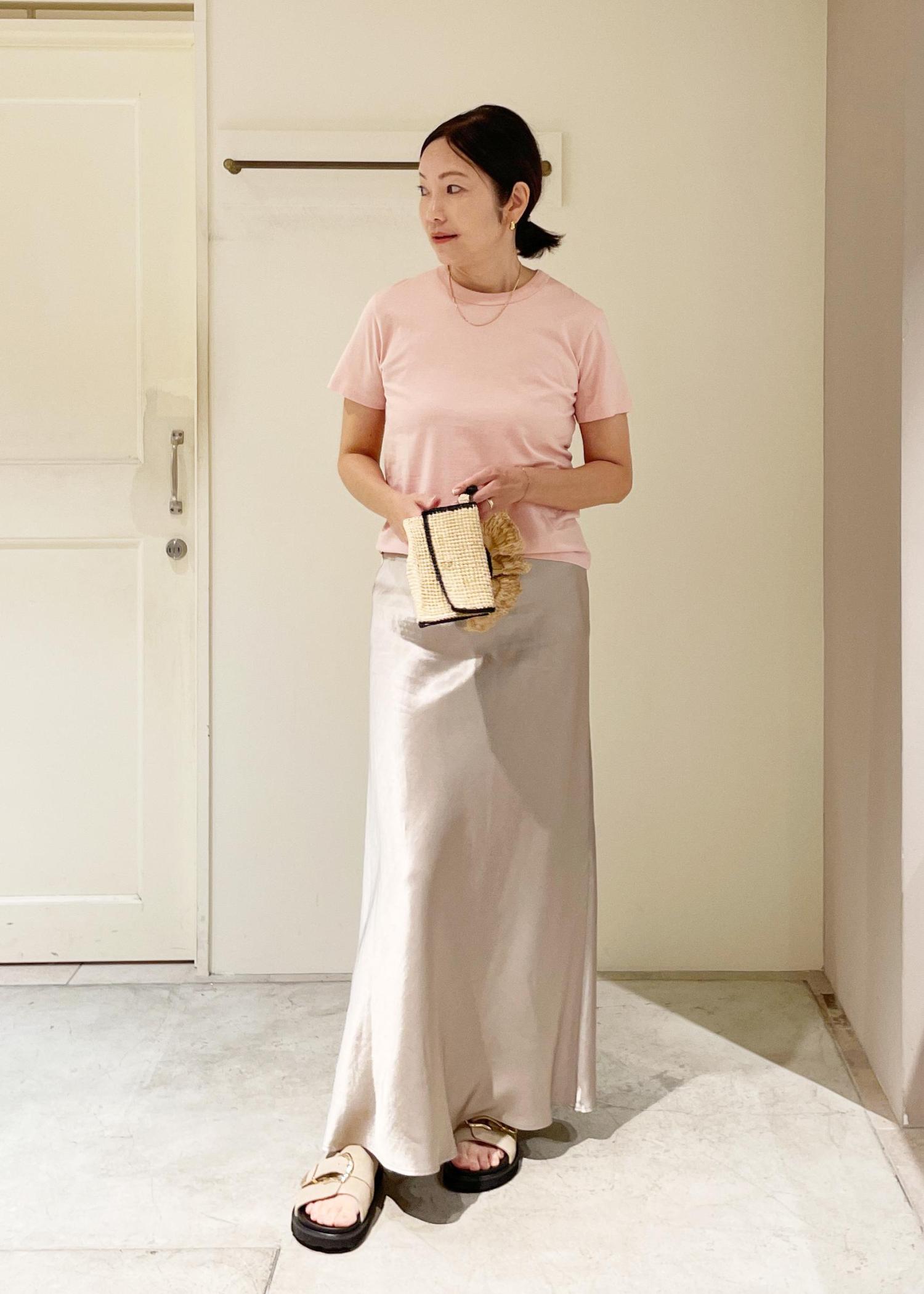 サテン素材のフレアスカートを合わせて、女性らしく上品な印象に。