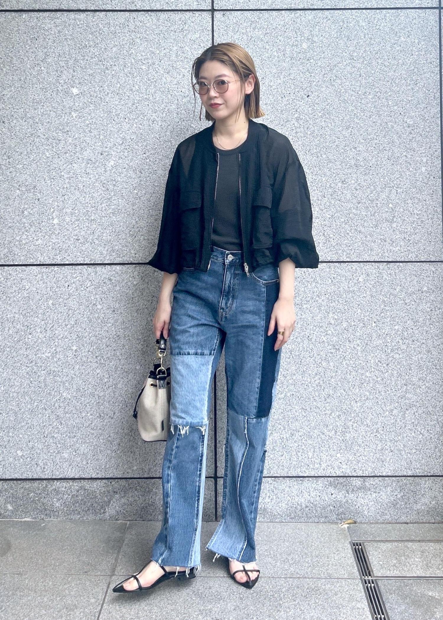 華やかなリメイクデニムと合わせて、大人カジュアルな雰囲気にまとめました。