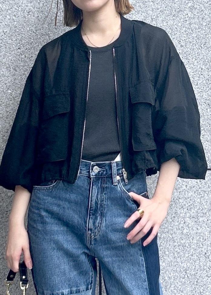 シアー感強めなので、ブラックでも重たすぎず、モードな雰囲気にまとまるアイテム。