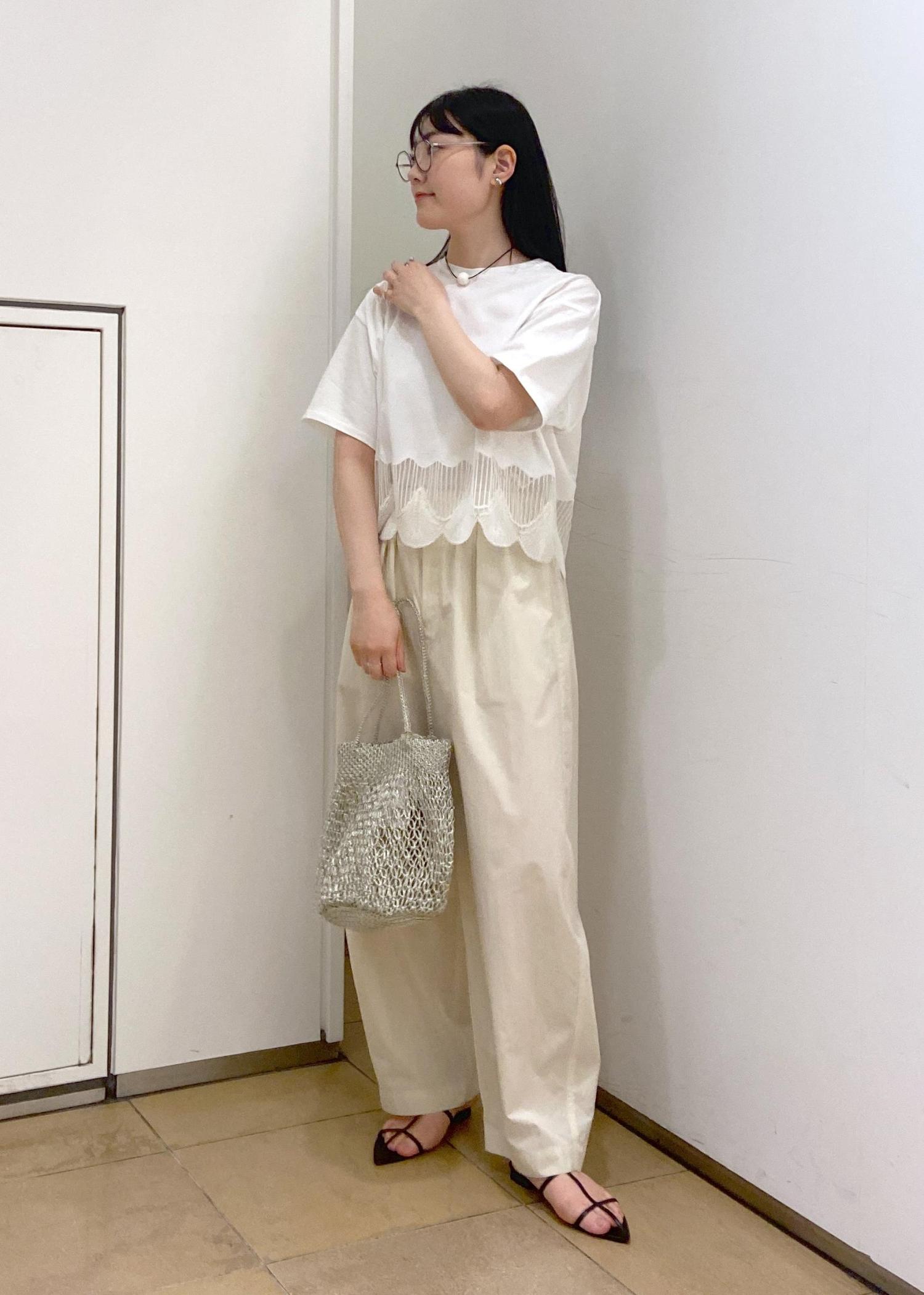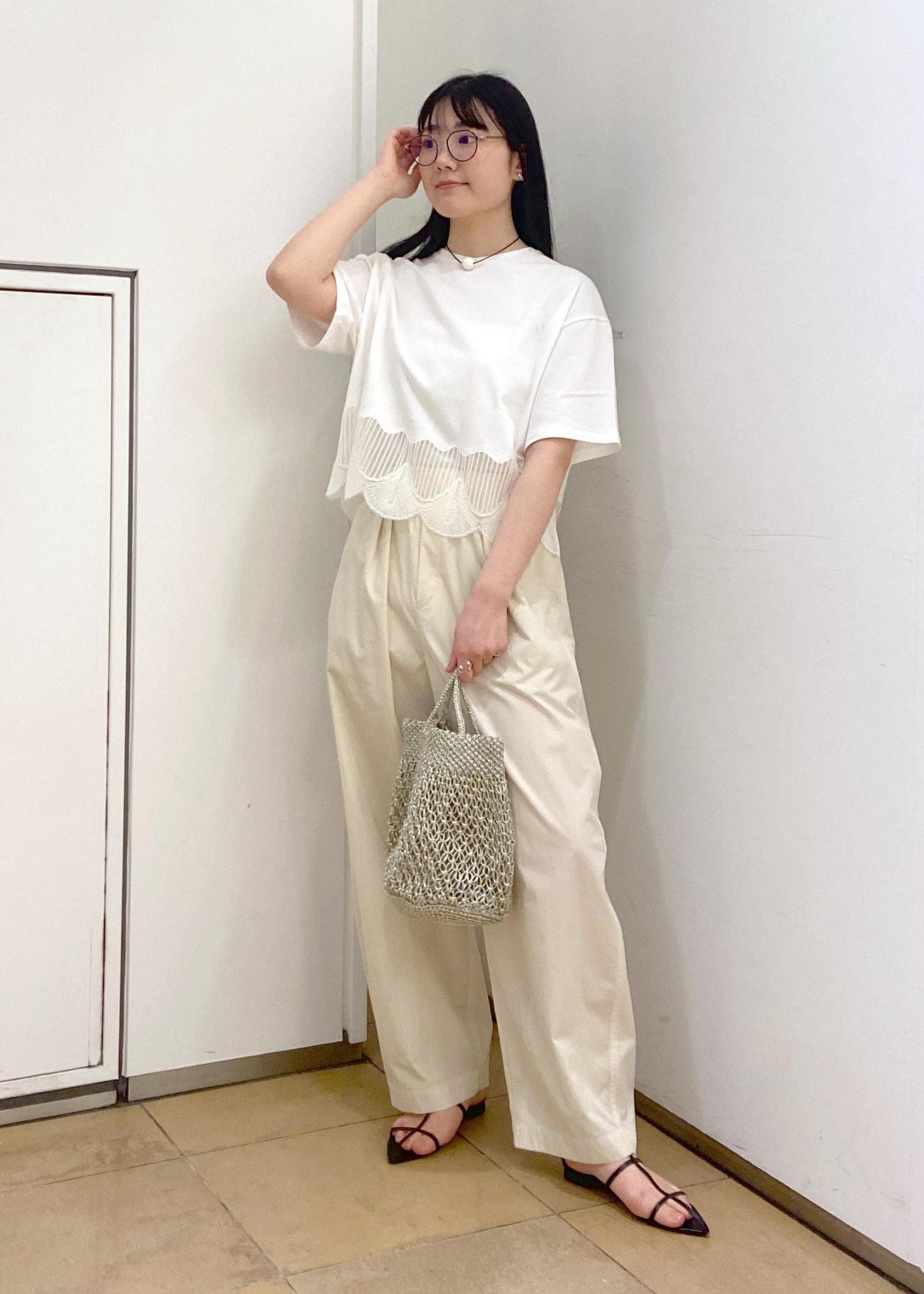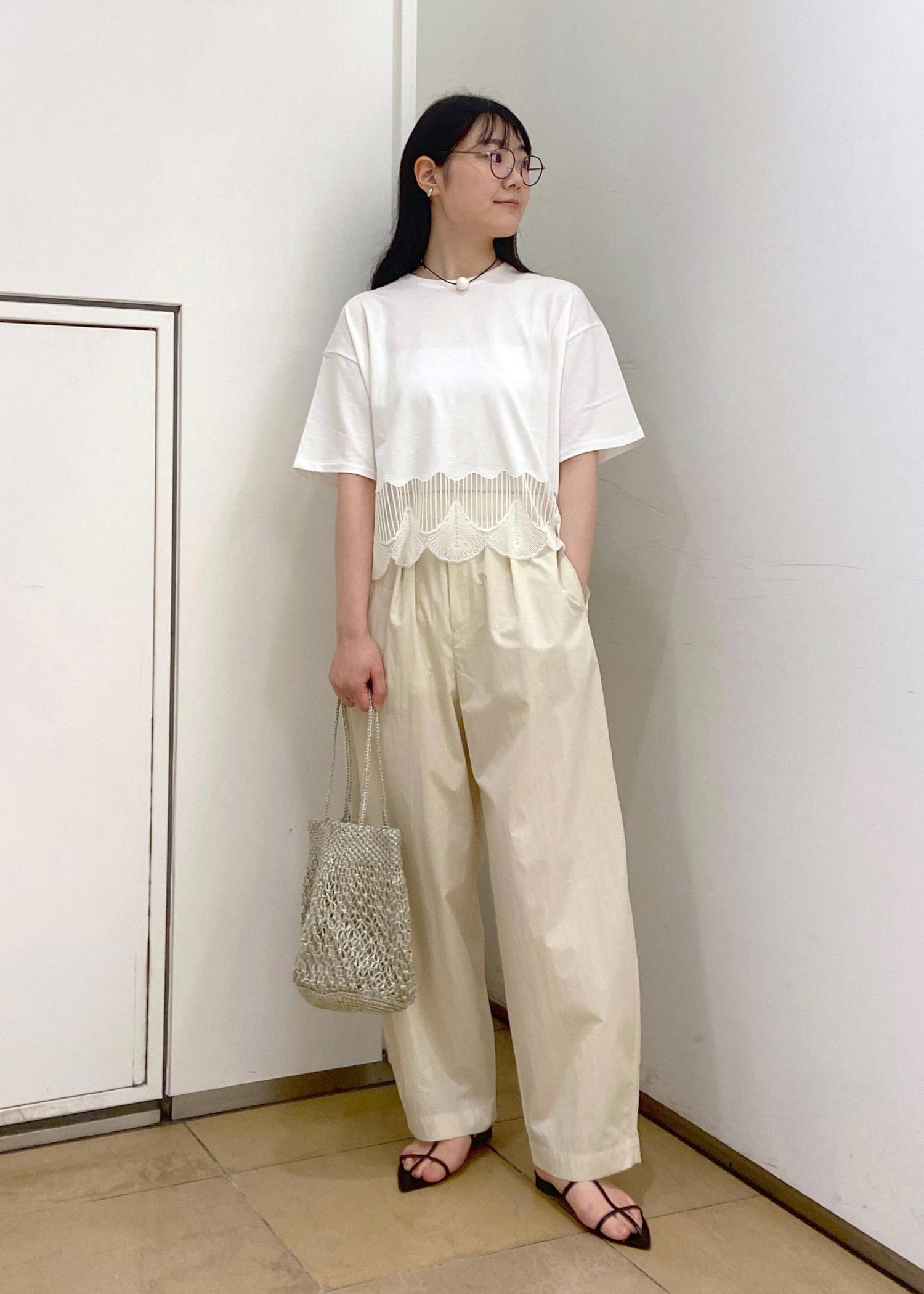 Tシャツの気軽さがありながら、チュール部分に繊細な刺繍が施されているので、1枚でも映えるトップスです。