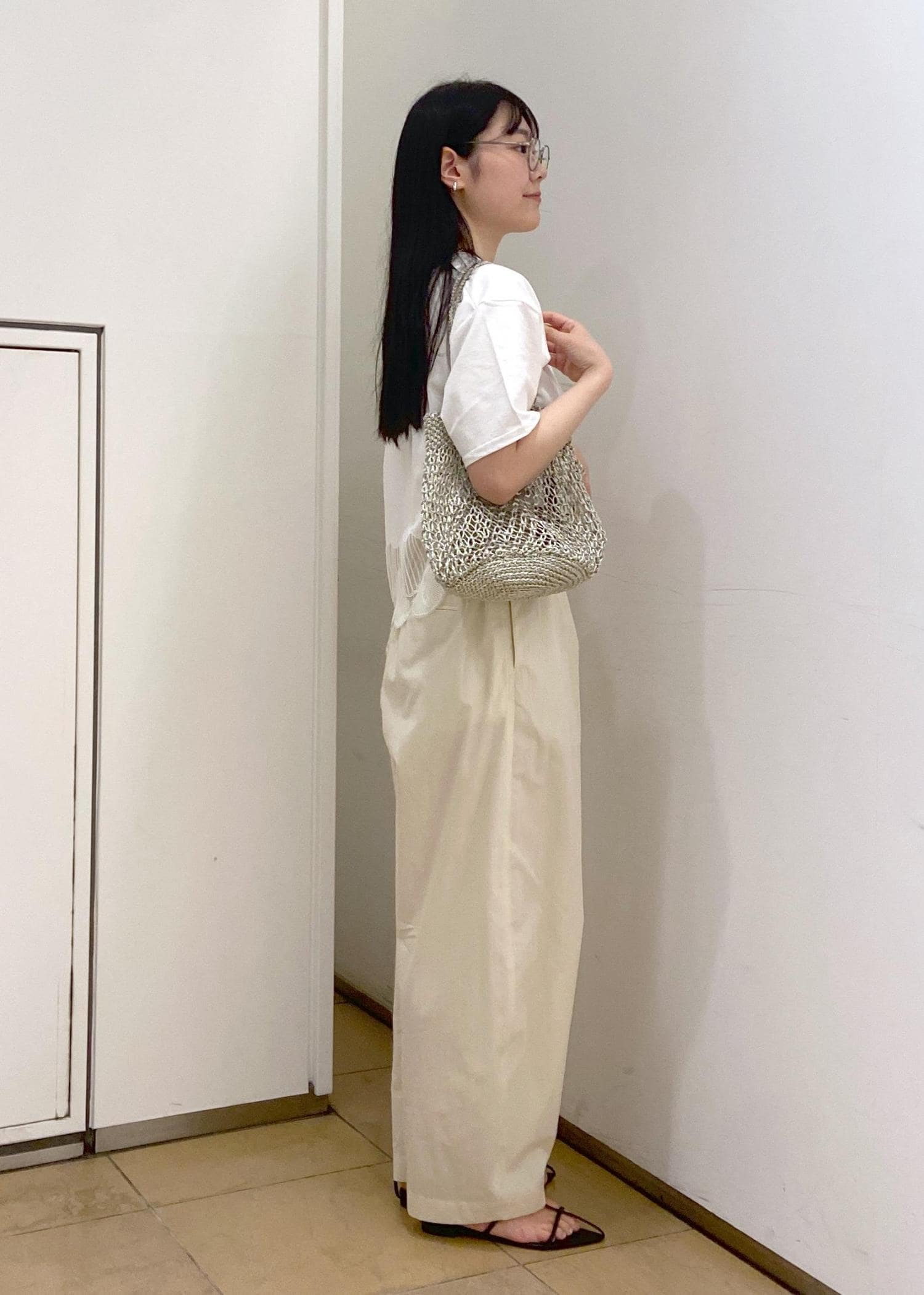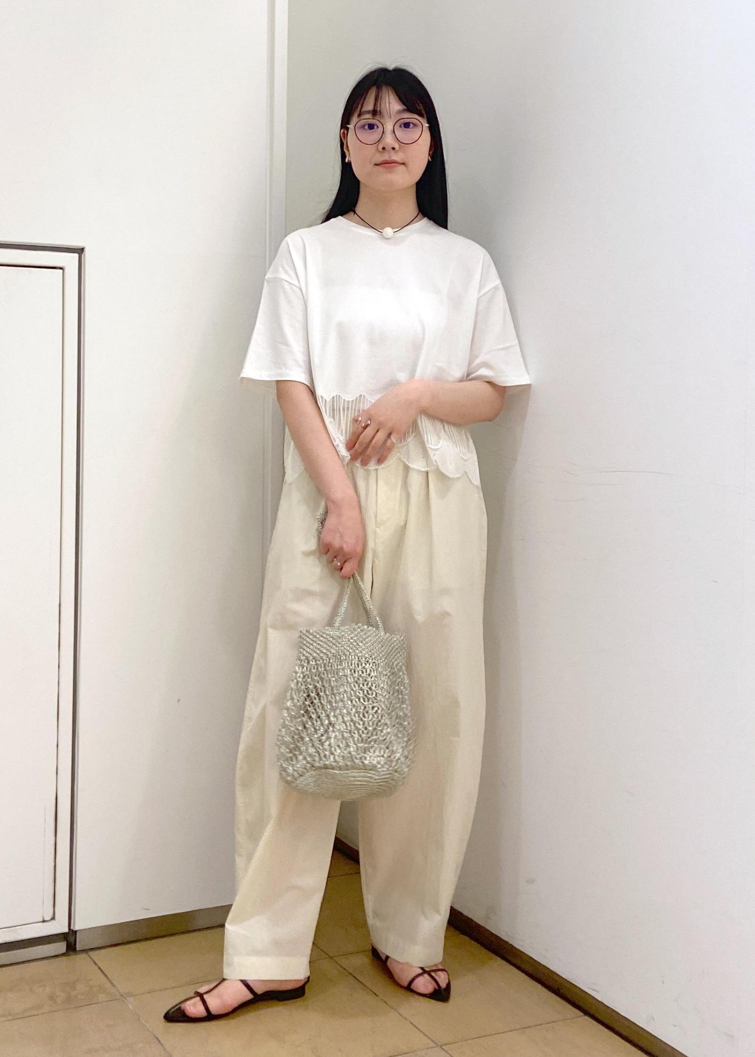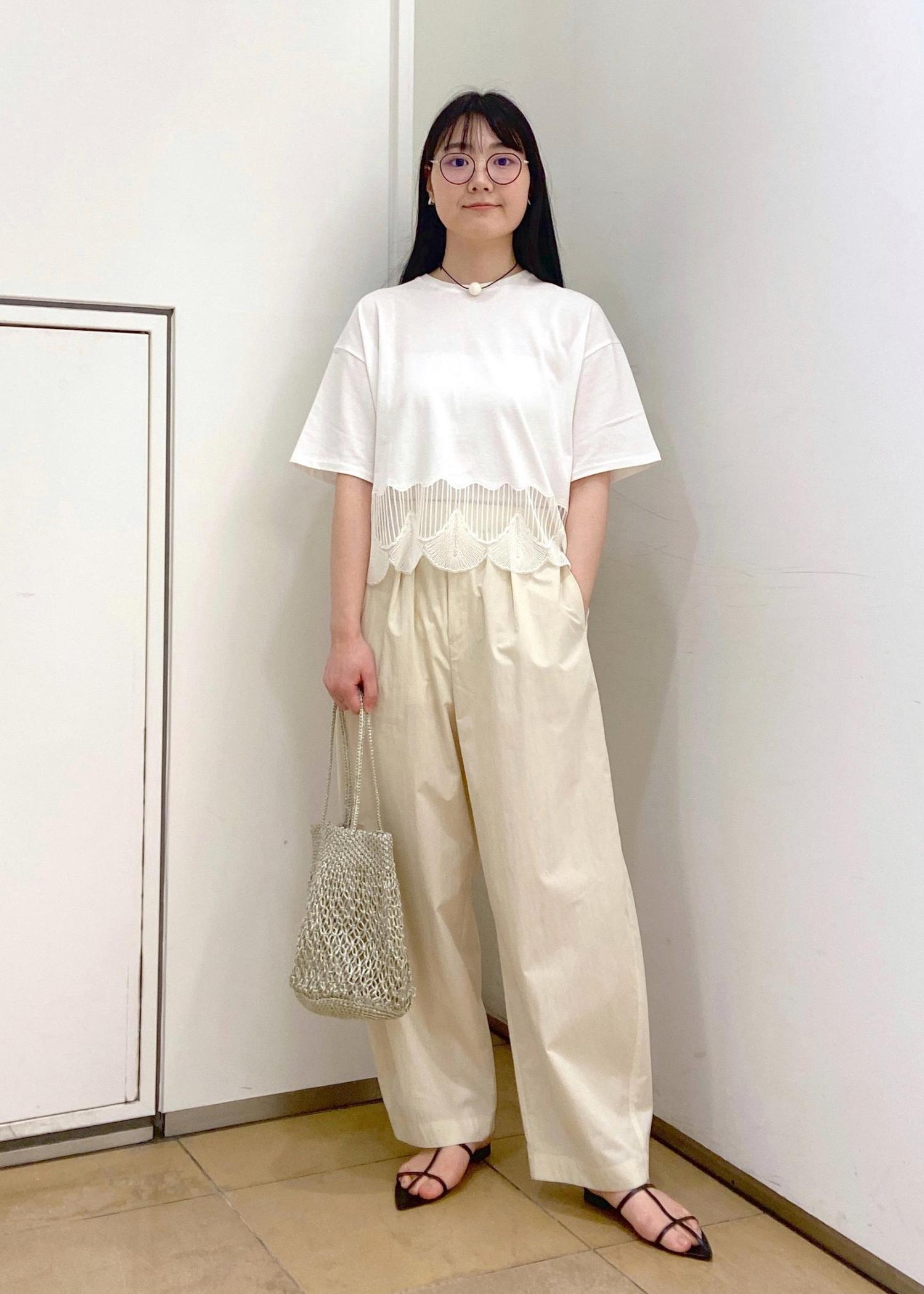 Tシャツの気軽さがありながら、チュール部分に繊細な刺繍が施されているので、1枚でも映えるトップスです。