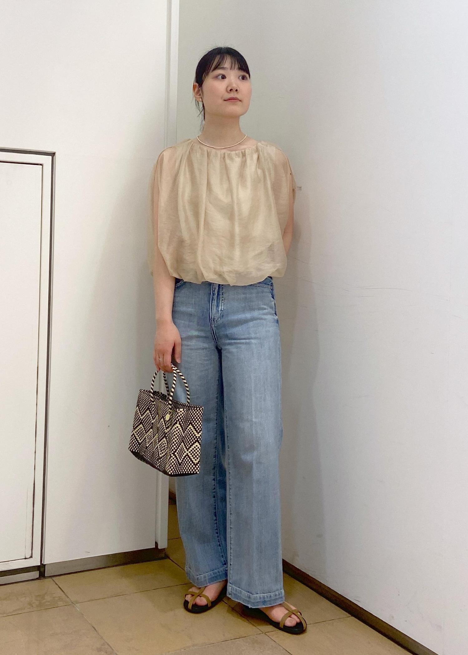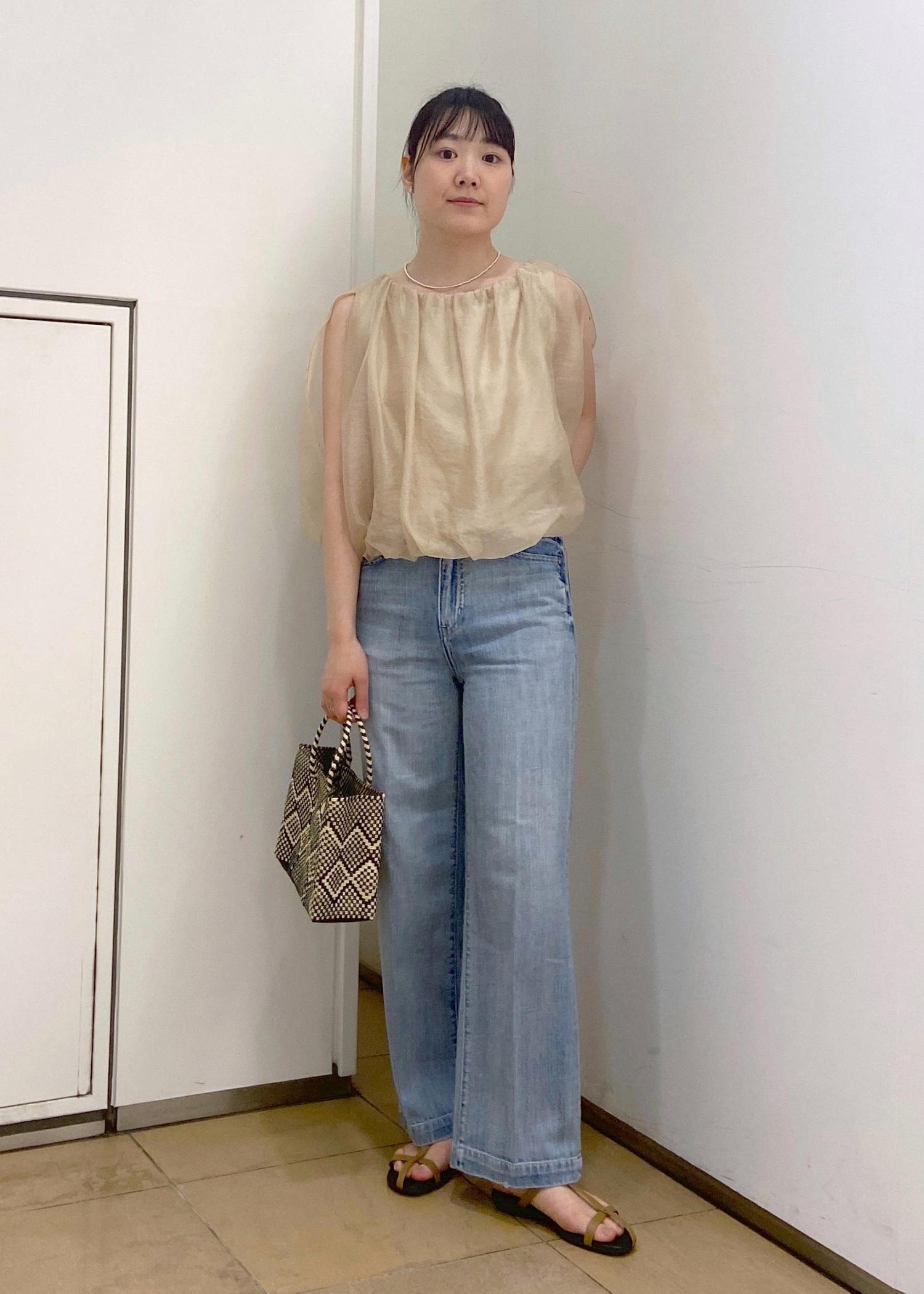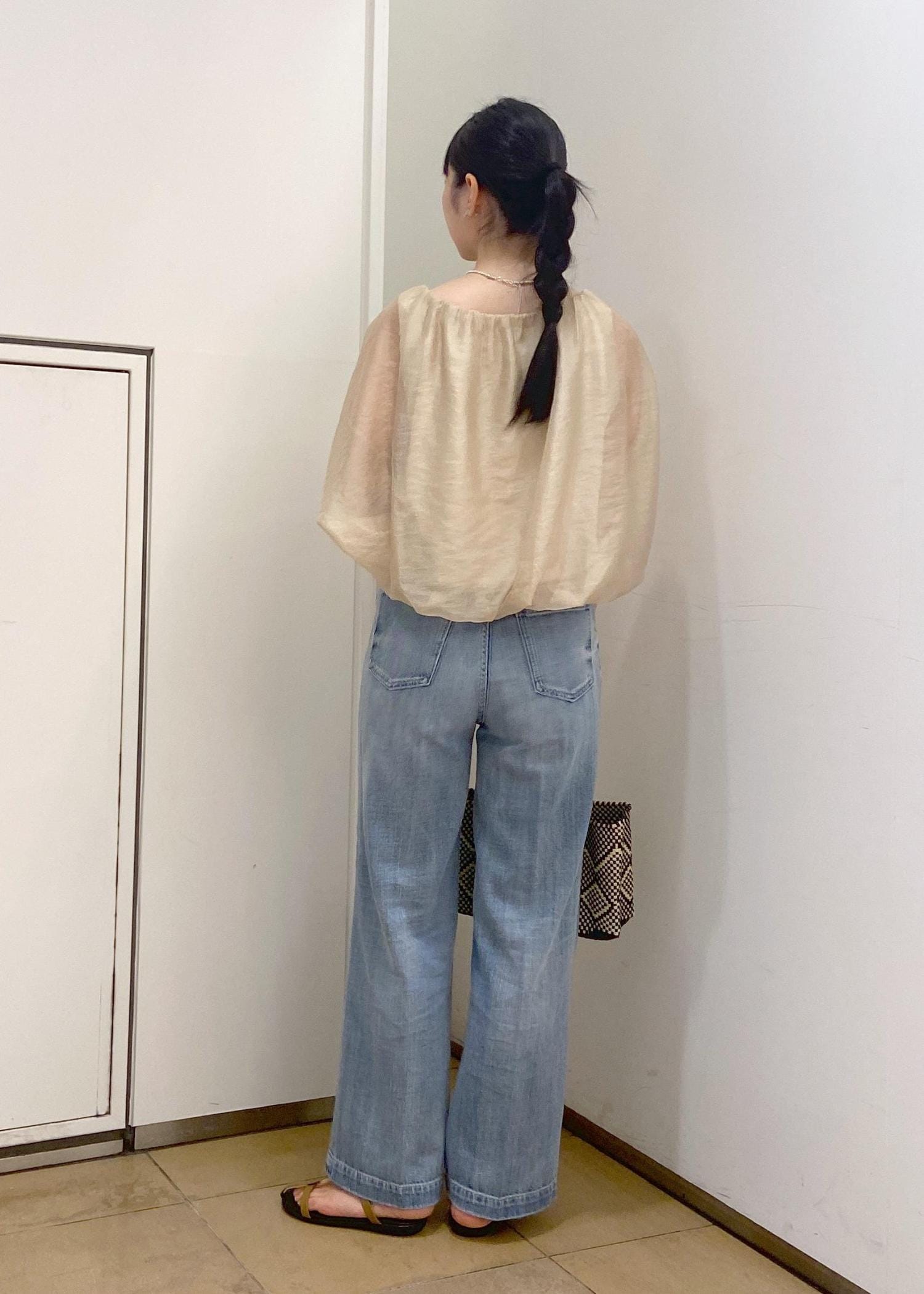 光沢感あるオーガンジー素材なので、デニムでカジュアルダウンさせたスタイリングにしました。