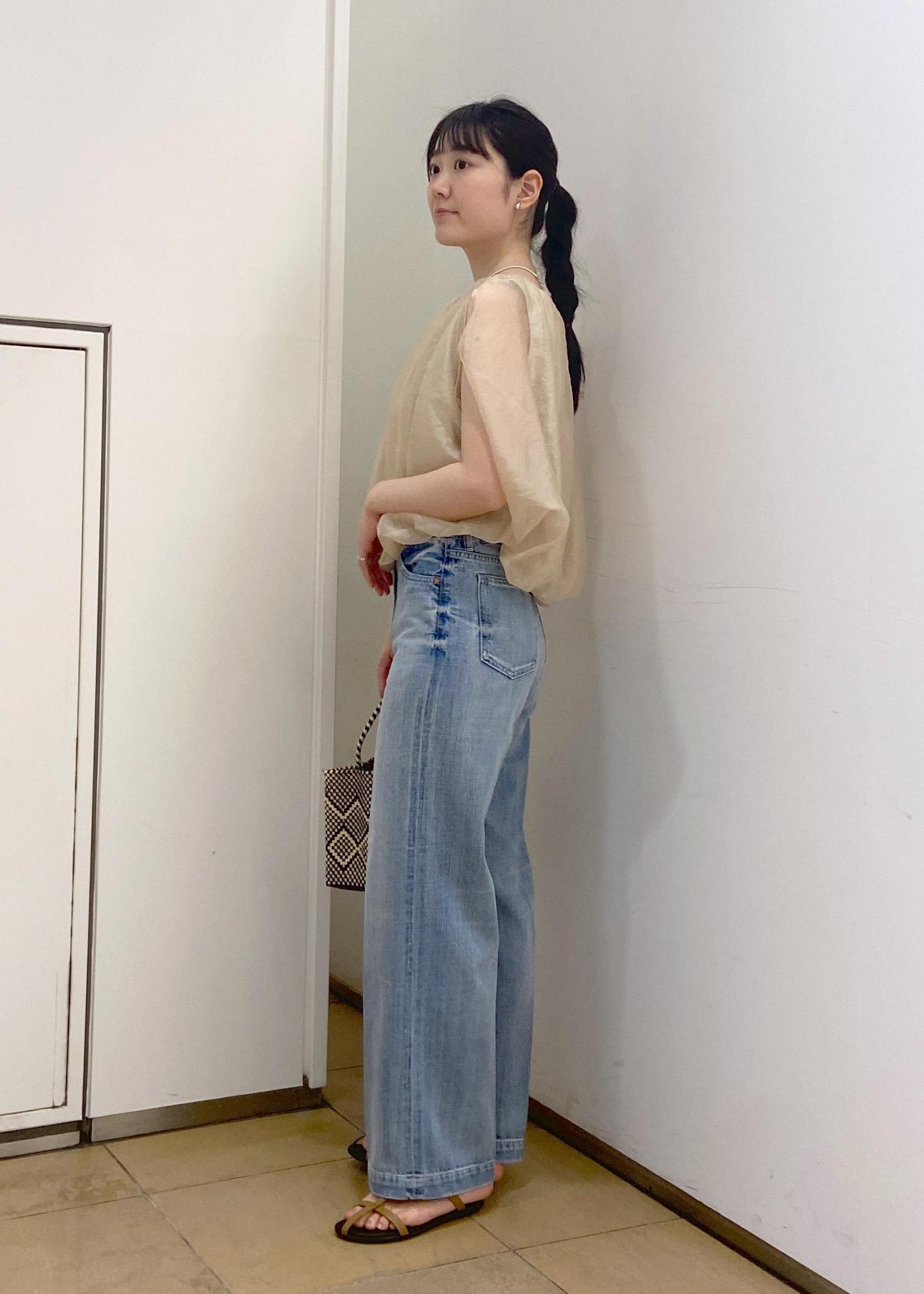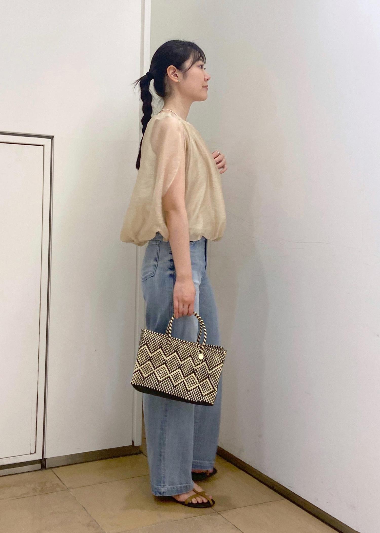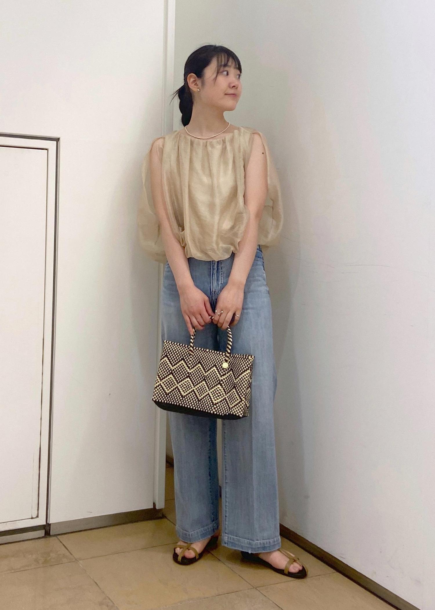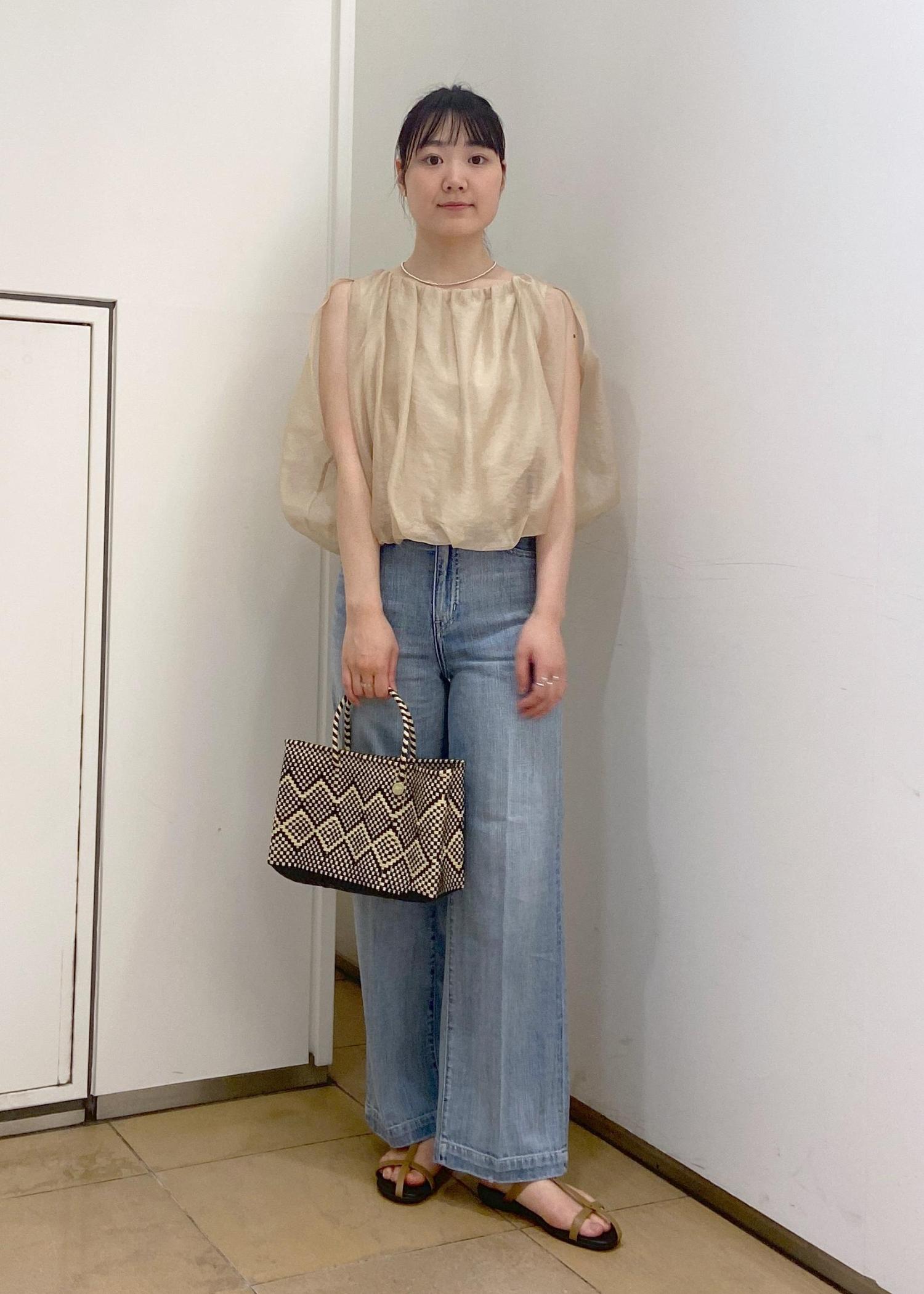 光沢感あるオーガンジー素材なので、デニムでカジュアルダウンさせたスタイリングにしました。