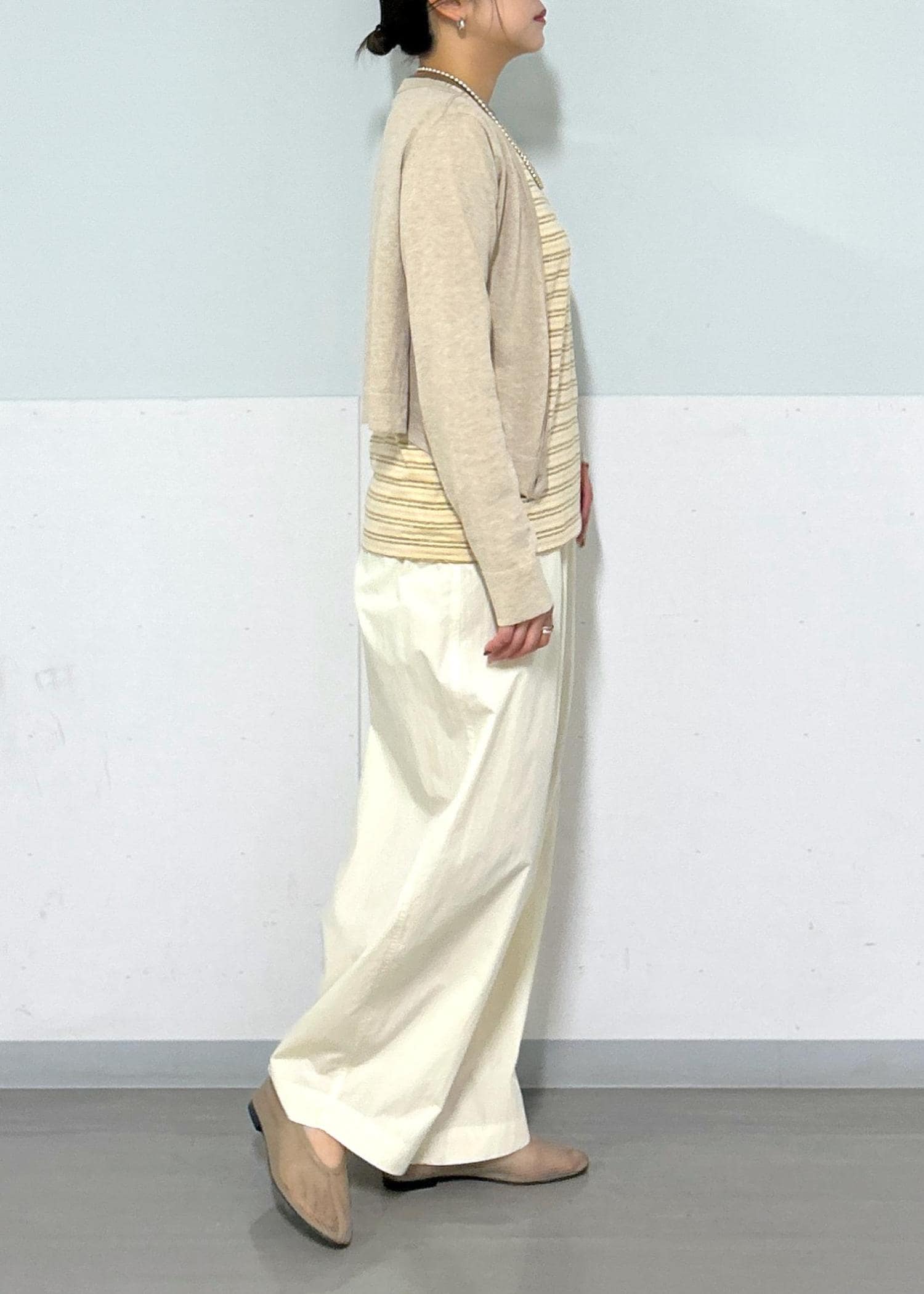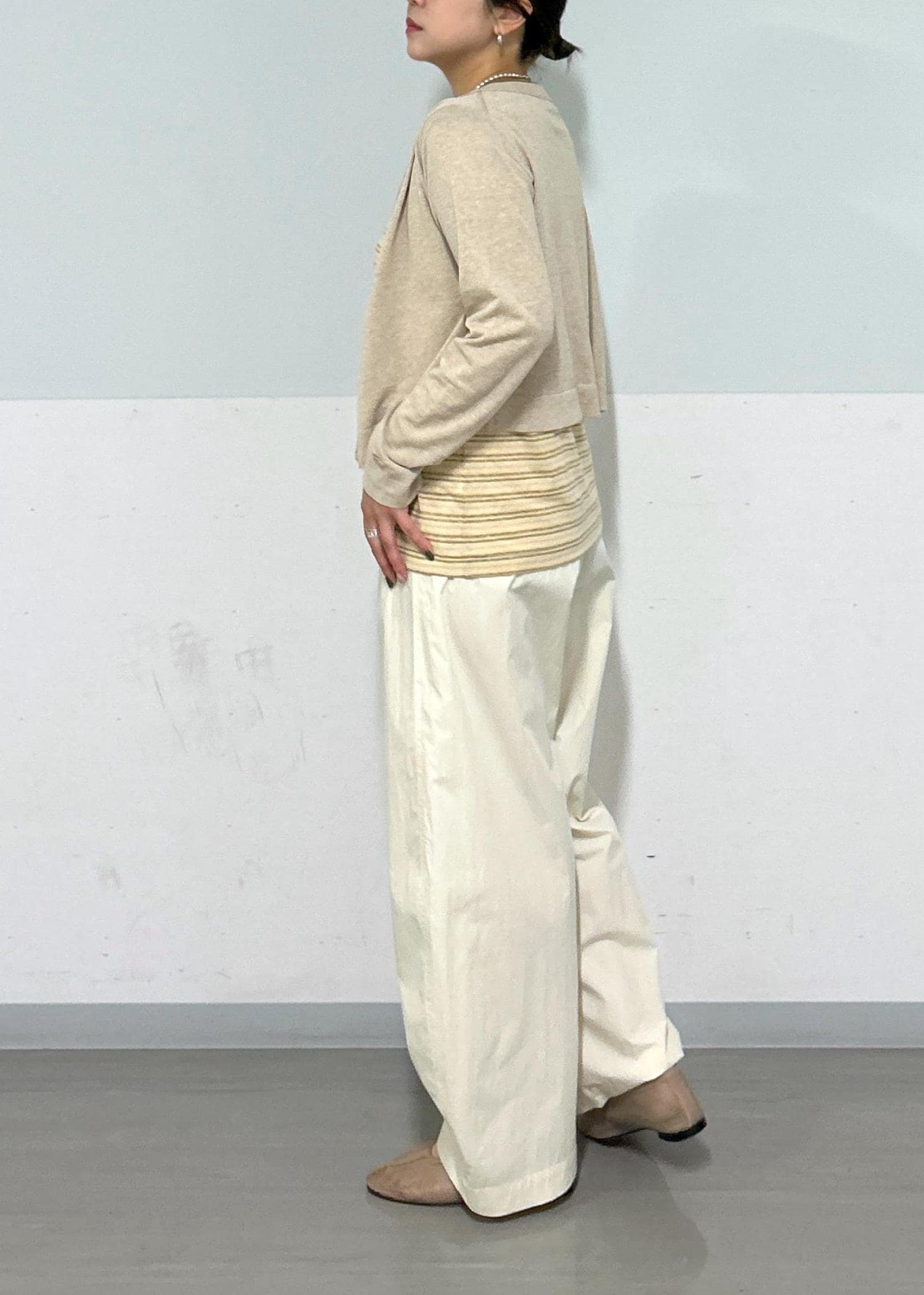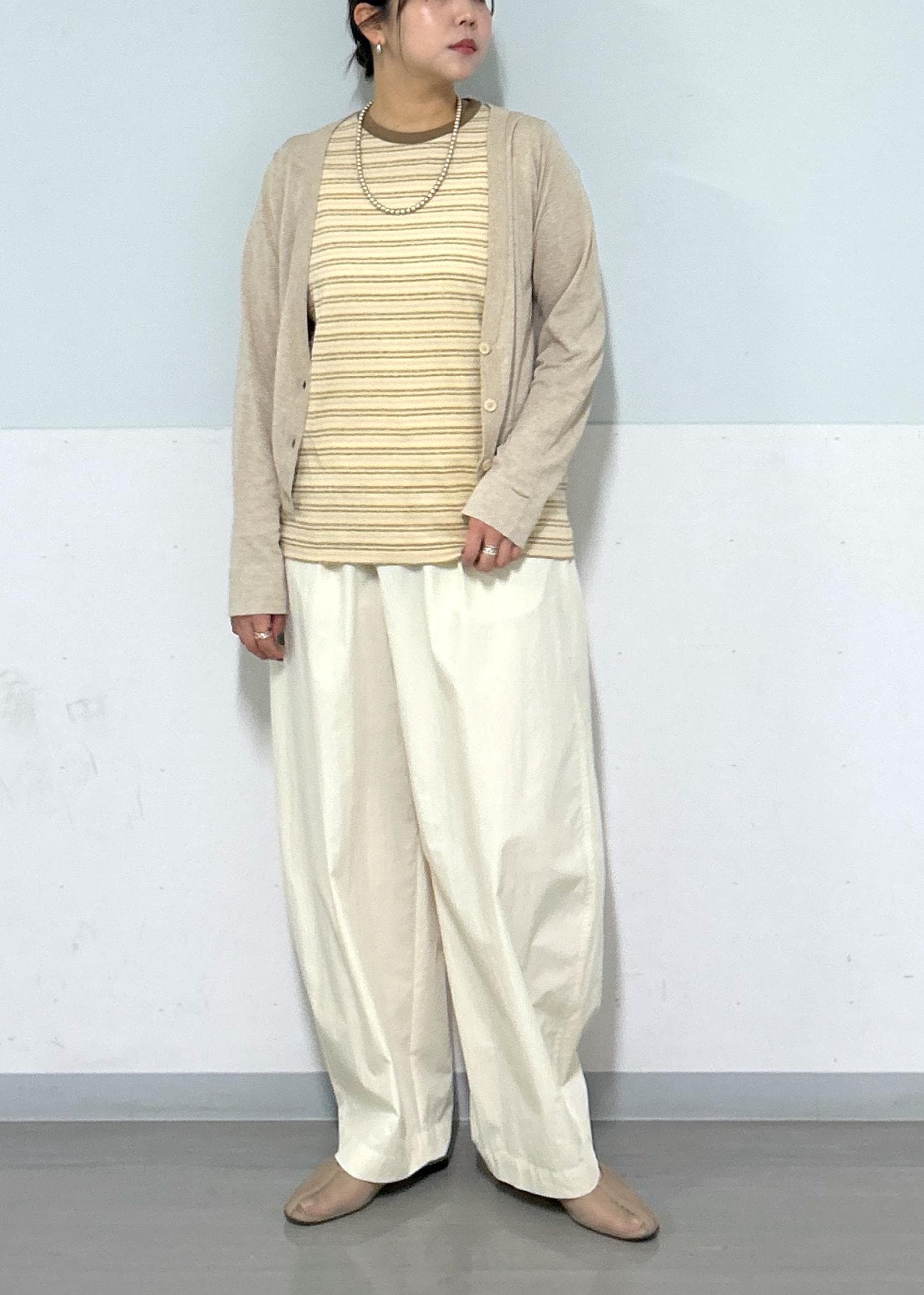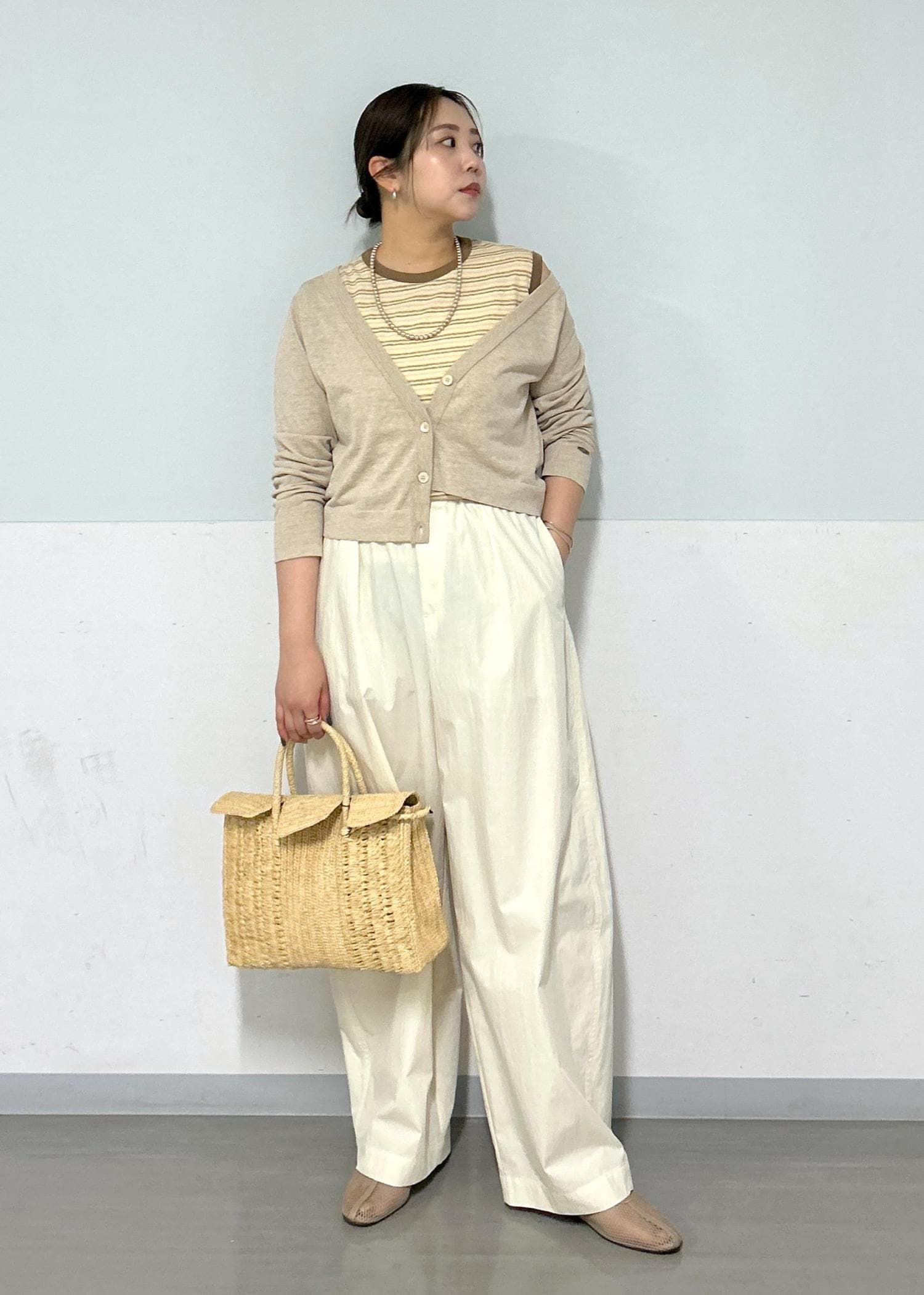 ボーダーを取り入れた柔らかいベージュコーデ。
