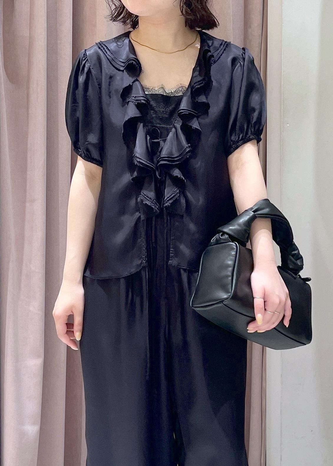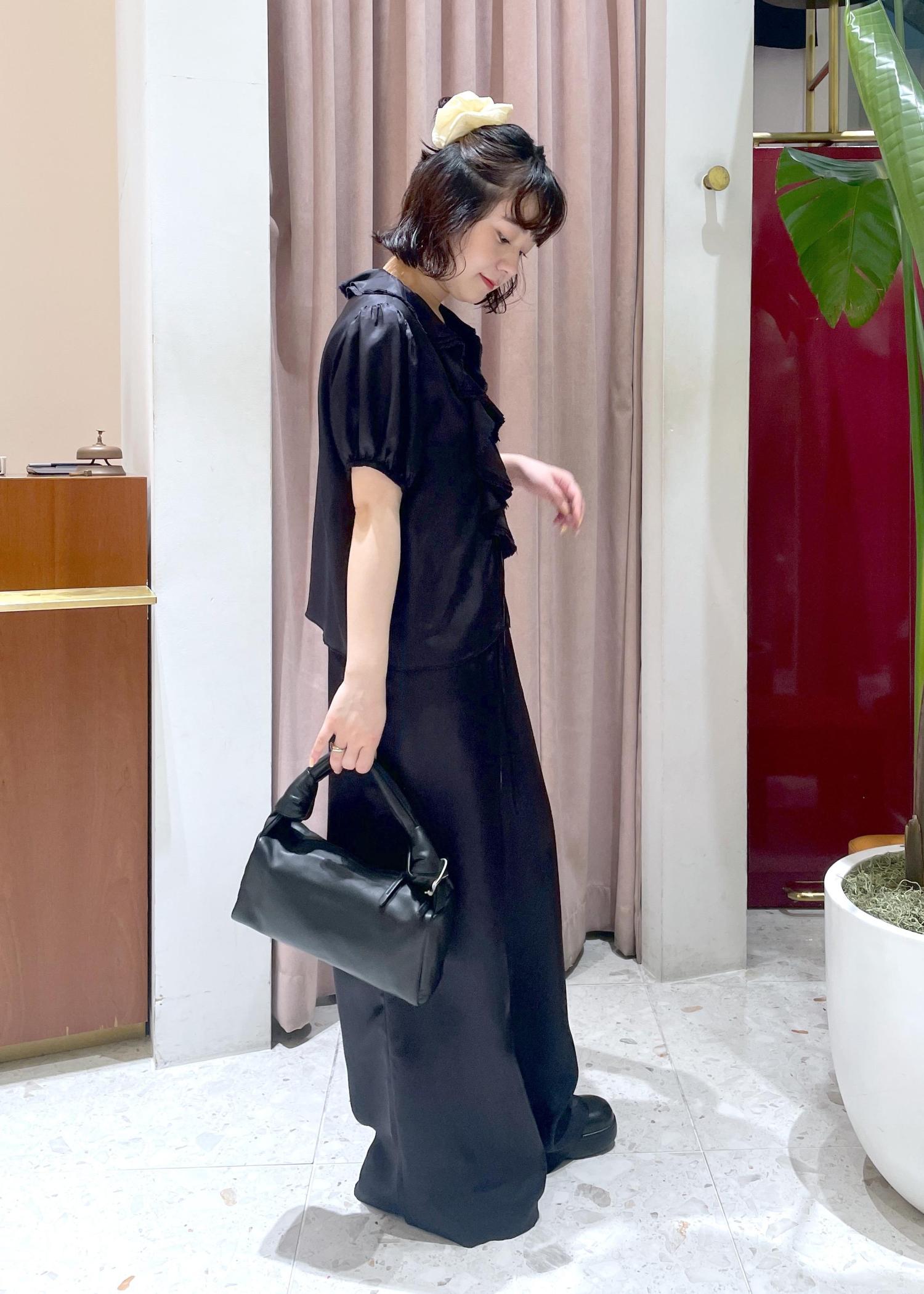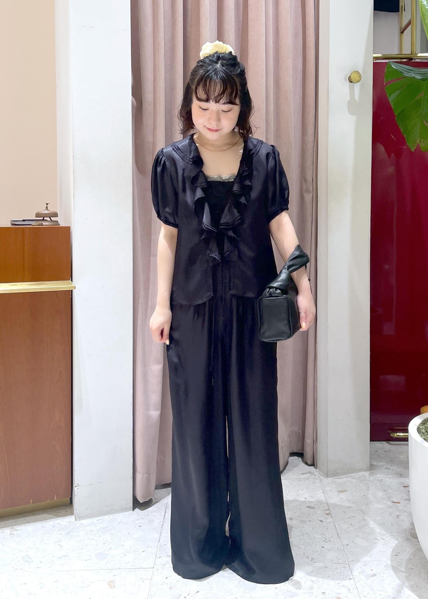 光沢なある生地は落ち感が良く、動くととても綺麗です!レースとフリルでどちらも可愛い印象ですが、ダークトーンなので大人の方にももちろんおすすめのスタイリングです◎