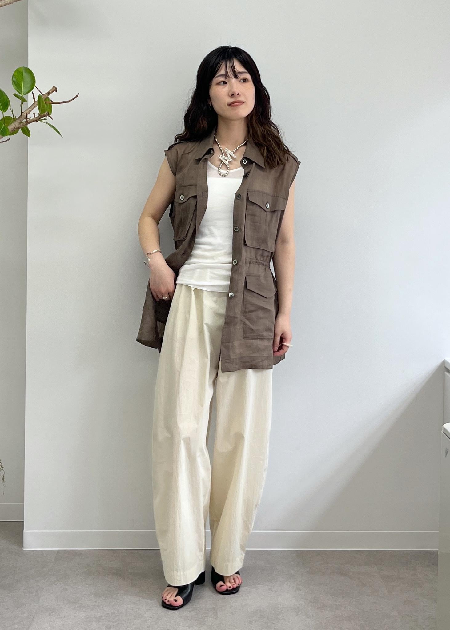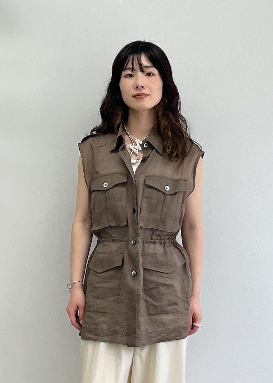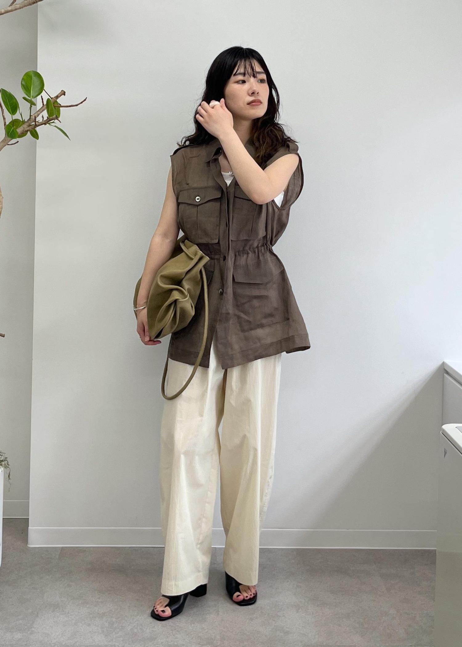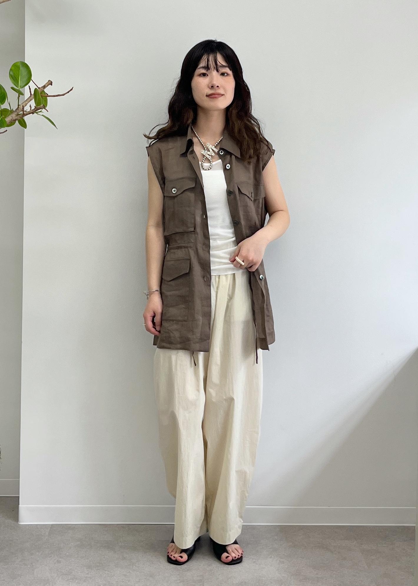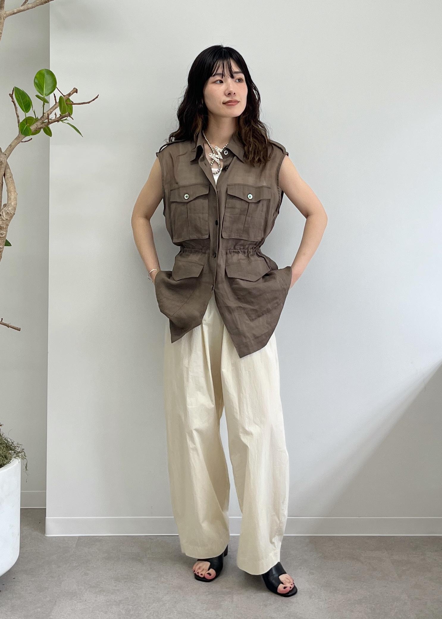 ハリと光沢感のあるリネン素材。カジュアルなミリタリージレですが、上品な雰囲気で着こなせます。 -