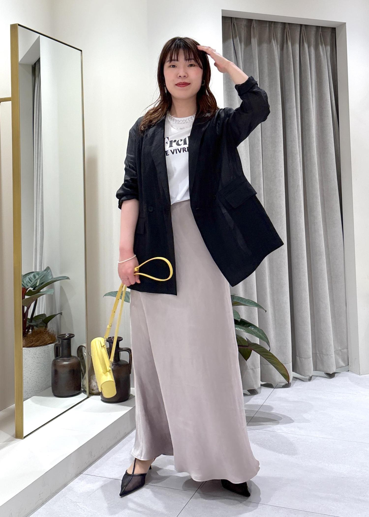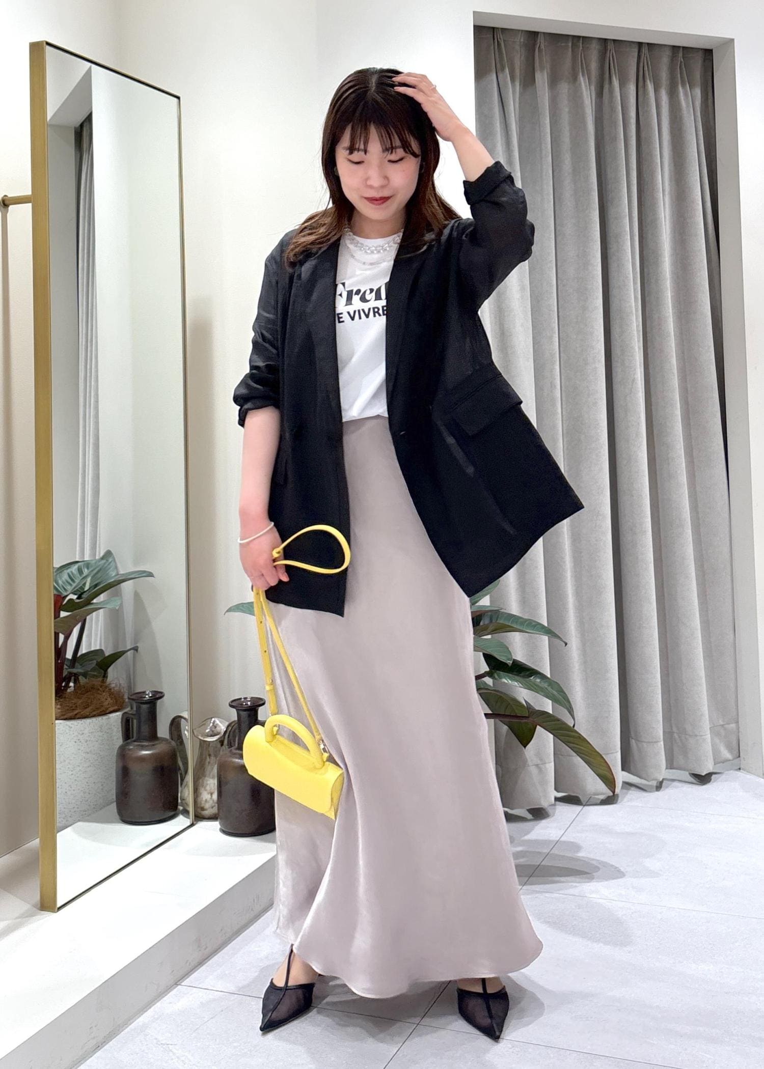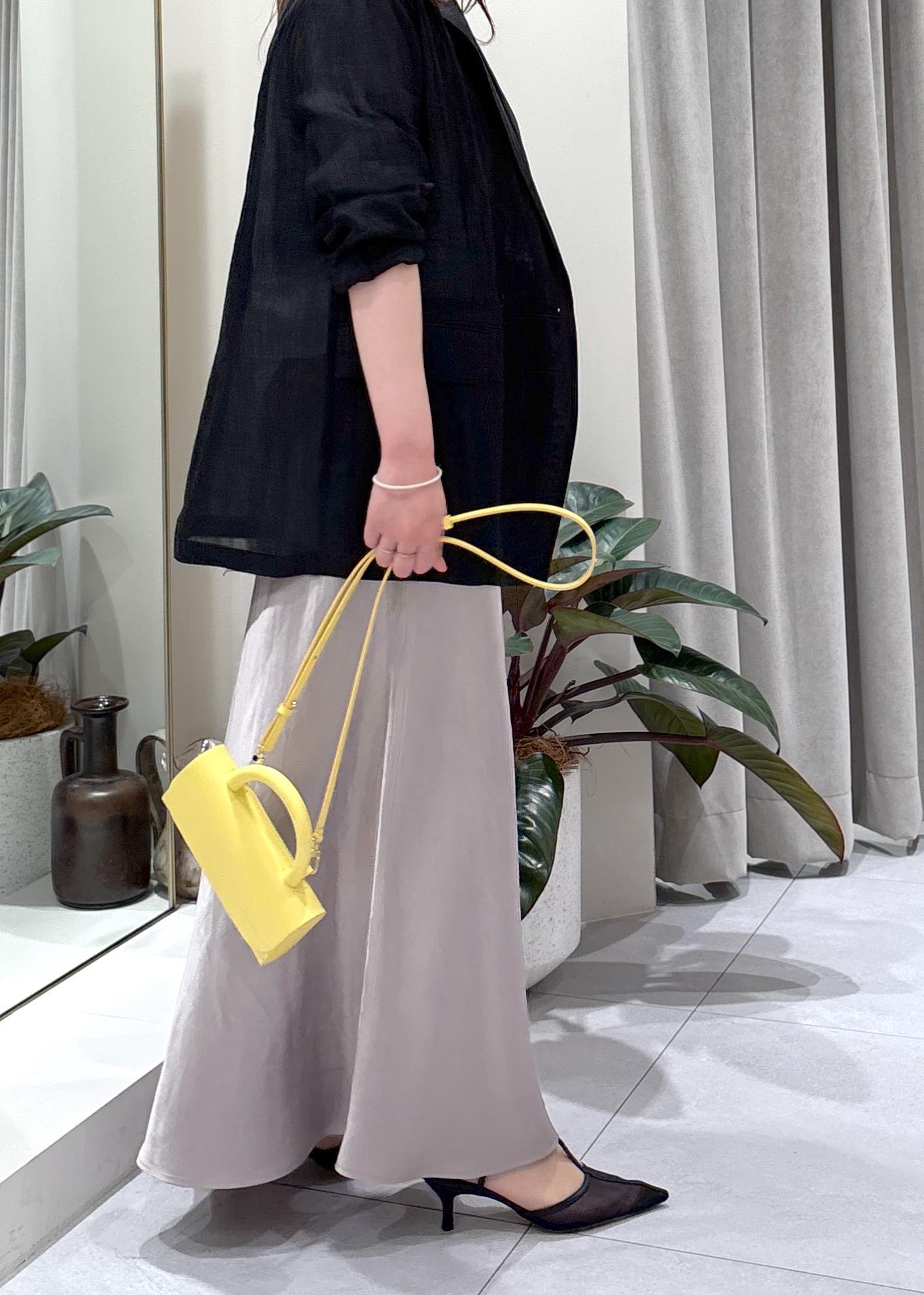 光沢感のあるフレアスカートは、何とあわせてもワンランク上の見え方になるので、1枚持っておくと様々なシーンで使えるのでおすすめです。
