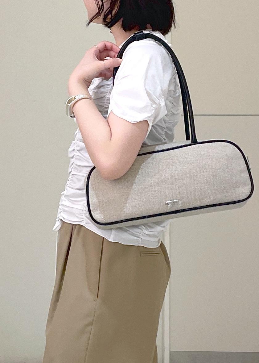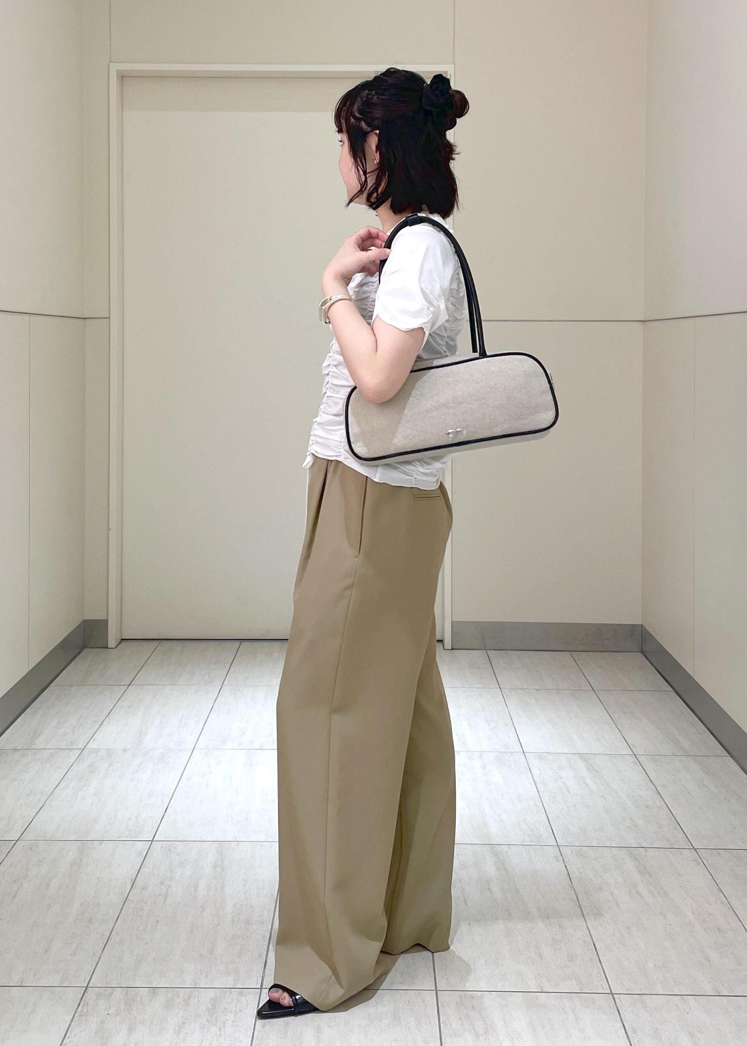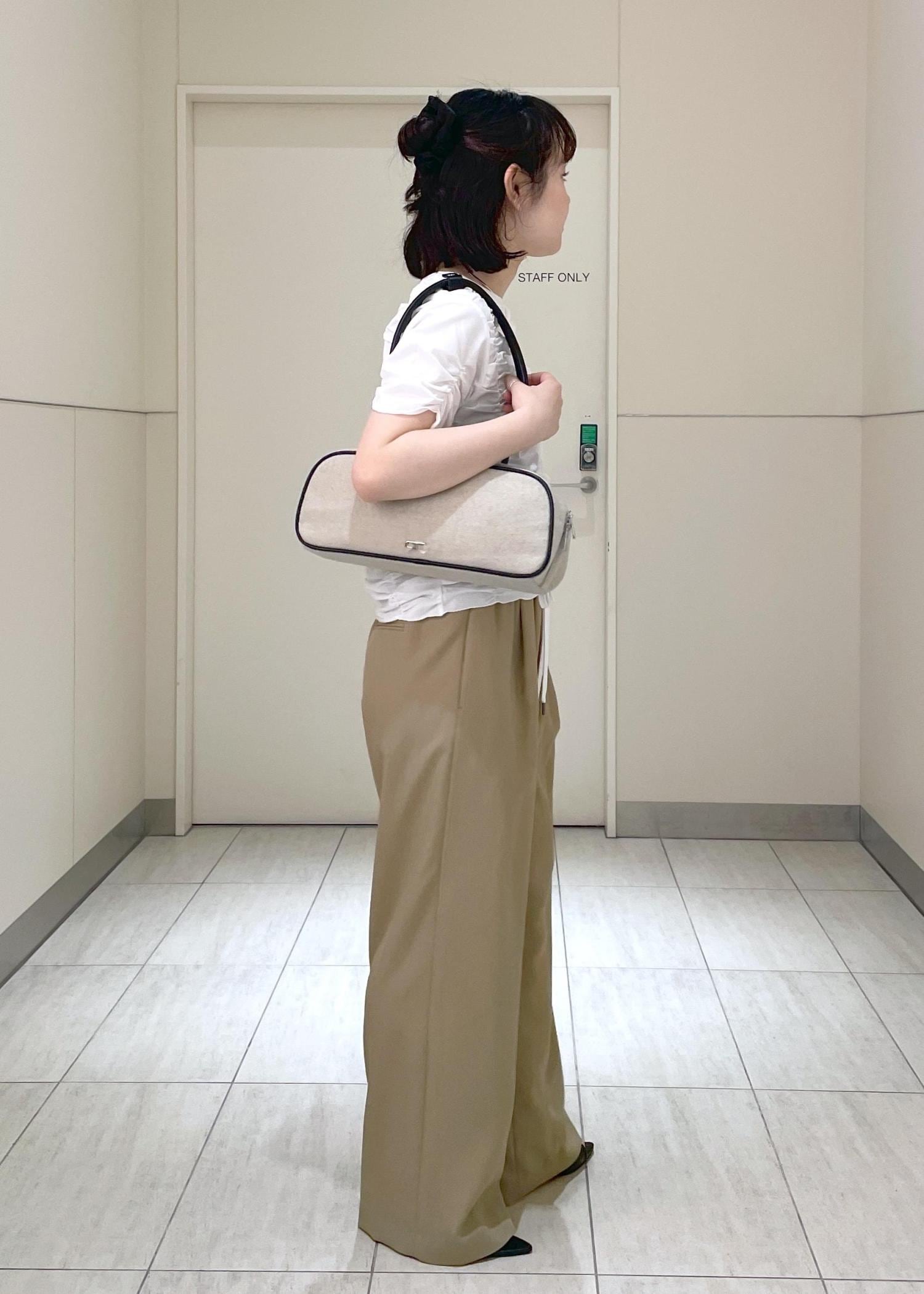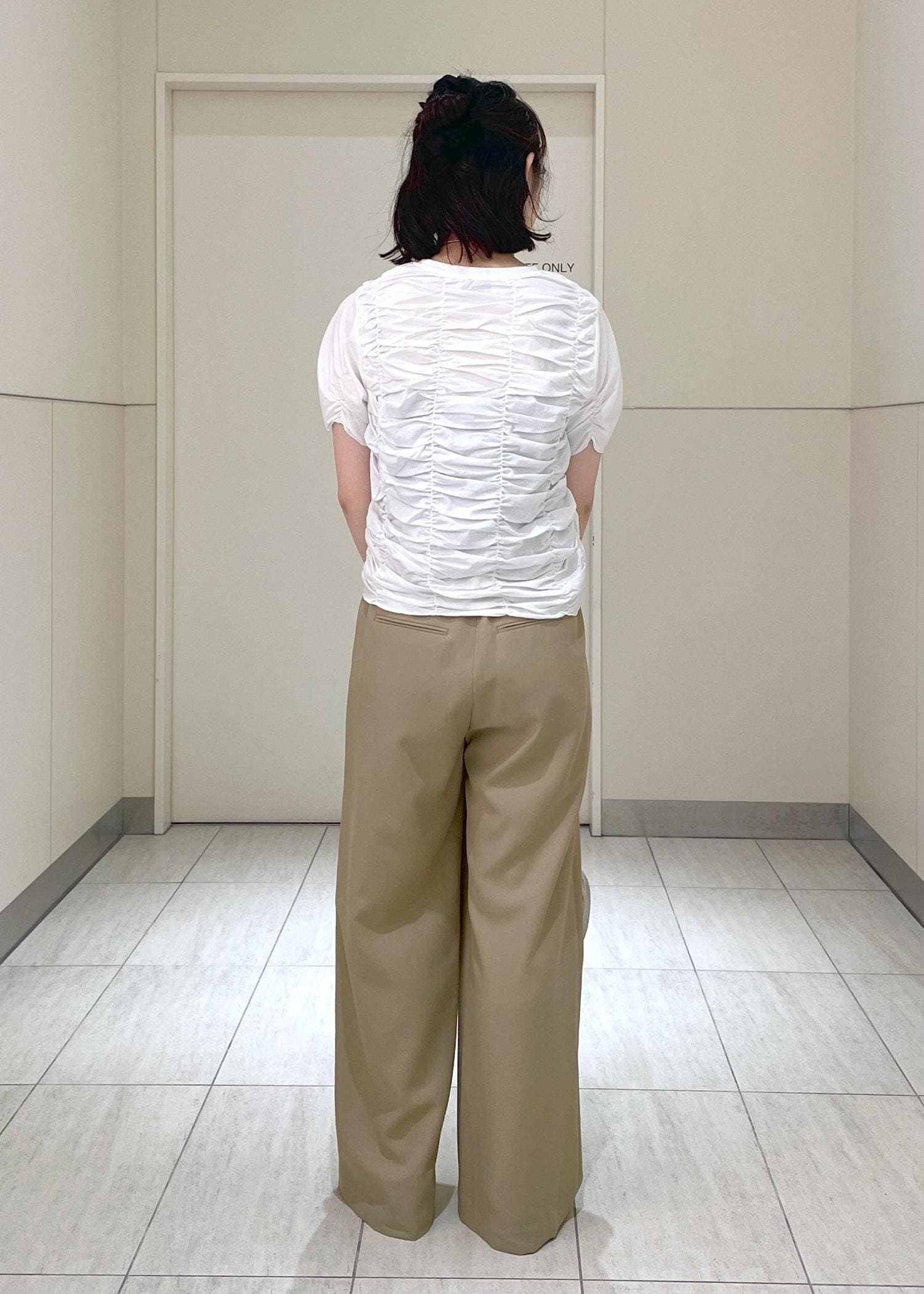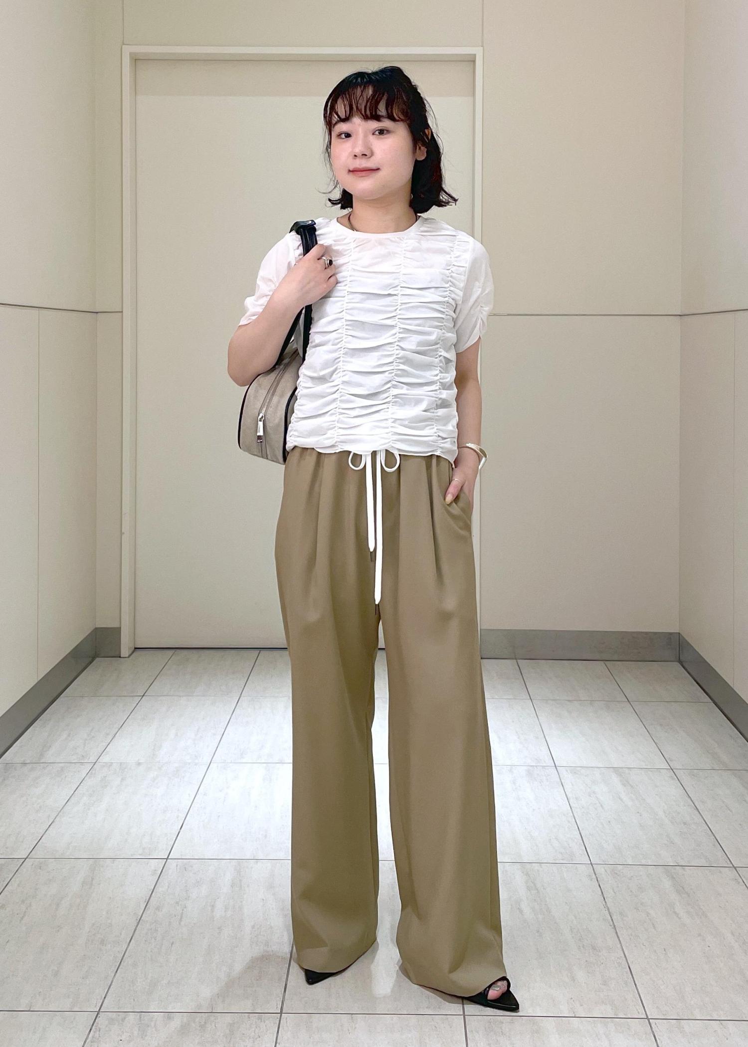 こちらのトップスはカットソーのような生地で肌触りも良く夏場にぴったりです◎今回はシンプルにベージュのパンツで合わせてみましたが、綺麗めにタックパンツで合わせても可愛いと思います!
