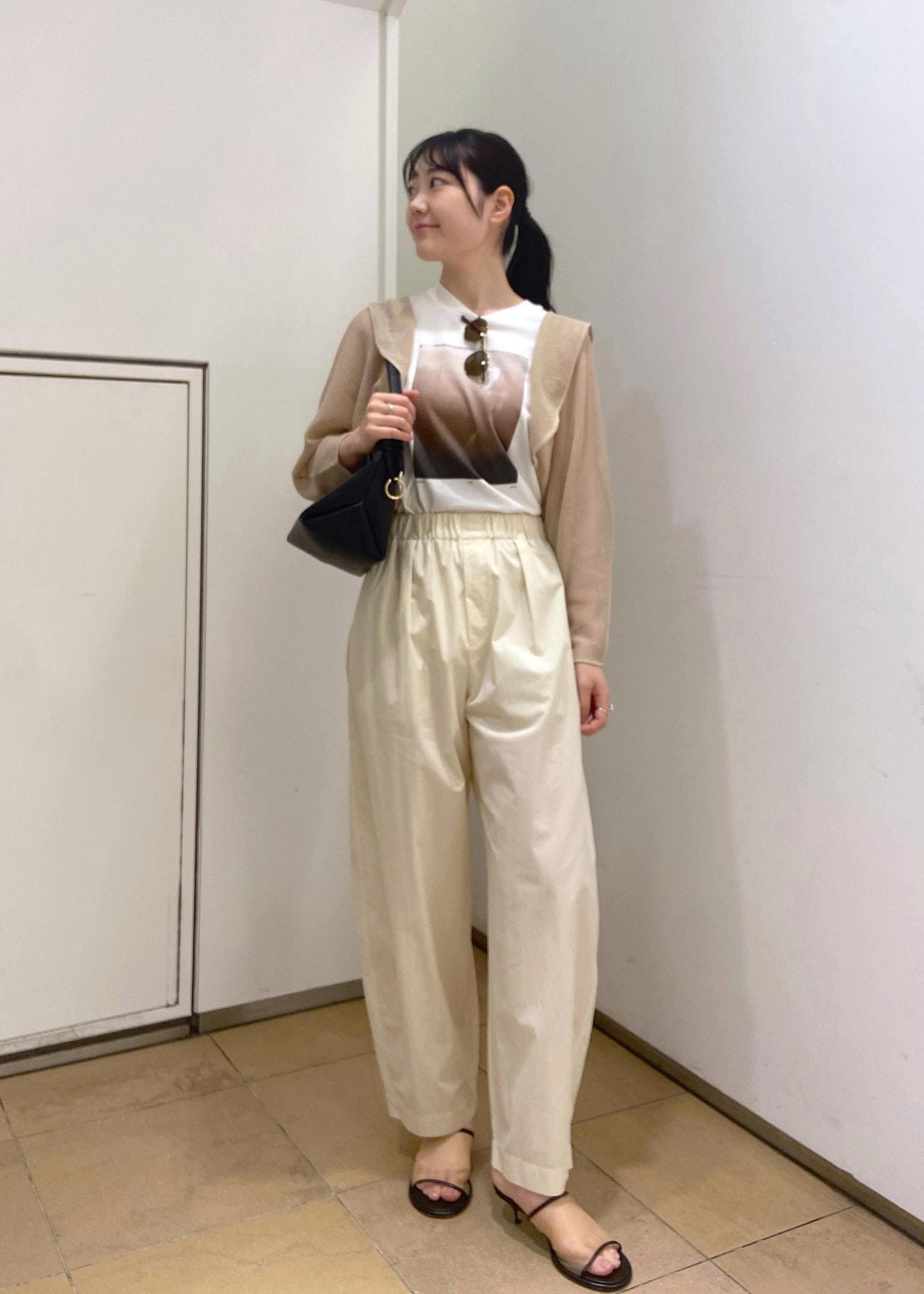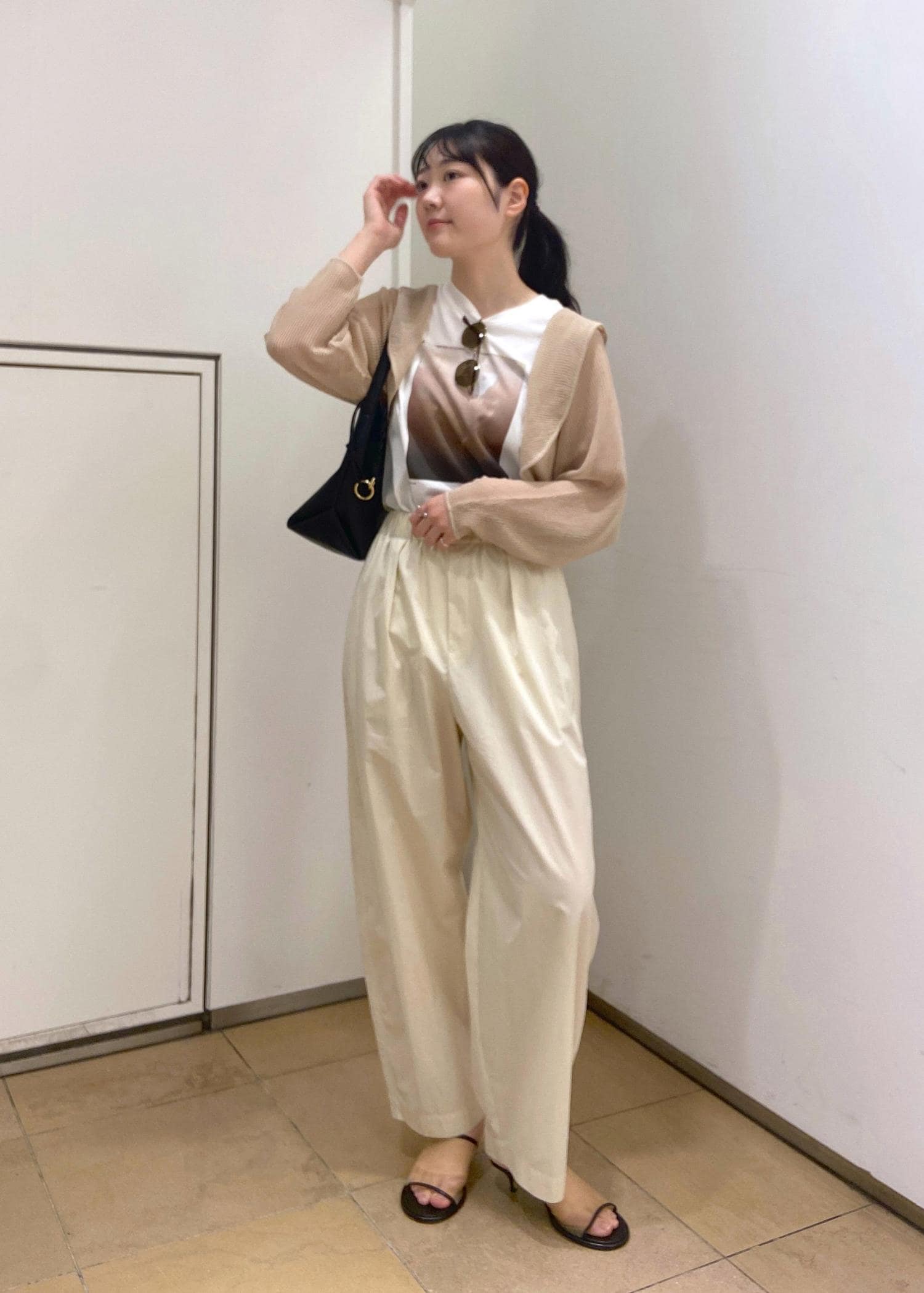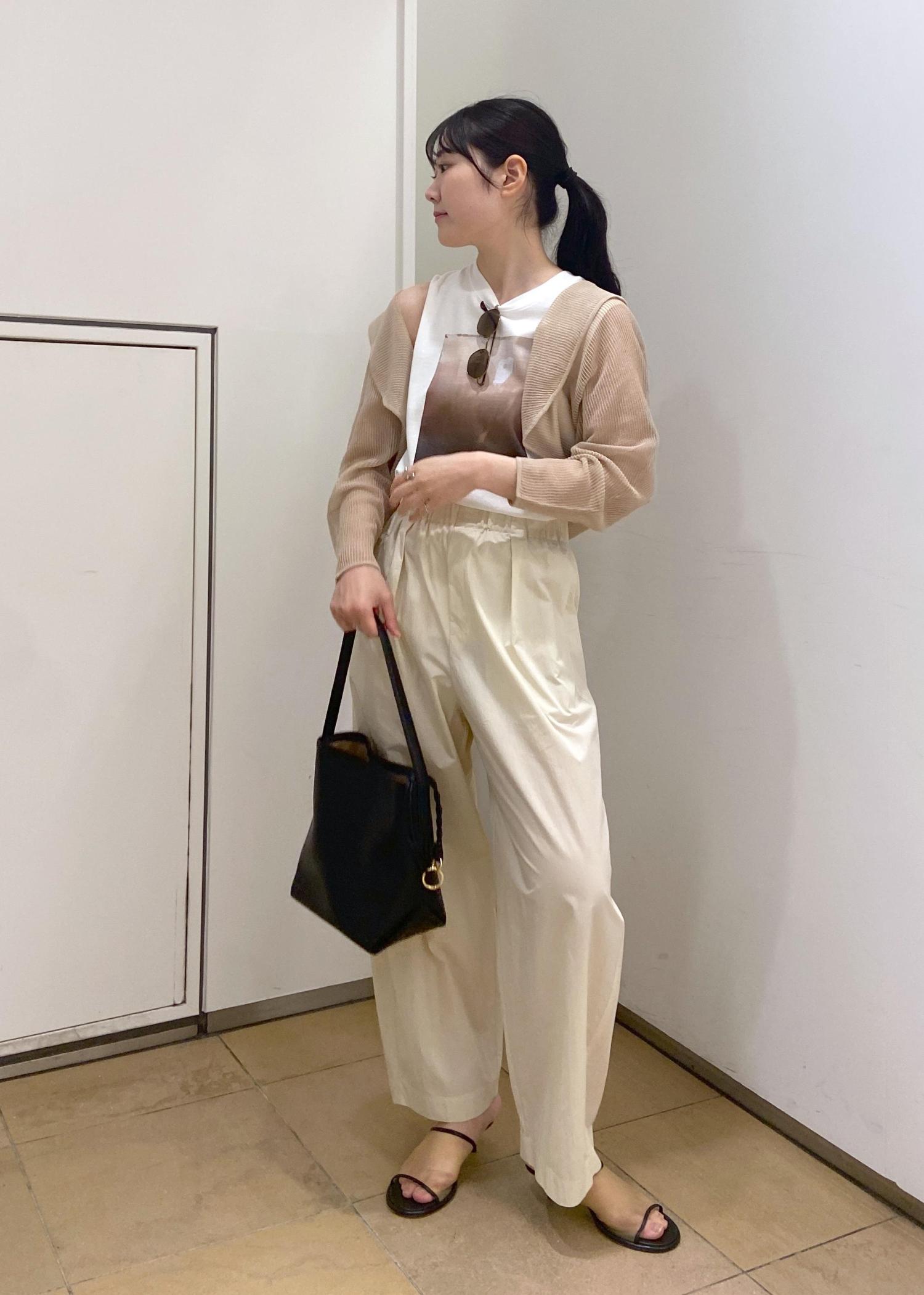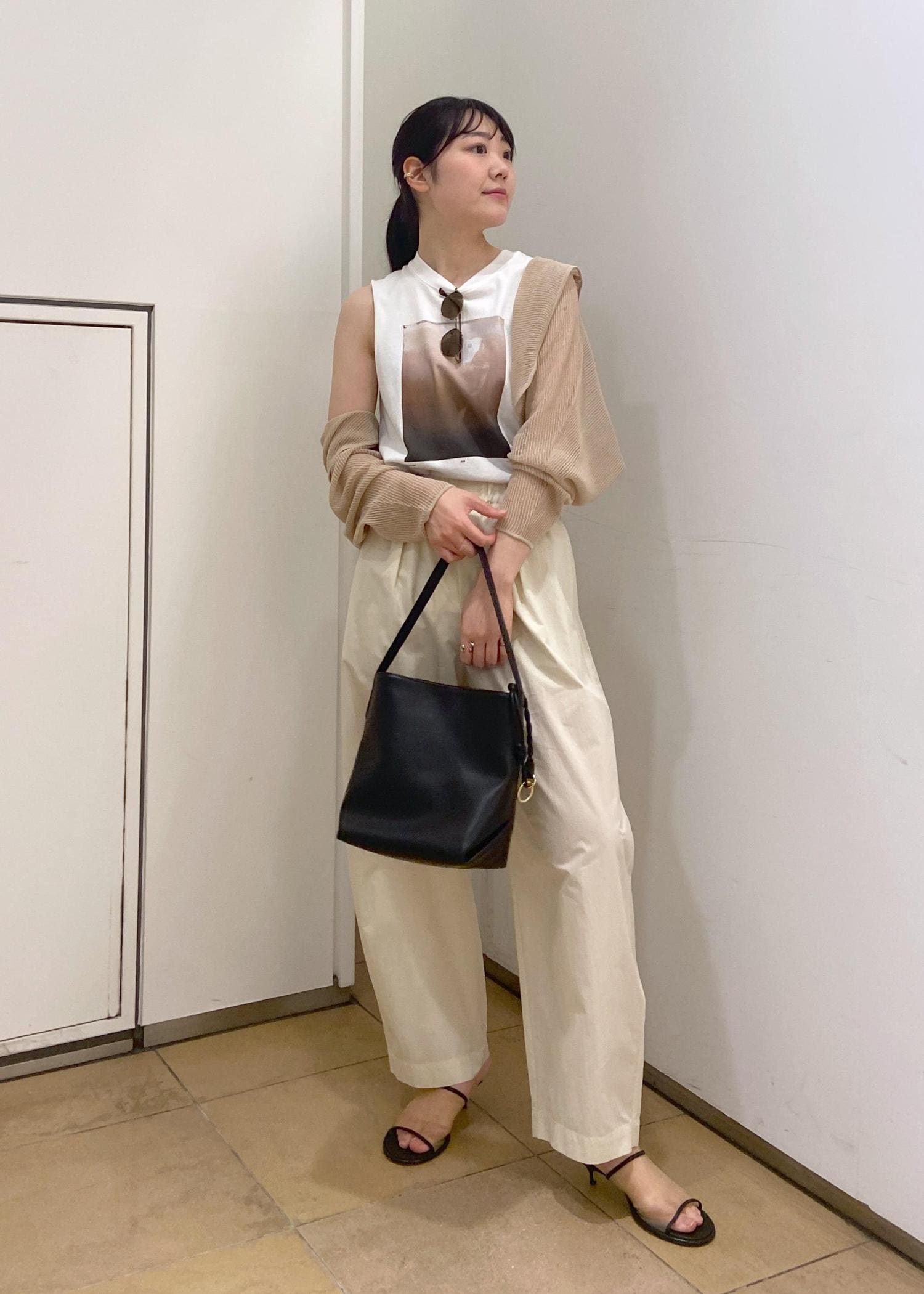 プリントの色味からベージュとブラックのツートーンコーデにしました。
