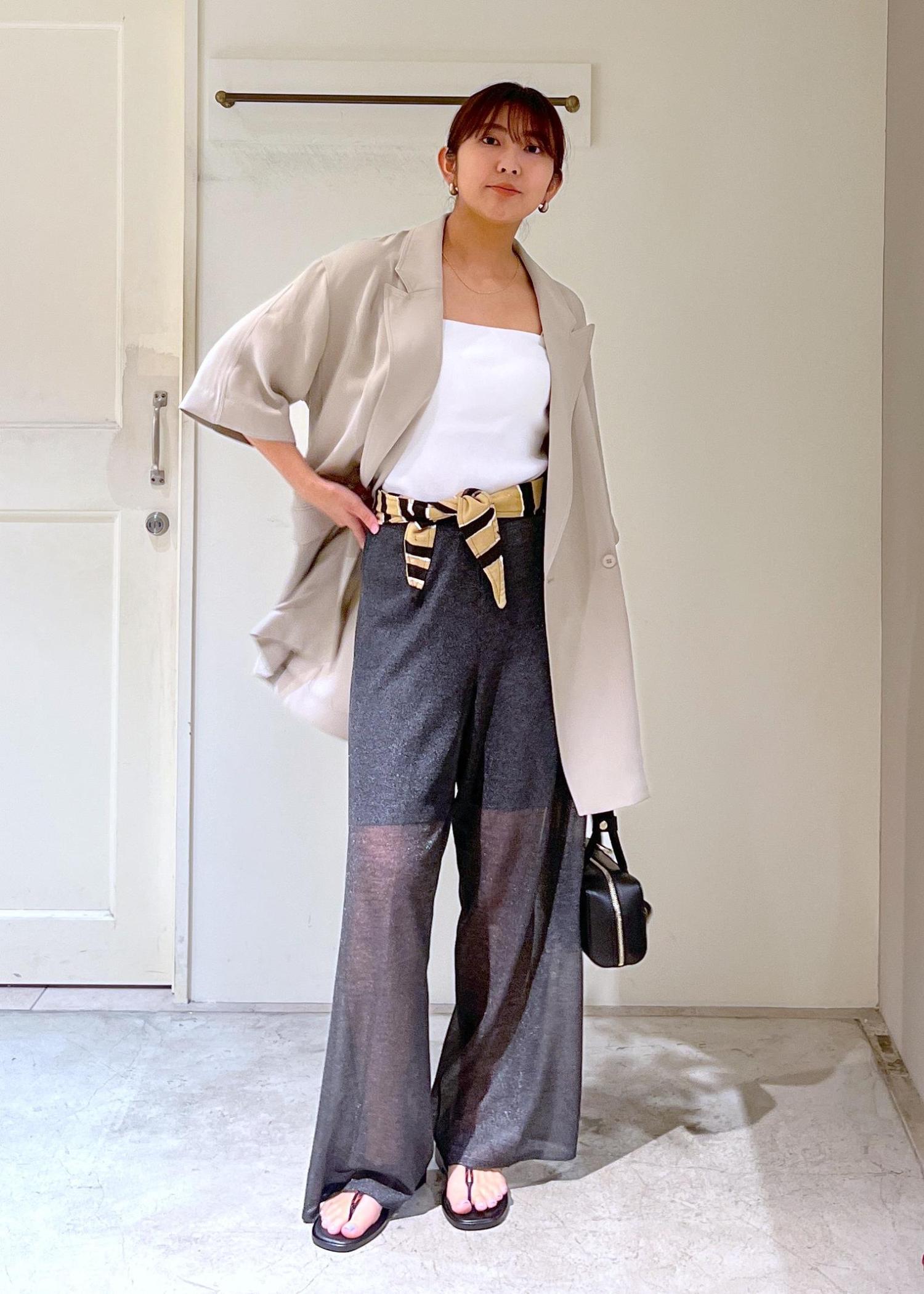 シアー素材でラメが印象的なワイドパンツと合わせて、アクセントにウエストに巻いたスカーフがポイントです。