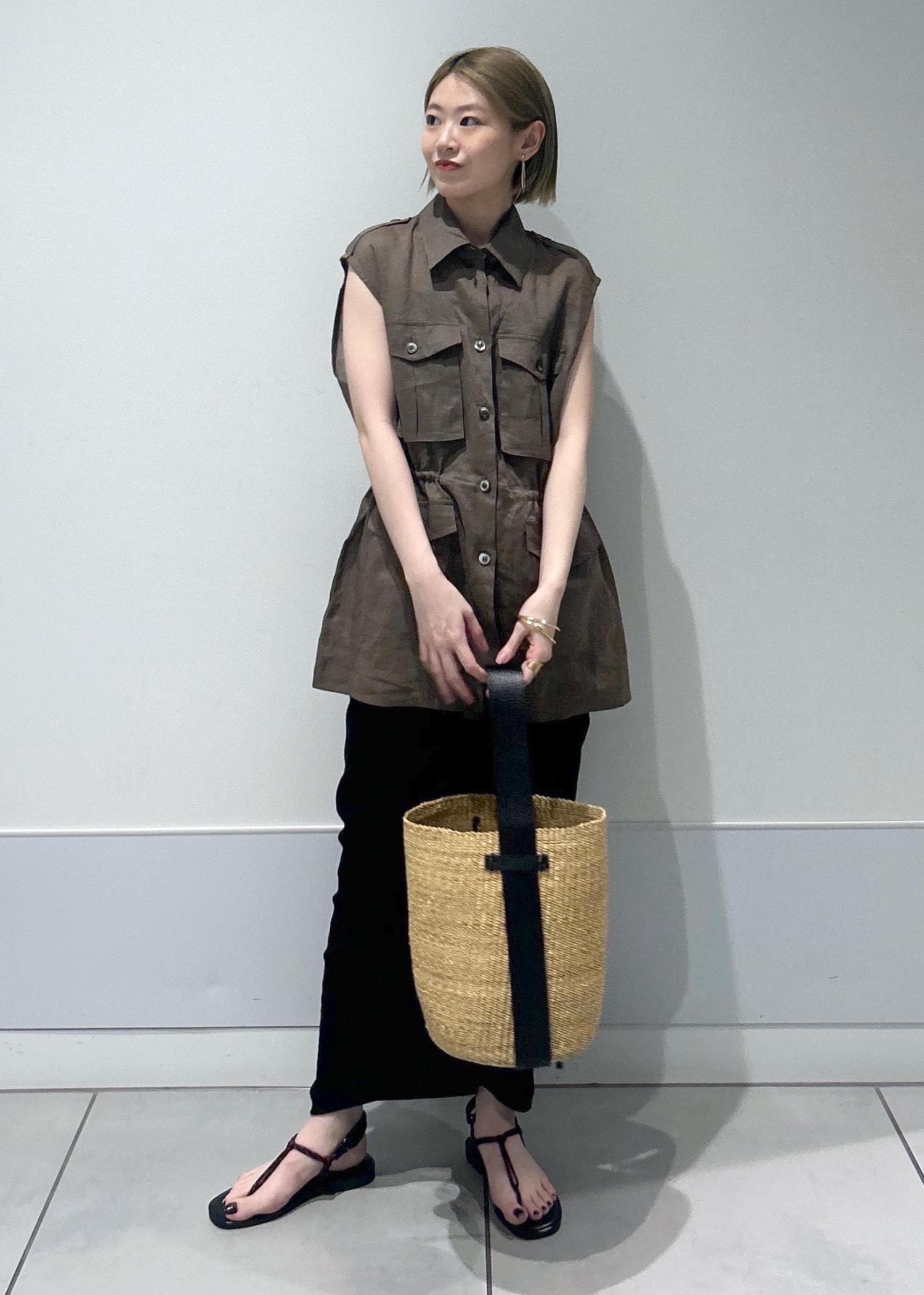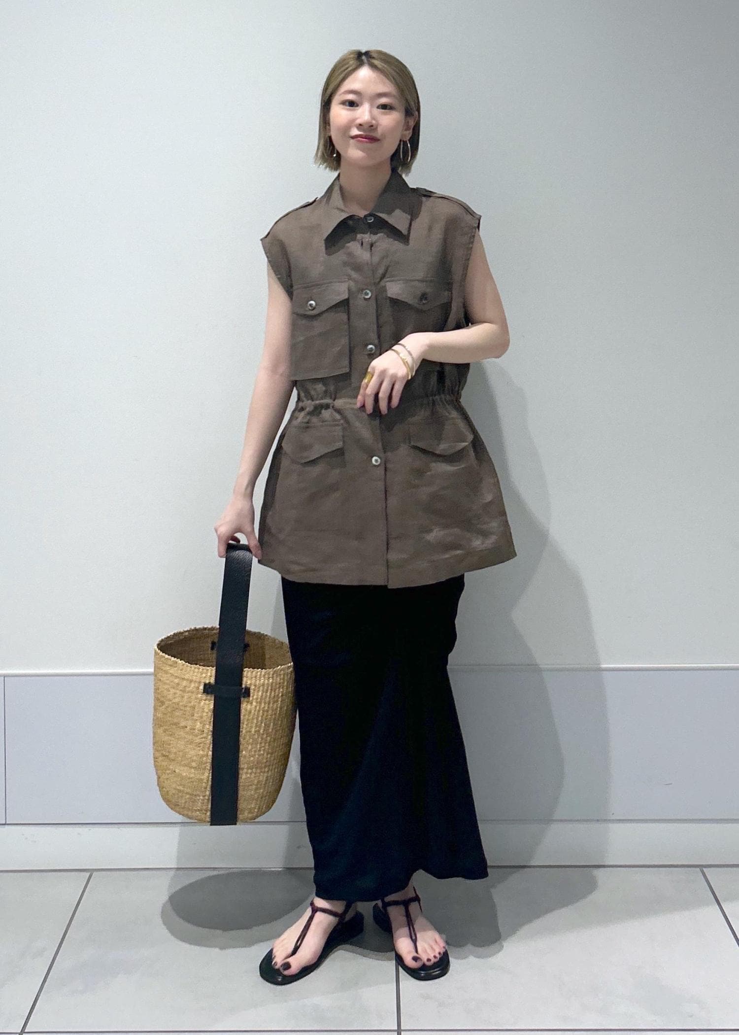 トップスのように着る際は、ウエストはきゅっと絞ってシルエットにメリハリを付けるのがおすすめです!