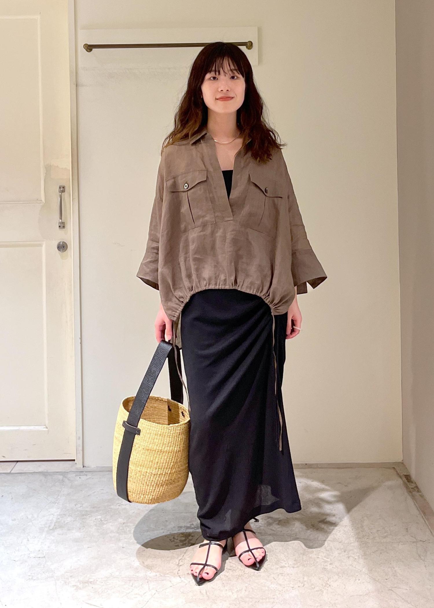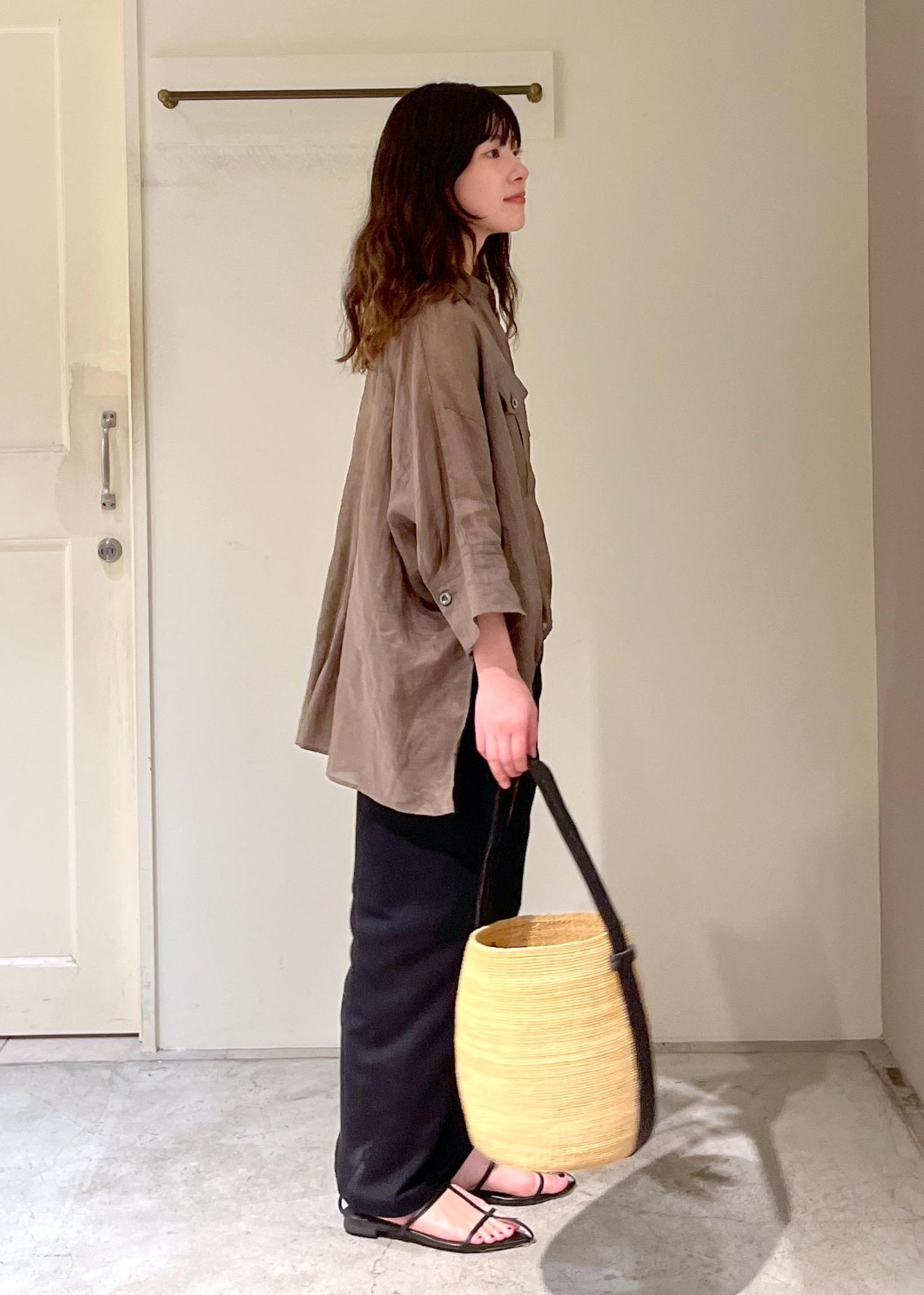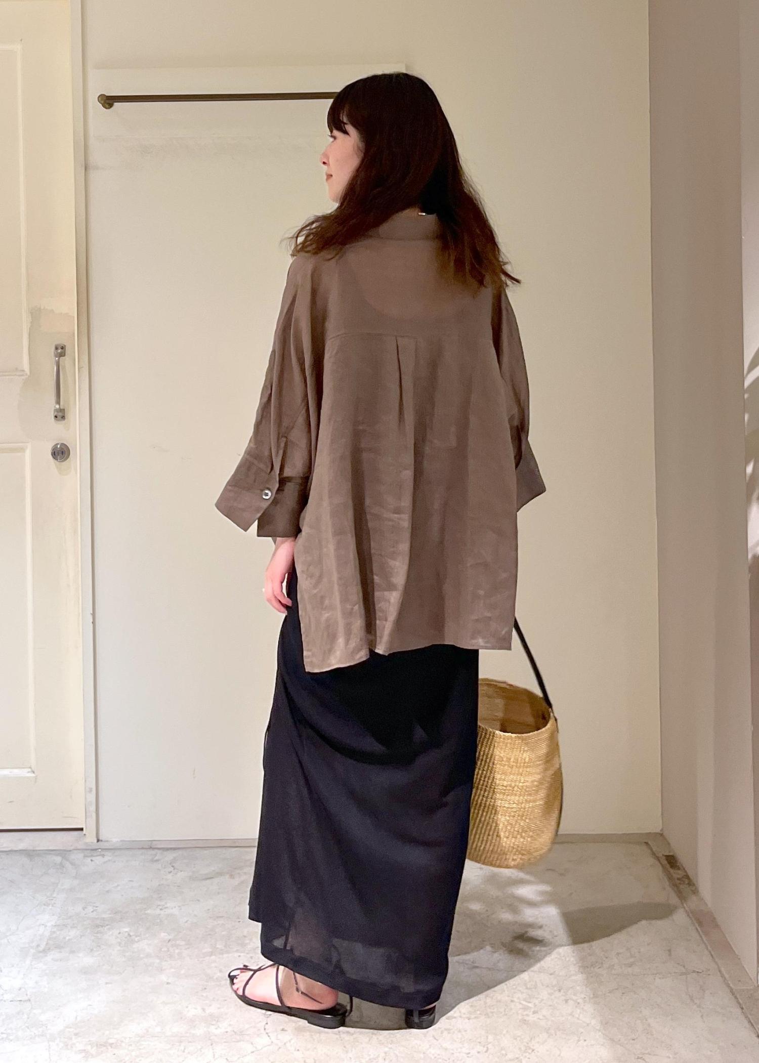 ハリと光沢感のあるリネン素材。ゆったりと着ていただけますが、シルエットの変化が楽しめ、絞るとインしなくてもすっきりとした印象です。 -