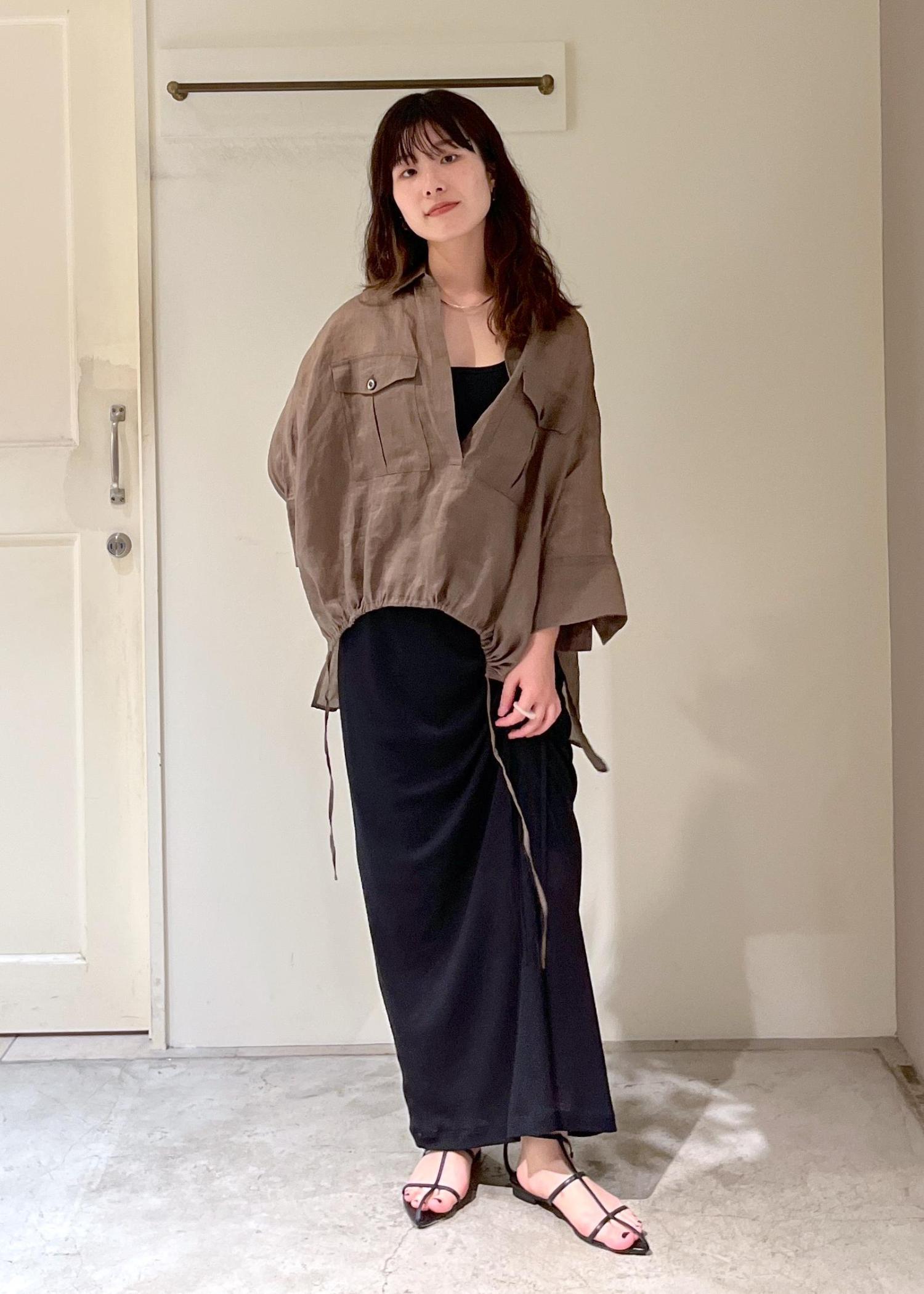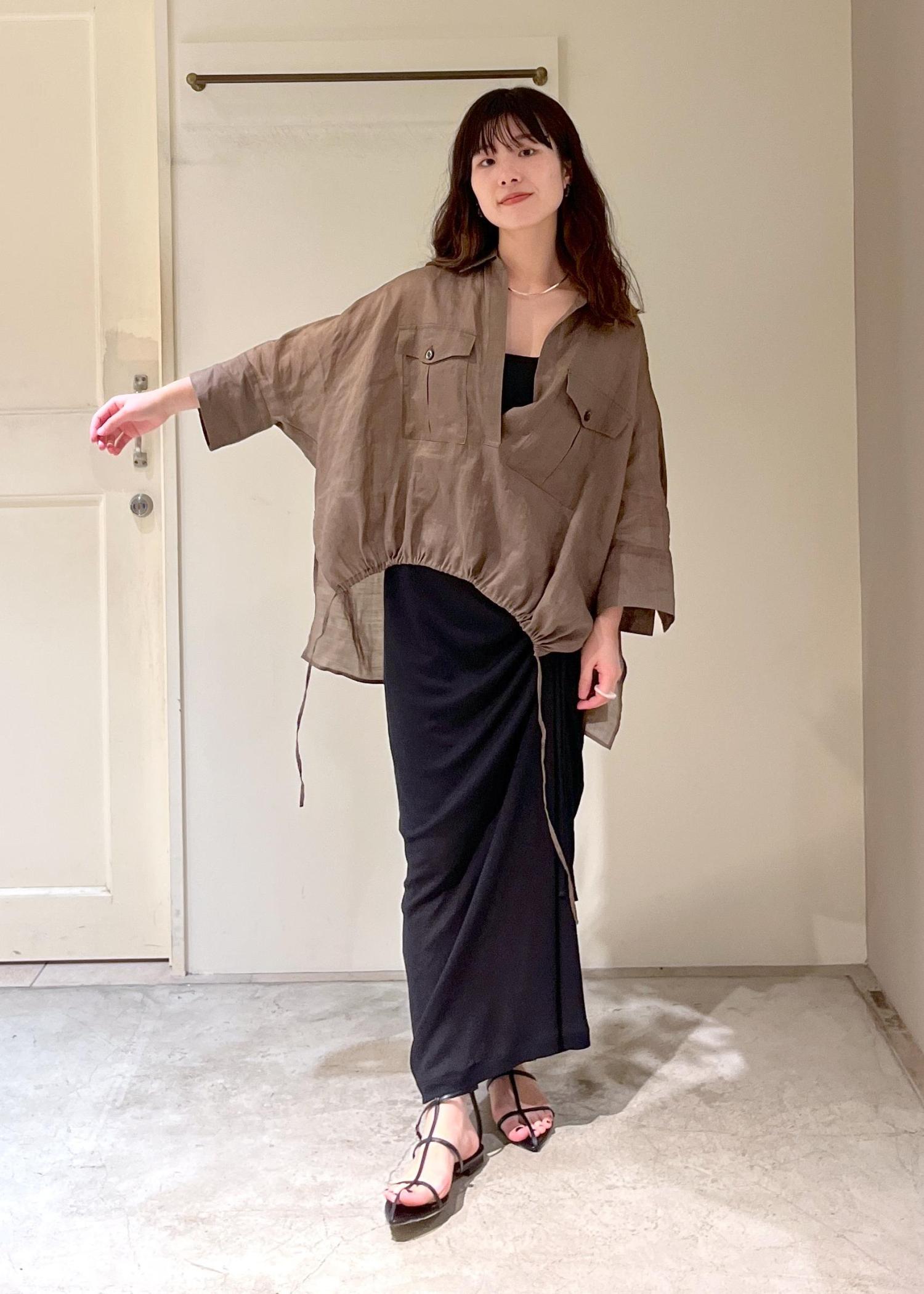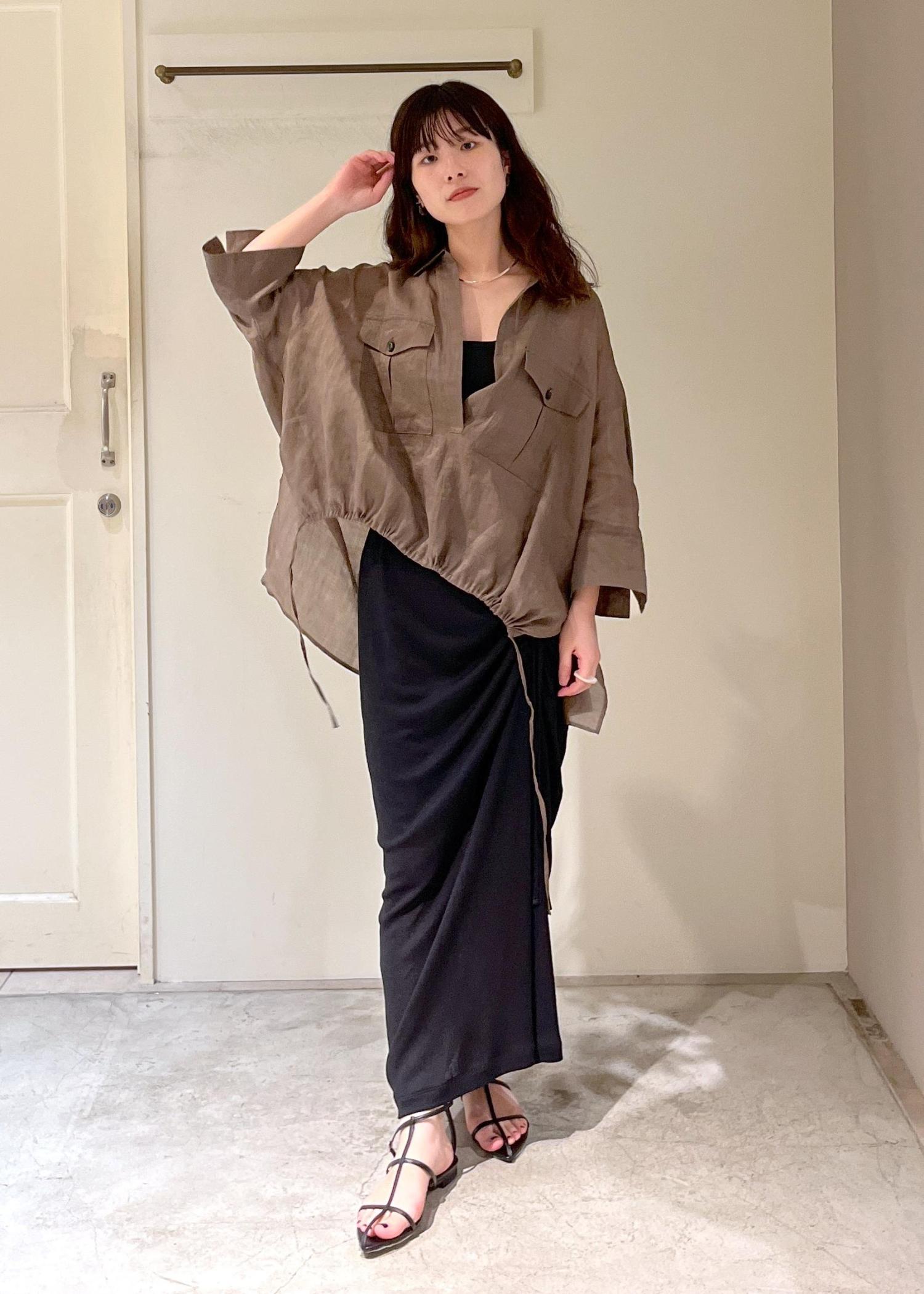 ハリと光沢感のあるリネン素材。ゆったりと着ていただけますが、シルエットの変化が楽しめ、絞るとインしなくてもすっきりとした印象です。 -