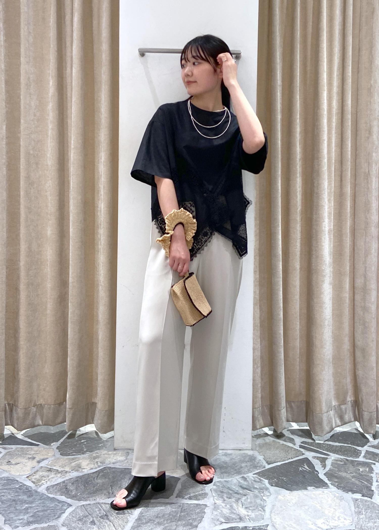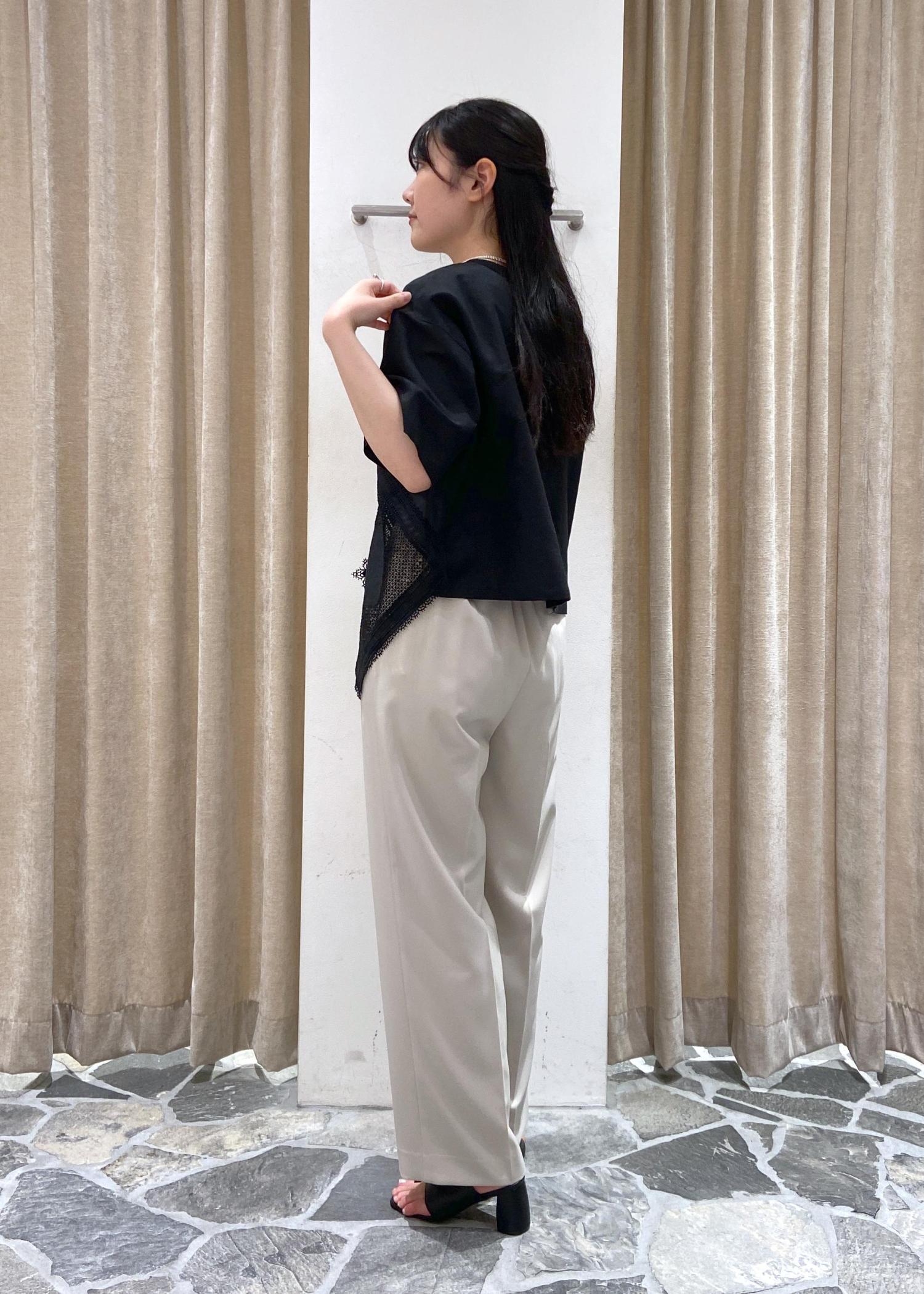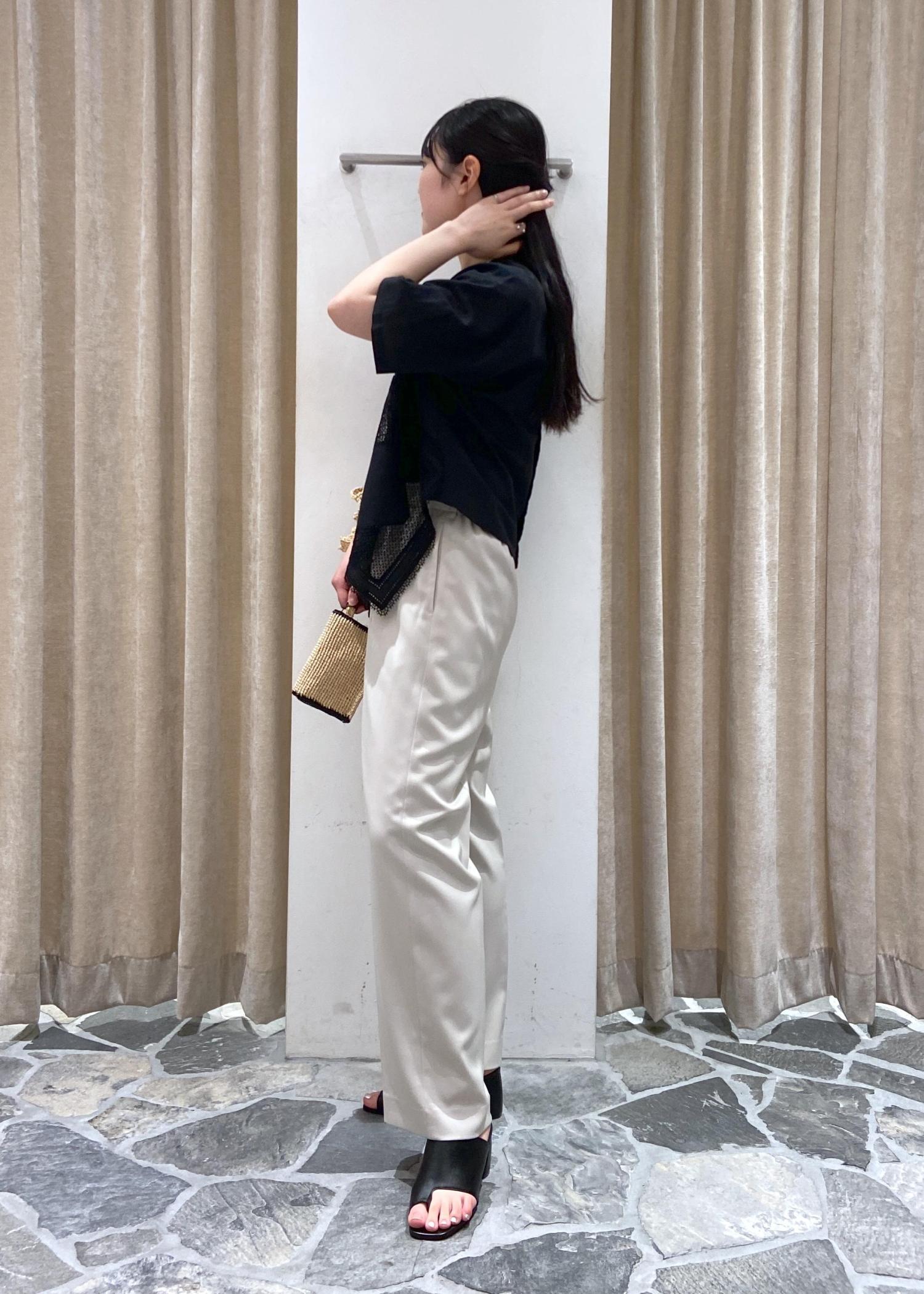 Tシャツのようなデザインなので、パンツはスラックスにヒールをあわせてキレイめカジュアルコーデにしました。