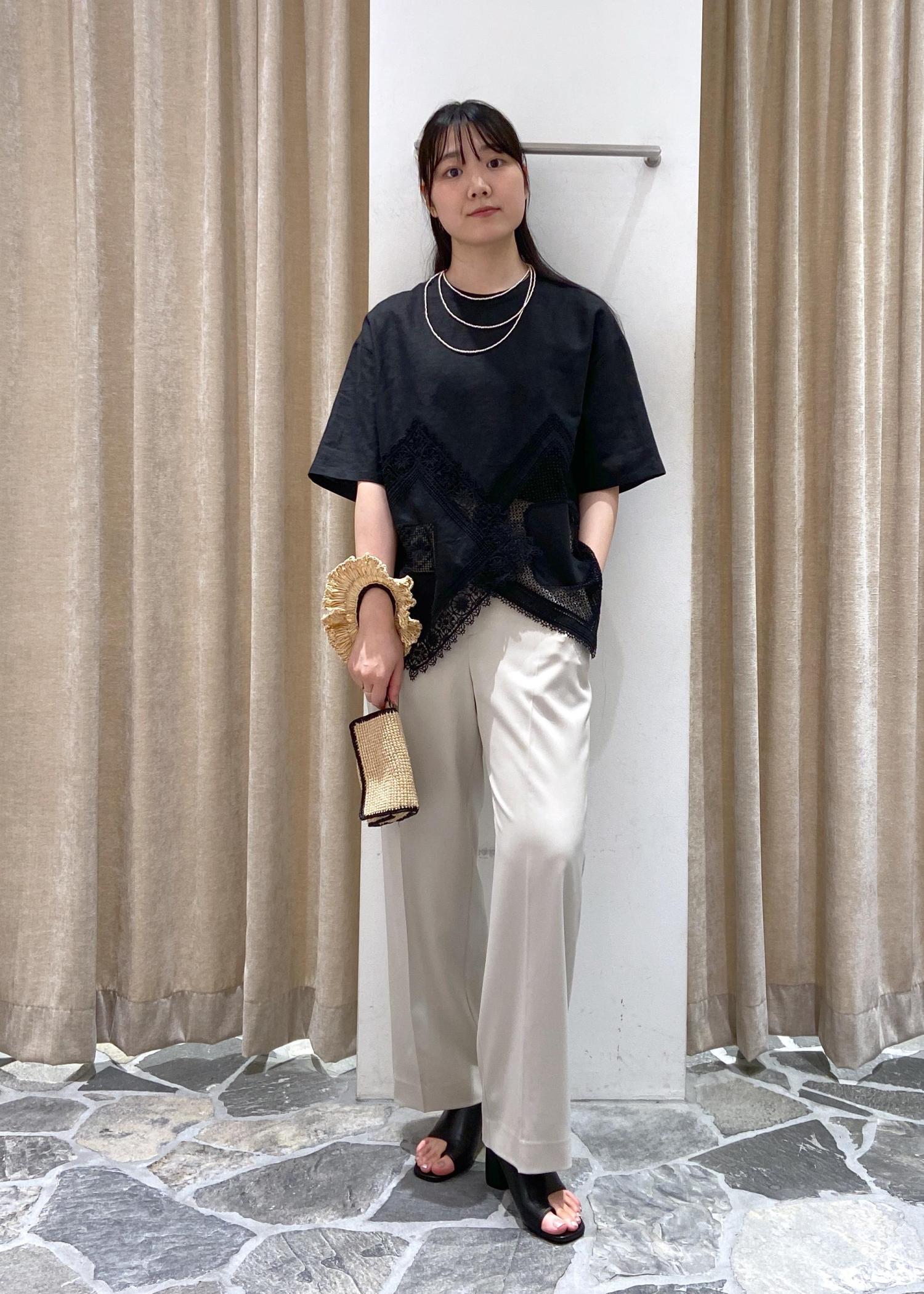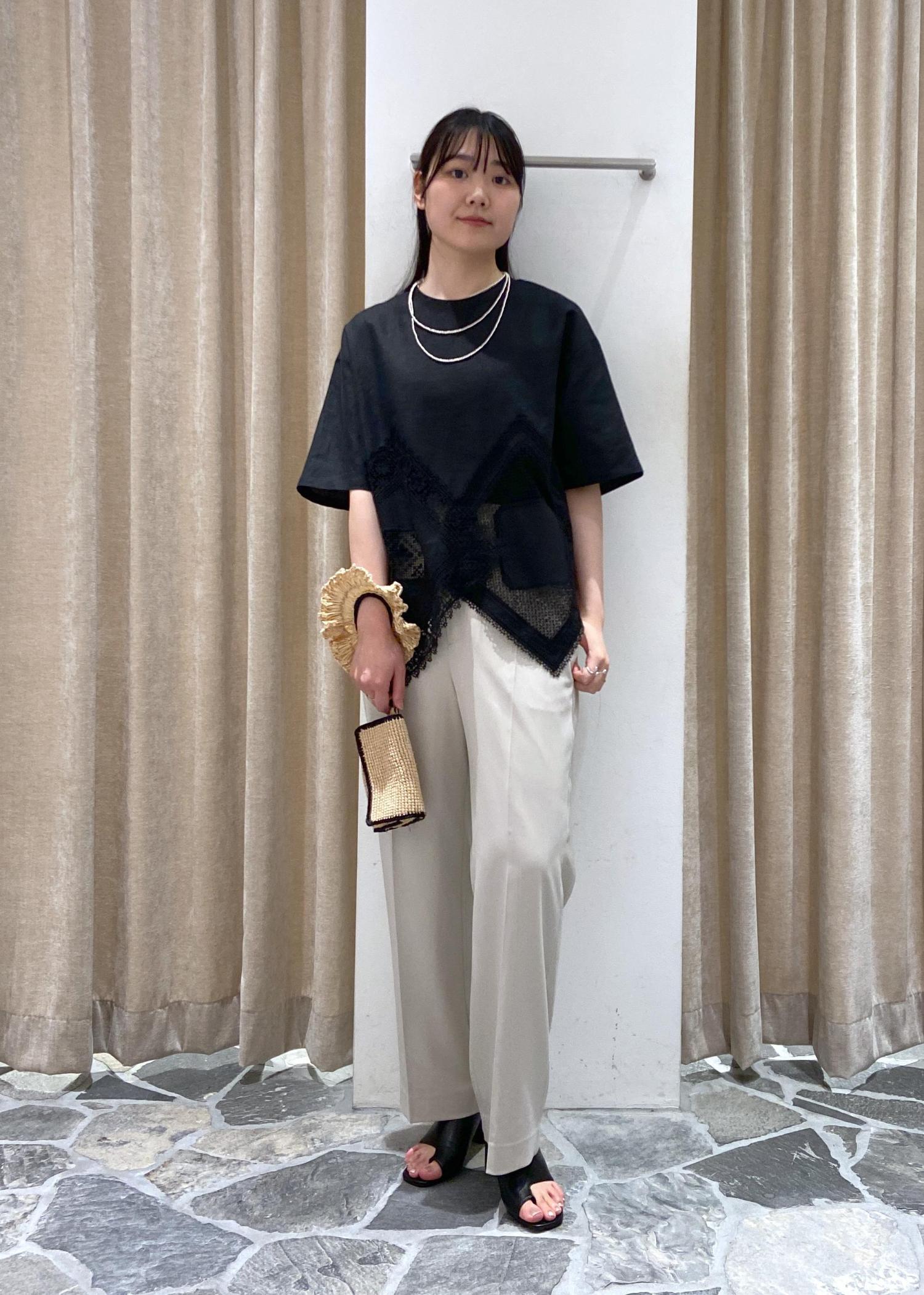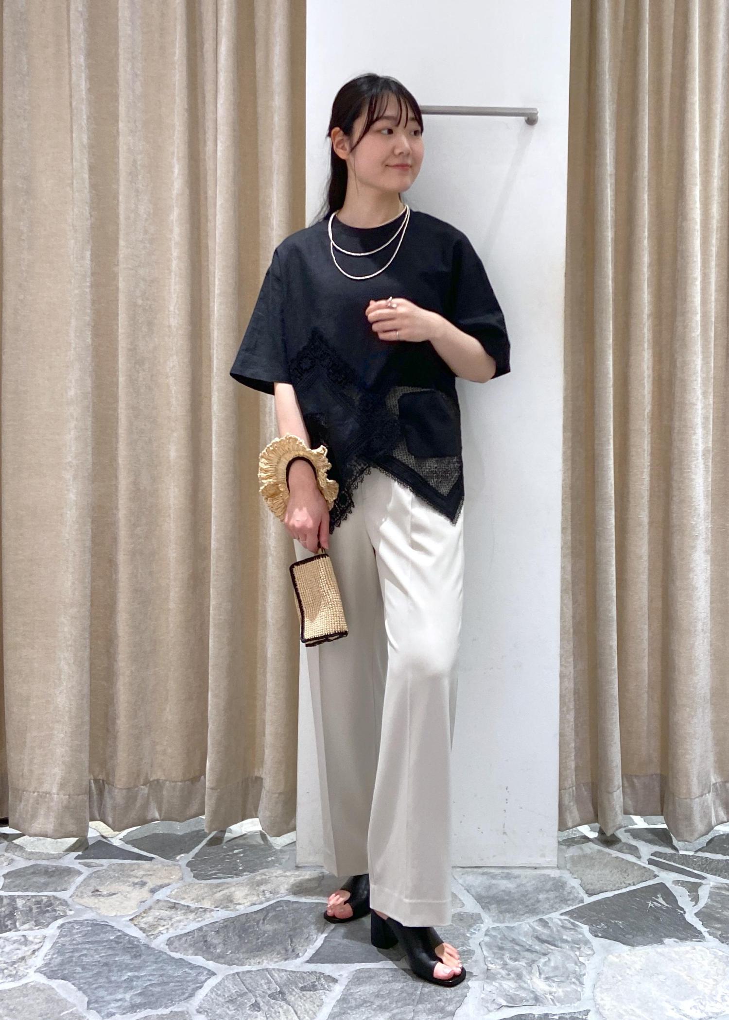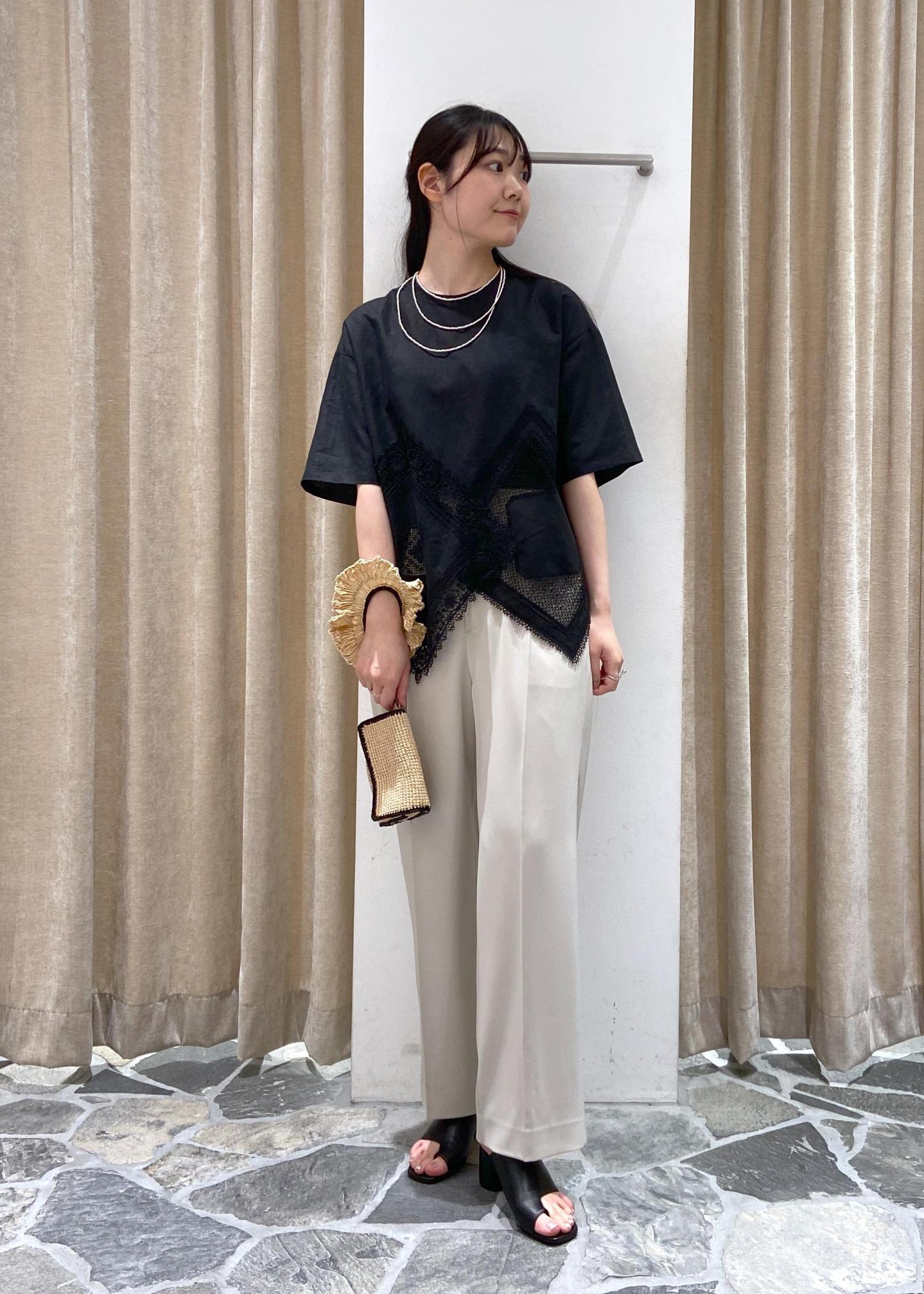 Tシャツのようなデザインなので、パンツはスラックスにヒールをあわせてキレイめカジュアルコーデにしました。
