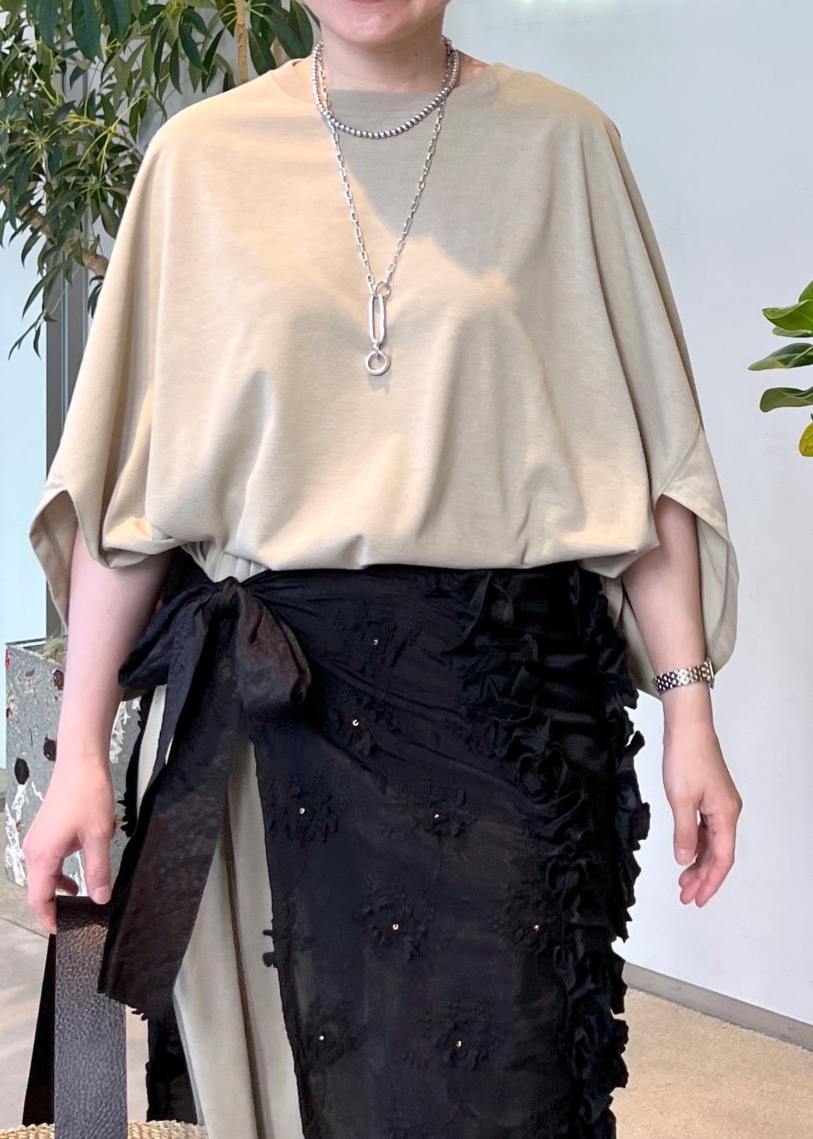 艶感のあるレーヨンシャンタン素材。ほんのりハリもあって凹凸感のあるフリルやレースのデザインが全体に施されているので、1枚でとても華やかなアイテムです。