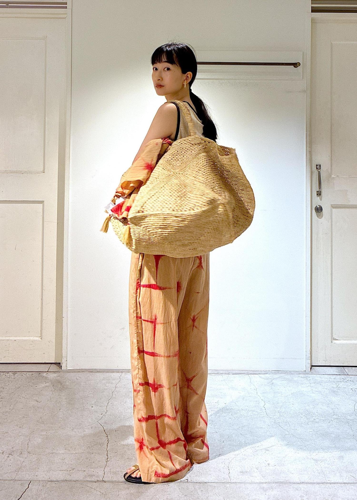 大きなラフィアのバッグにはタイダイスカーフを巻いてみました。