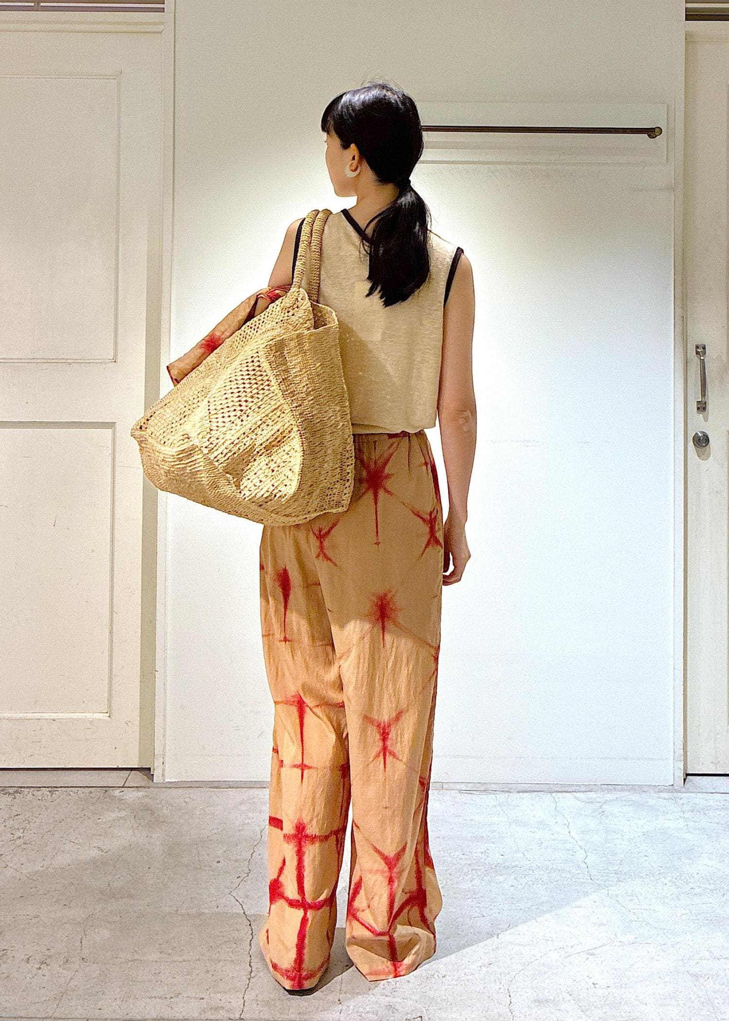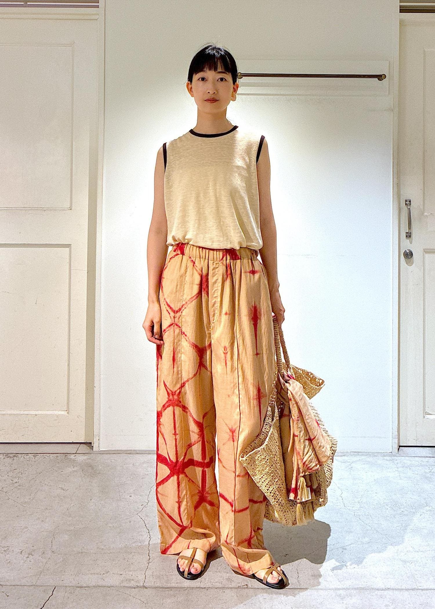 タイダイセットアップのパンツにBATONERのリネンノースリーブを合わせました。