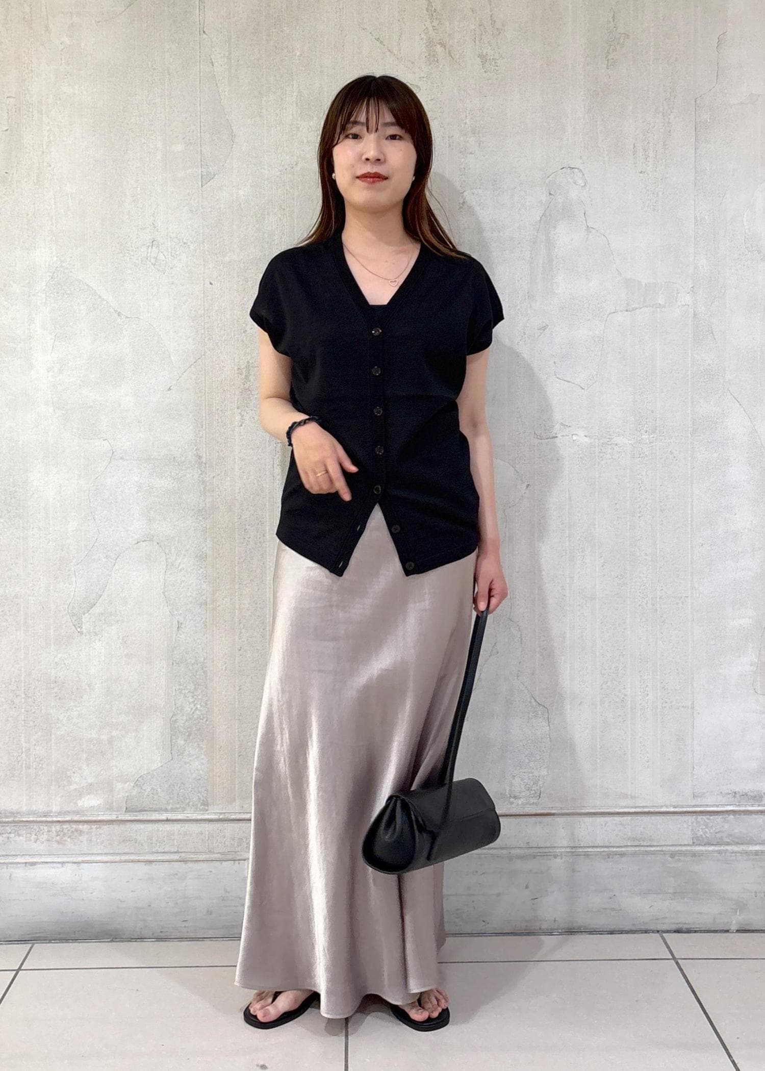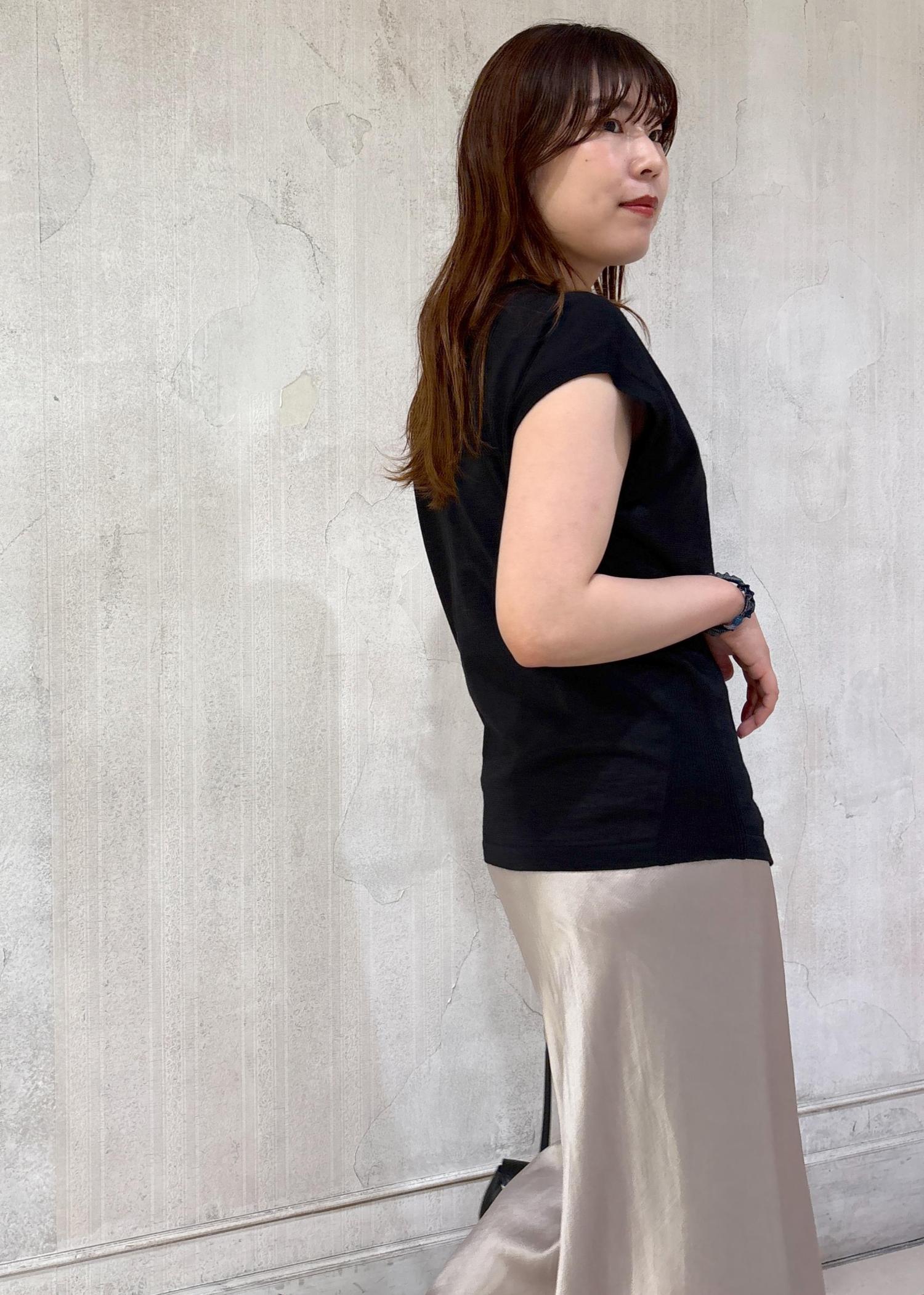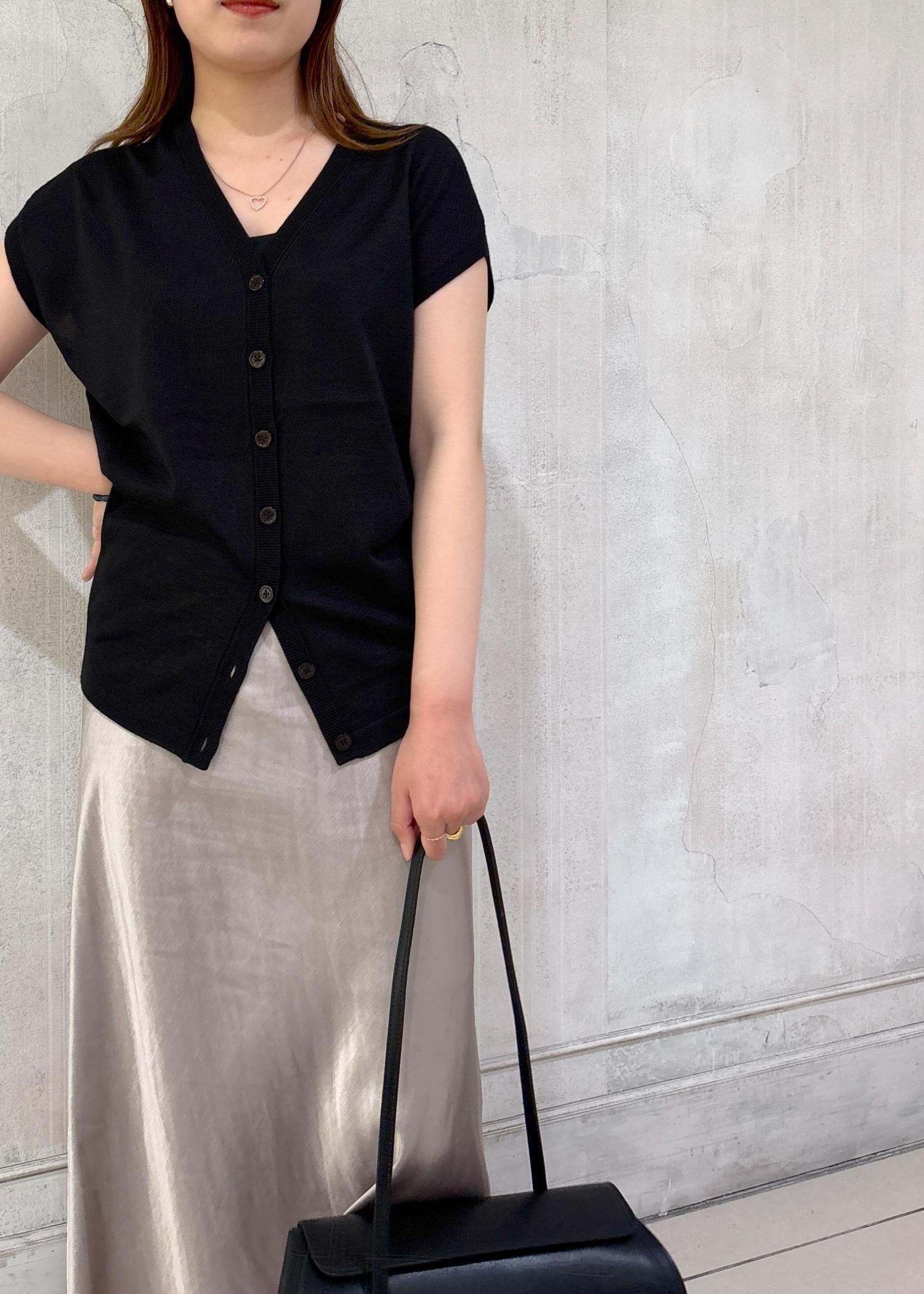 夏は白のトップスを選びがちですが、たまには黒をメインとしたスタイリングもすてきですね◯