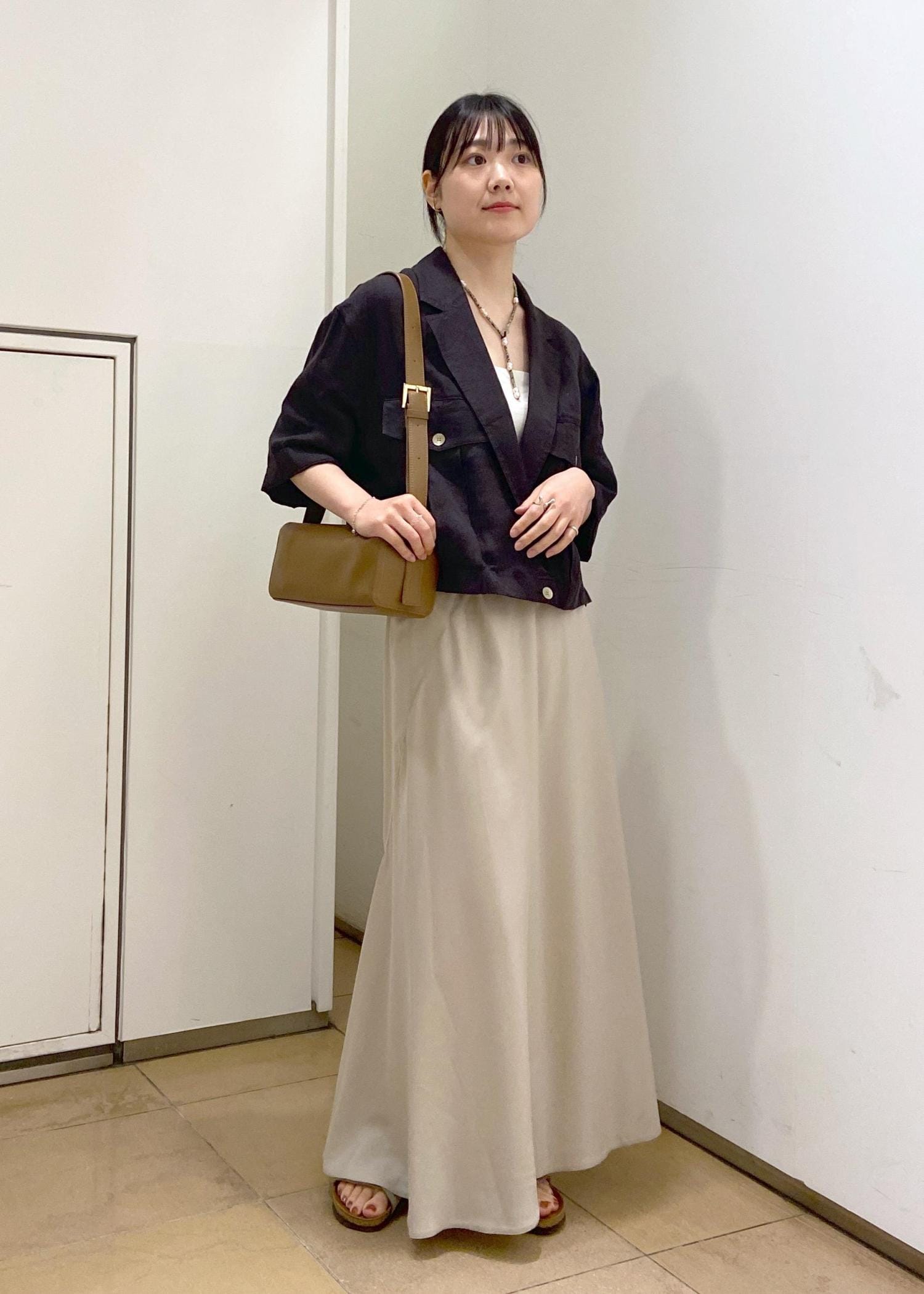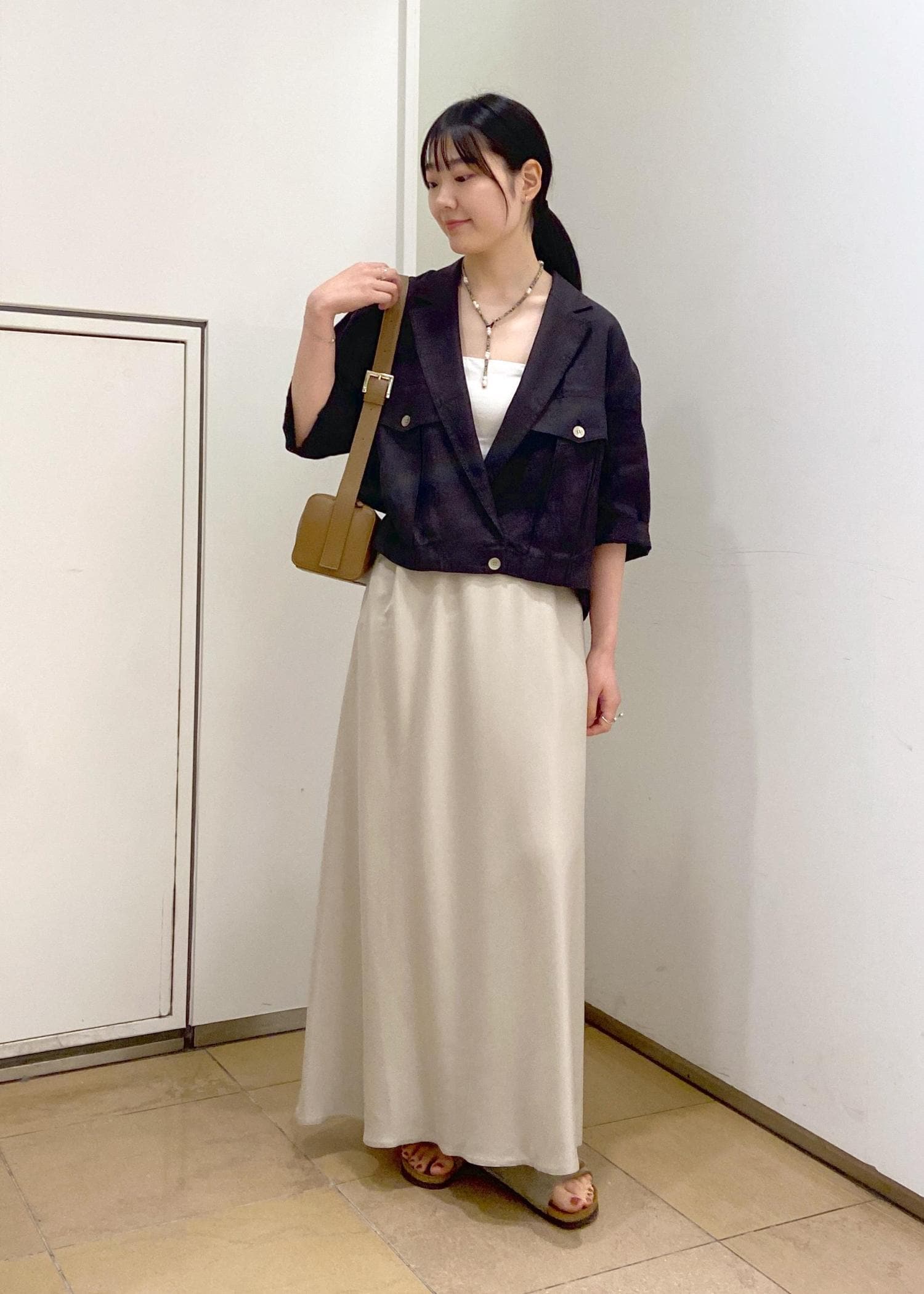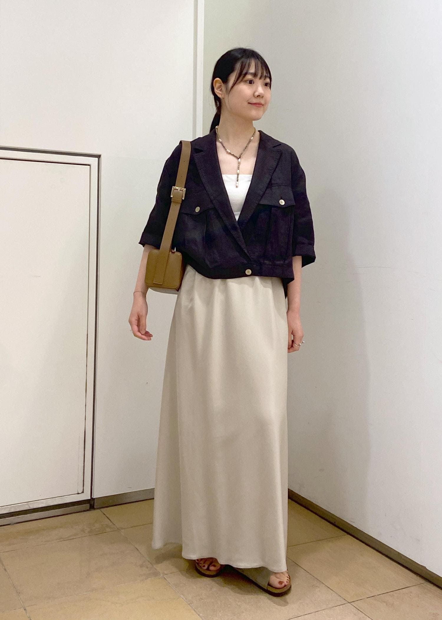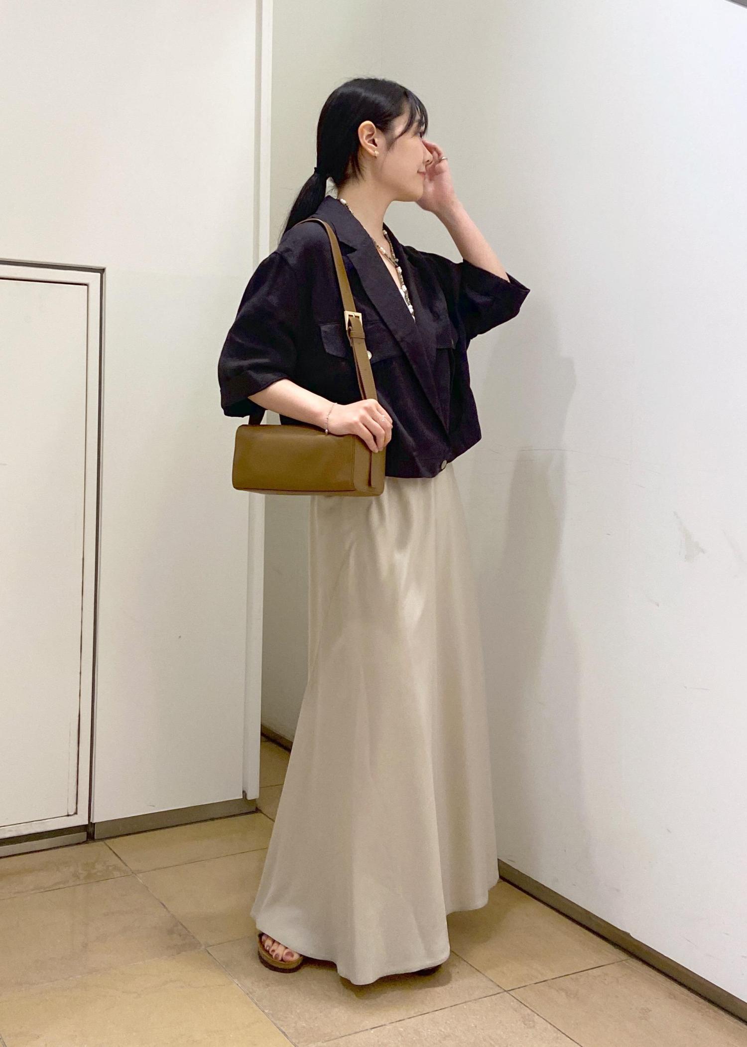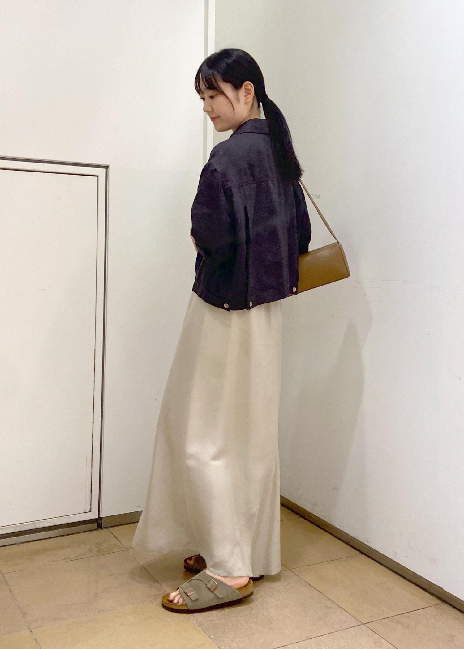 リネン100%のツイルなので、リネンの通気性やさらりとした着心地はありながら、程よく光沢感がありキレイめな印象です。 -