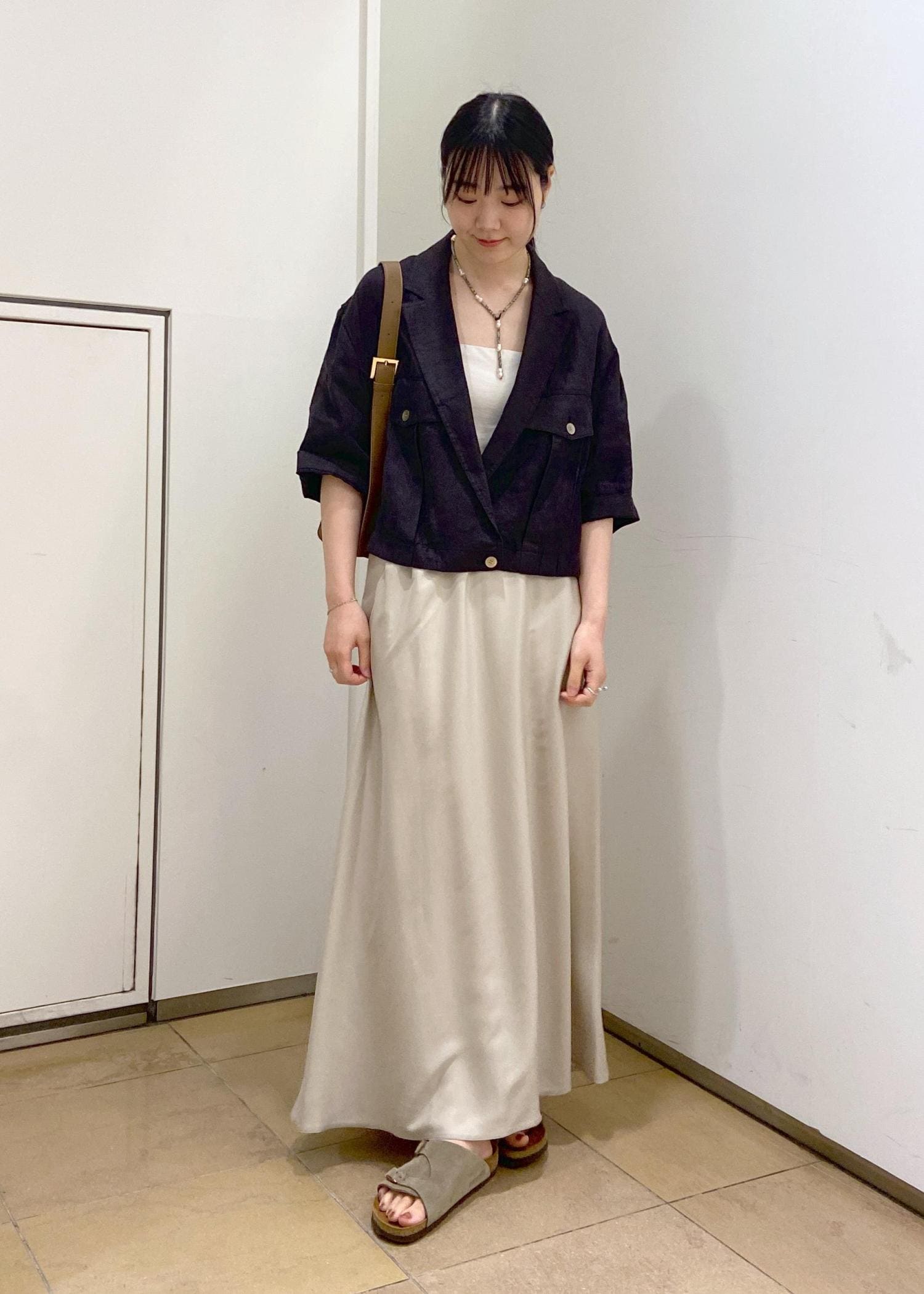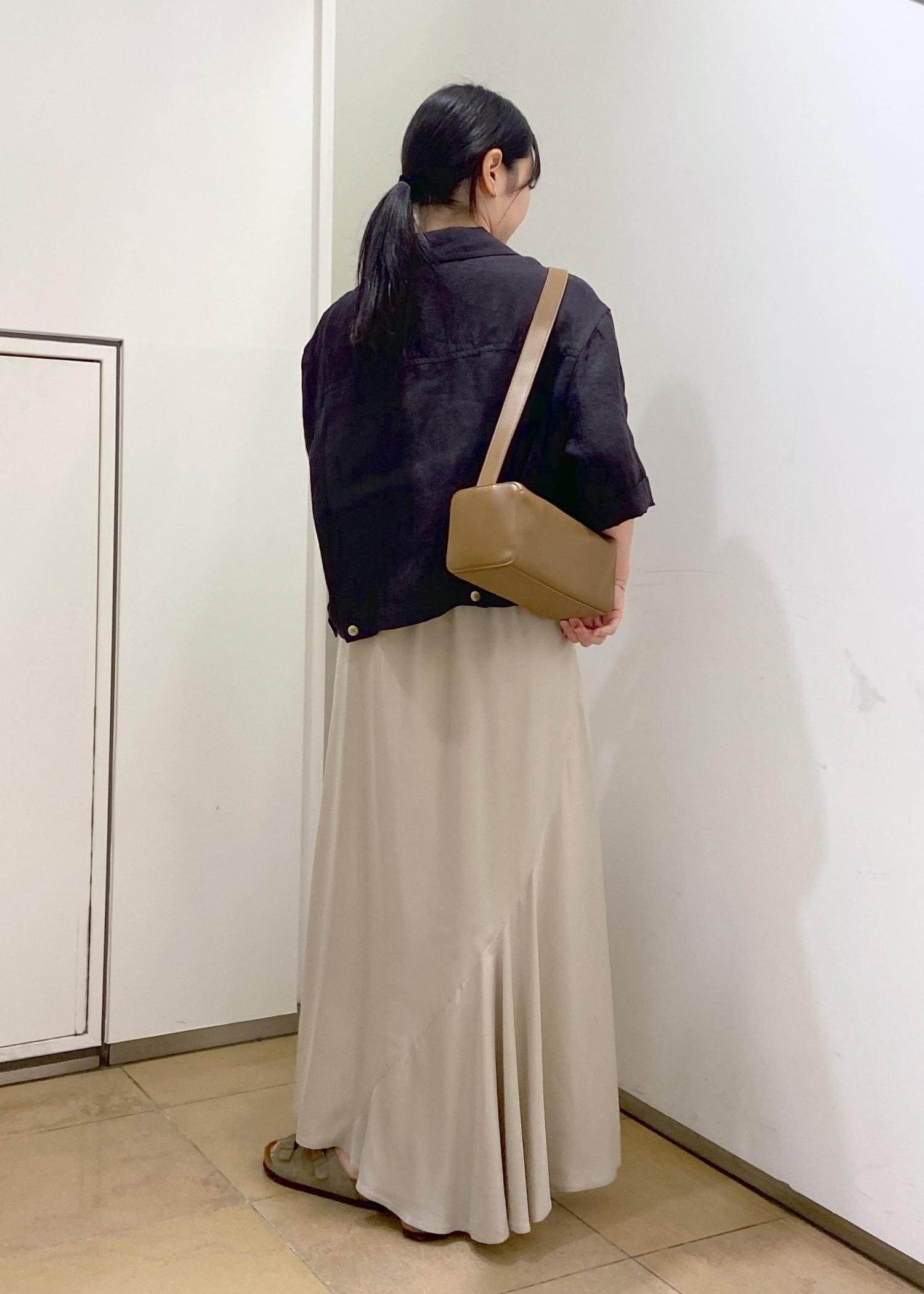 キュプラを使用したツイル素材で、肌離れ良く程よい光沢感があります。フレアシルエットで腰回りはスッキリとしています。 -